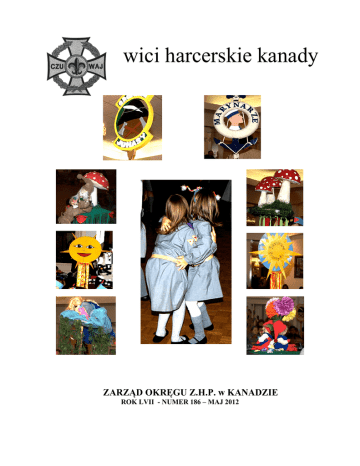 wici harcerskie kanady ZARZĄD OKRĘGU Z.H.P. w KANADZIE ROK LVII - NUMER 186 – MAJ 2012 Dwie Matki Mojej Mamie … Spieczonymi od modlitw ustami po nadziei rozhuśtanej kładce szła powłócząc chorymi nogami matka żeby pokłonić się Matce Oj pogadać jest o czym dziękować z serca w którym i lęk i bezsiła byle Polski i świata Królowa przed oblicze dostojne wpuściła – Zaraz serce rozwiąże jak chustę z której skarb wszystkich łez wydobędzie nie ma w niebie lampionów ni luster które świecą jak matek orędzie – Oczy jednej świętości niesyte oczy drugiej w ból ludzki wrastały – Na kamieniach ostatnich przed szczytem Dwie mateńki do siebie szeptały Marian Stanisław Hermaszewski ZWIĄZEK HARCERSTWA POLSKIEGO, OKRĘG KANADA Polish Scouting Association in Canada L’Associacion des Scouts Polonais au Canada DO CZYTELNIKÓW Po przepełnionej zajęciami zimie i okresie wielkanocnym nadszedł wzbogacający nasze życie miesiąc ---maj. ciepły, radosny, Na majowych nabożeństwach w kościołach i kapliczkach rozległ się śpiew staropolskiej pieśni do Matki Bożej „Chwalcie łąki umajone”. Wszędzie gdzie żyją Polacy uczczono historyczną Konsytuację 3-cio majową. Młodzież harcerska brała gremialnie udział w tych uroczystościach. Również i weterani przyłączali się do obchodów choć ich szeregi maleją. Miłe sercu oczekiwało nas też Święto Matki, które nam przypominało życie spędzone z naszą „matusią” i choć może już od nas odeszła, tego dnia w naszym sercu wzbudziła na nowo uczucie miłości. Uroczystość Zesłania Ducha Świętego czyli „Zielone Świątki” kończą ten szczególnie nam drogi miesiąc. Teraz wiosna, rozkwitająca świeżą zielenią i barwnym kwieciem, namawia na zbiórki i wycieczki na łonie przyrody. A wkrótce – od dawna Akcja Letnia. Życzymy wszystkim wspaniałych przeżyć i słonecznych dni. Chcemy także podzielić się z czytelnikami wiadomością że od następnego numeru „Wici harcerskich Kanady” zajdą pewne zmiany w rozprowadzaniu naszego czasopisma. Czas nieubłaganie idzie na przód a z nim razem poglądy i technologia.. Od przeszło pół wieku Wici były wydawane drukiem. A teraz będą równocześnie wydawane w formie elektronicznej. Obecne wydanie Wici jest ostatnim które będzie wysłane do wszystkich członków.. Mamy nadzieję że Wici na internecie dotrze do wielu więcej osób, nadal jednak będzie drukowane dla tych którzy preferują otrzymywać drukowany egzemplarz. Prosimy o wypełnienie załączonego kwestionariusza w tej sprawie. Już teraz w formie elektronicznej możecie, Drodzy Czytelnicy, oglądać w pięknych kolorach najnowszy numer Wici na http://zhpkanada.org/wici jak i poprzednie wydania zaczynając od maja 2002 roku czyli od numeru 166. Redakcja. WICI Nr. 186 – MAJ – 2012 -1- ZWIĄZEK HARCERSTWA POLSKIEGO, OKRĘG KANADA Polish Scouting Association in Canada L’Associacion des Scouts Polonais au Canada GAWĘDA PRZEWODNICZĄCEJ Drogie Druhny, Drodzy Druhowie Zbliża sie Akcja Letnia harcerska, co dla wielu z nas łączy się z wyjazdem na Kaszuby. W tym roku obchodzimy 60-ta rocznice pierwszego kontaktu harcerstwa w Kanadzie z osadnictwem polskich Kaszubów w okolicach Wilna w Ontario. W1952 roku, Krąg starszo-harcerski “Tatry” był organizatorem i realizatorem I-go Złazu Starszoharcerskiego w Wilnie. Trudno się dziwić że członkowie kręgów jak i cześć grona instruktorskiego która w Złazie uczestniczyła poczuła natychmiastowe przywiązanie do miejsca gdzie potomkowie osadników z Kaszub przybyłych do Kanady prawie sto lat wcześniej potrafili zachować swój język, swoja wiarę i swoje tradycje. W 1954 r. zakupiono teren gdzie wybudowana została stanica “Karpaty”, a kilka lat później, po drugiej stronie jeziora, ośrodek “Bucze”. W miarę gdy powstawały drużyny i szczepy w różnych miastach, liczba obozów się zwiększała. W latach 60-tych obozy i kolonie trwały najczęściej 4 tygodnie. Na ogół obozy odbywały się na terenach prywatnych, gdzie urządzenia były dość prymitywne. Wspólne pokonywanie trudności, życie na łonie natury, i wzajemne oddziaływanie w grupie rówieśników to idealne warunki na odkrywanie i rozwijanie własnych talentów i na tworzenie przyjaźni. Przez kolonie i obozy na Kaszubach przeszło kilkadziesiąt tysięcy zuchów, harcerek i harcerzy. Jeżeli dodamy do tej liczby rodziców którzy przywozili i przywożą lub odwiedzają swoje pociechy, istnieje bardzo liczna grupa która czuje związek z tym zaczarowanym miejscem. Niektórzy pozostali w harcerstwie i biorą udział w obozach harcerskich w roli instruktorskiej lub opiekuńczej. Inni kupili działki i domki letnie żeby co roku spędzać czas pośród jezior, lasów i harcerskich pieśni i okrzyków. Co roku tez spotyka się tych, którzy po wielu latach przerwy wracają by własnym dzieciom i rodzinom pokazać i dać przeżyć to miejsce, które ma dla nich szczególne znaczenie. Życzę Wam wszystkim żeby tegoroczny obóz – czy to na Kaszubach czy w innym miejscu zapisał się w Waszych pamięciach jako przeżycie które zainspiruje Was do życia po harcersku ….zawsze i wszędzie. Czuwaj, Krystyna Reitmeier, hm Przewodnicząca Zarządu Okręgu -2- WICI Nr. 186 – MAJ – 2012 GAWĘDA KAPELANA Ostatnio zastanawiałem się na dużym wpływem tak zwanych „portali społecznościowych„ typu Facebook, LinkedIn, Twitter lub YouTube. Czy to nie prawda że przy pomocy witryn internetowych możemy nawiązać kontakty z osobami z różnych krajów, a nawet i kontynentów? Kilka miesięcy temu, na Dzień Myśli Braterskiej, harcerze i harcerki z całego świata nagrali krótki film z piosenką w którym każdą zwrotkę śpiewała jednostka... z innego kącika kuli ziemskiej. Jestem pewny że portale społecznościowe odegrały niemałą rolę w realizacji tego sympatycznego projektu. Przez krąg „Facebookowych przyj