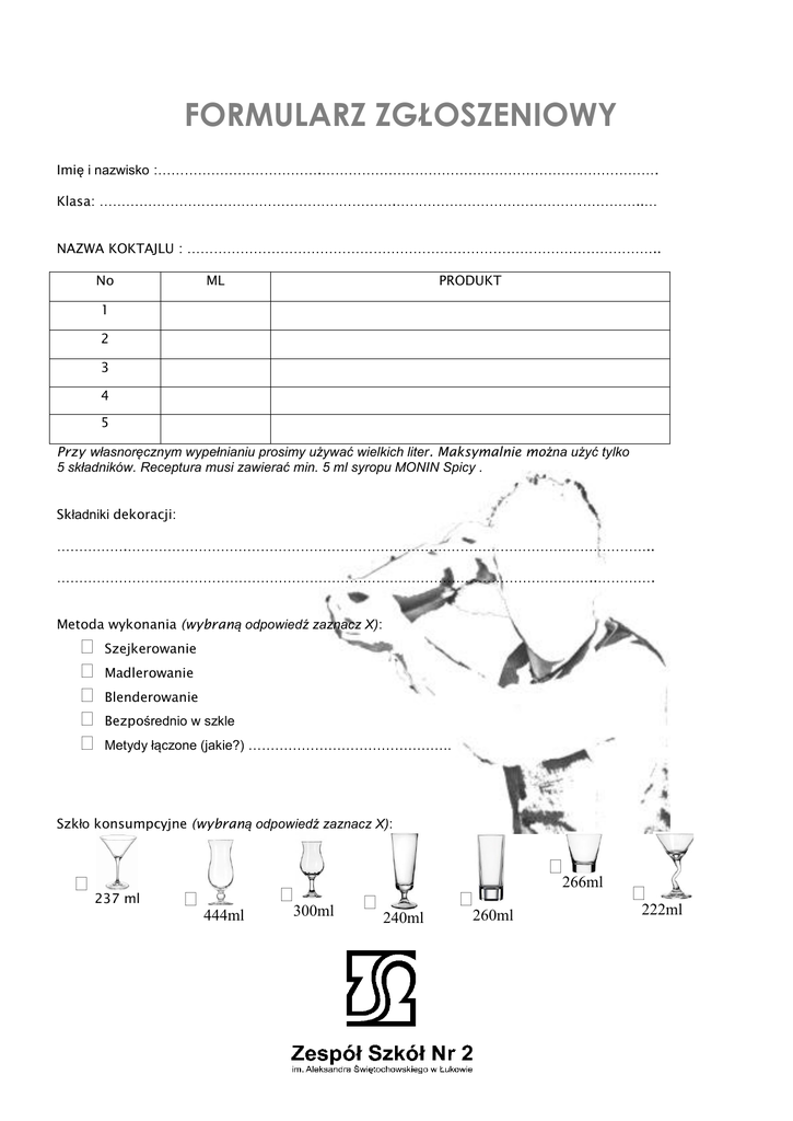 FORMULARZ ZGŁOSZENIOWY Imię i nazwisko :……………………………….…………………………………………………………………. Klasa: ………………………………………………………….………………………………………………..… NAZWA KOKTAJLU : …………………………………………………………………………………………….. No ML PRODUKT 1 2 3 4 5 Przy własnoręcznym wypełnianiu prosimy używać wielkich liter. Maksymalnie można użyć tylko 5 składników. Receptura musi zawierać min. 5 ml syropu MONIN Spicy . Składniki dekoracji: …………….……………………………………………………………………………………………………….. …………………………………………………………………………………………………………..…………. Metoda wykonania (wybraną odpowiedź zaznacz X): Szejkerowanie Madlerowanie Blenderowanie Bezpośrednio w szkle Metydy łączone (jakie?) ………………………………………. Szkło konsumpcyjne (wybraną odpowiedź zaznacz X): 237 ml 444ml 300ml 240ml 260ml 266ml 222ml