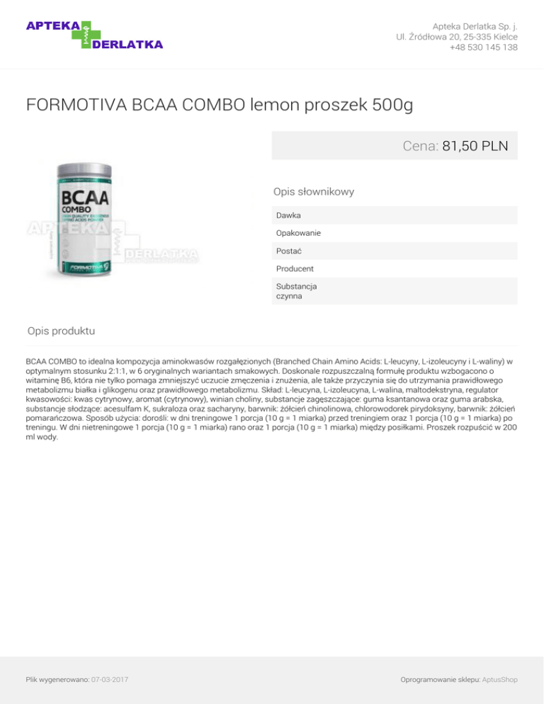 Apteka Derlatka Sp. j. Ul. Źródłowa 20, 25-335 Kielce +48 530 145 138 FORMOTIVA BCAA COMBO lemon proszek 500g Cena: 81,50 PLN Opis słownikowy Dawka Opakowanie Postać Producent Substancja czynna Opis produktu BCAA COMBO to idealna kompozycja aminokwasów rozgałęzionych (Branched Chain Amino Acids: L-leucyny, L-izoleucyny i L-waliny) w optymalnym stosunku 2:1:1, w 6 oryginalnych wariantach smakowych. Doskonale rozpuszczalną formułę produktu wzbogacono o witaminę B6, która nie tylko pomaga zmniejszyć uczucie zmęczenia i znużenia, ale także przyczynia się do utrzymania prawidłowego metabolizmu białka i glikogenu oraz prawidłowego metabolizmu. Skład: L-leucyna, L-izoleucyna, L-walina, maltodekstryna, regulator kwasowości: kwas cytrynowy, aromat (cytrynowy), winian choliny, substancje zagęszczające: guma ksantanowa oraz guma arabska, substancje słodzące: acesulfam K, sukraloza oraz sacharyny, barwnik: żółcień chinolinowa, chlorowodorek pirydoksyny, barwnik: żółcień pomarańczowa. Sposób użycia: dorośli: w dni treningowe 1 porcja (10 g = 1 miarka) przed treningiem oraz 1 porcja (10 g = 1 miarka) po treningu. W dni nietreningowe 1 porcja (10 g = 1 miarka) rano oraz 1 porcja (10 g = 1 miarka) między posiłkami. Proszek rozpuścić w 200 ml wody. Plik wygenerowano: 07-03-2017 Powered by TCPDF (www.tcpdf.org) Oprogramowanie sklepu: AptusShop
