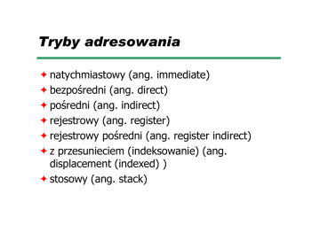 Tryby adresowania ✦ natychmiastowy (ang. immediate) ✦ bezpośredni (ang. direct) ✦ pośredni (ang. indirect) ✦ rejestrowy (ang. register) ✦ rejestrowy pośredni (ang. register indirect) ✦ z przesunieciem (indeksowanie) (ang. displacement (indexed) ) ✦ stosowy (ang. stack) Rozszerzalne kody operacji (przykład) ✦ Komputer – rozkazy 16b, adresy 4b (rejestrowe) ✦ może być max 16 rozkazów trójadresowych ✦ Możemy jednak nadać kodowi 1111 specjalne znaczenie ✦ jeśli 1111 1111 1111 – to 16 rozkazów bezadresowych ✦ od 1111 1111 1111 0000 do 1111 1111 1111 1111 ✦ jeśli 1111 1110 lub 1111 1111 – to 31 rozkazów jednoadresowych ( bo 1111 1111 1111 to rozkaz mniejadresowy) ✦ od 1111 1111 1110 0000 do 1111 1111 1110 1111 i 1111 1111 0000 do 1111 1111 1110 ✦ jeśli 1111 – to 14 rozkazów dwuadresowych ( bo 1111 1110 oraz 1111 1111 to rozkazy mniejadresowe) ✦ od 1111 0000 do 1111 1101 ✦ jeśli nie 1111 to 15 rozkazów trójadresowych ( bo 1111 to rozkazy mniejadresowe) ✦ od 0000 do 1110 ✦ razem 15+14+31+16 = 76 kodów operacji (o 60 więcej) Adresowanie natychmiastowe ✦ Argument (ang. operand) jest częścią rozkazu ✦ A – zawartość pola adresowego w rozkazie ✦ Operand = A ✦ np. ADD 5 ✦ dodaj 5 do zawartości akumulatora ✦ 5 jest argumentem ✦ Nie ma odniesienia do pamięci w celu pobrania argumentu ✦ Zaoszczędzony jeden cykl pamięci ✦ Wielkość operandu ograniczona przez rozmiar pola adresowego Rozkaz Opcode Operand Adresowanie bezpośrednie ✦ Pole adresowe zawiera adres operandu ✦ EA - efektywny adres (ang. effective address ) lokacji zawierający odniesiony argument ✦ EA = A ✦ np. ADD A ✦ dodaj zawartość komórki A do akumulatora ✦ pod adresem A znajduje się operand ✦ Jedno odniesienie do pamięci ✦ Nie są potrzebne dodatkowe obliczenia ✦ Zakres adresacji ograniczony przez wielkość pola adresowego (słowo - opcode) Adresowanie bezpośrednie (c.d.) Rozkaz Opcode Adres A Pamięć Operand Adresowanie pośrednie ✦ Pole adresowe odnosi się do słowa w pamięci, które zawiera pełnej długości adres argumentu ✦ (X) – zawartość lokacji X (rejestr lub adres pamięci) ✦ EA = (A) ✦ znajdź A, znajdź adres (A) pod którym jest operand ✦ np. ADD (A) ✦ dodaj zawarość komórki pamięci wyznaczonej przez zawartość pod adresem A do akumulatora ✦ Większa przestrzeń adresowa: 2n gdzie n = długość słowa ✦ Może być zagnieżdżone (ang. nested, multilevel, cascaded) ✦ np. EA = (((A))) ✦ Zad. Narysuj diagram ✦ Wiele odniesień do pamięci głównej w celu pobrania argumentu (dlatego wolne) Adresowanie pośrednie (c.d.) Rozkaz Opcode Adres A Pamięć Wskaźnik operandu Operand Adresowanie rejestrowe ✦ Operand znajduje się w rejestrze określonym w polu adresowym ✦ EA = R ✦ Ograniczona liczba rejestrów (32) ✦ Małe pole adresowe (zwykle 3 do 5 bitów) ✦ krótsze rozkazy i czas pobrania z rejestru ✦ Ograniczona przestrzeń adresowa Adresowanie rejestrowe (c.d.) Rozkaz Opcode Adres rejestru R Rejestr Operand Pośrednie adresowanie rejestrowe ✦ Adres w rejestrze odnosi się do słowa w pamięci, które zawiera adres operandu ✦ EA = (R) ✦ Operand jest w komórce pamięci wskazanej przez adres zawarty w rejestrze R ✦ Duża przestrzeń adresowa (2n) ✦ O jedno odniesienie do pamięci mniej niż przy adresowaniu pośrednim Pośrednie adresowanie rejestrowe (c.d.) Rozkaz Opcode Adres rejestru R Pamięć Rejestry Wskaźnik operandu Operand Adresowanie z przesunięciem ✦ EA = A + (R) ✦ Pole adresowe zawiera dwie wartości ✦ A = wartość bazowa ✦ R = rejestr zawierający przesunięcie ✦ lub odwrotnie ✦ Najczęstsze zastosowania ✦ adresowanie względne (ang. relative addressing) ✦ adresowanie z rejestrem podstawowym (ang. base-register addressing) ✦ indeksowanie (ang. indexed addressing) Adresowanie z przesunięciem (c.d.) Rozkaz Opcode Rejestr R Adres A Pamięć Rejestry Wskaźnik operandu + Operand Adresowanie z przesunięciem (c.d.) ✦ adresowanie względne ✦ R = licznik programu, PC ✦ EA = A + (PC) ✦ zgodność z zasadą lokalności odniesień (np. w pamięci podręcznej) ✦ adresowanie z rejestrem podstawowym ✦ A zawiera przesunięcie a R adres bazowy ✦ R może zawierać adres bezpośredni lub pośredni ✦ np. rejestry segmentowe w 80x86 ✦ zgodność z zasadą lokalności odniesień Adresowanie z przesunięciem (c.d.) ✦ indeksowanie ✦ A = adres bazowy, R = przesuniecie ✦ EA = A + R ✦ adresowanie dobre dla tablic: EA = A + R; R++ ✦ autoindeksowanie: EA = A + (R); (R) <- (R) + 1 ✦ kombinacje ✦ indeksowanie wtórne (ang. postindex): EA = (A) + (R) ✦ indeksowanie wstępne (ang. preindex): EA= (A + (R)) Adresowanie stosowe ✦ Operand znajduje się na wierzchołku stosu wskazanym przez rejestr ✦ np. ADD ✦ Usuń (POP) dwa wierzchołkowe elementy stosu i dodaj