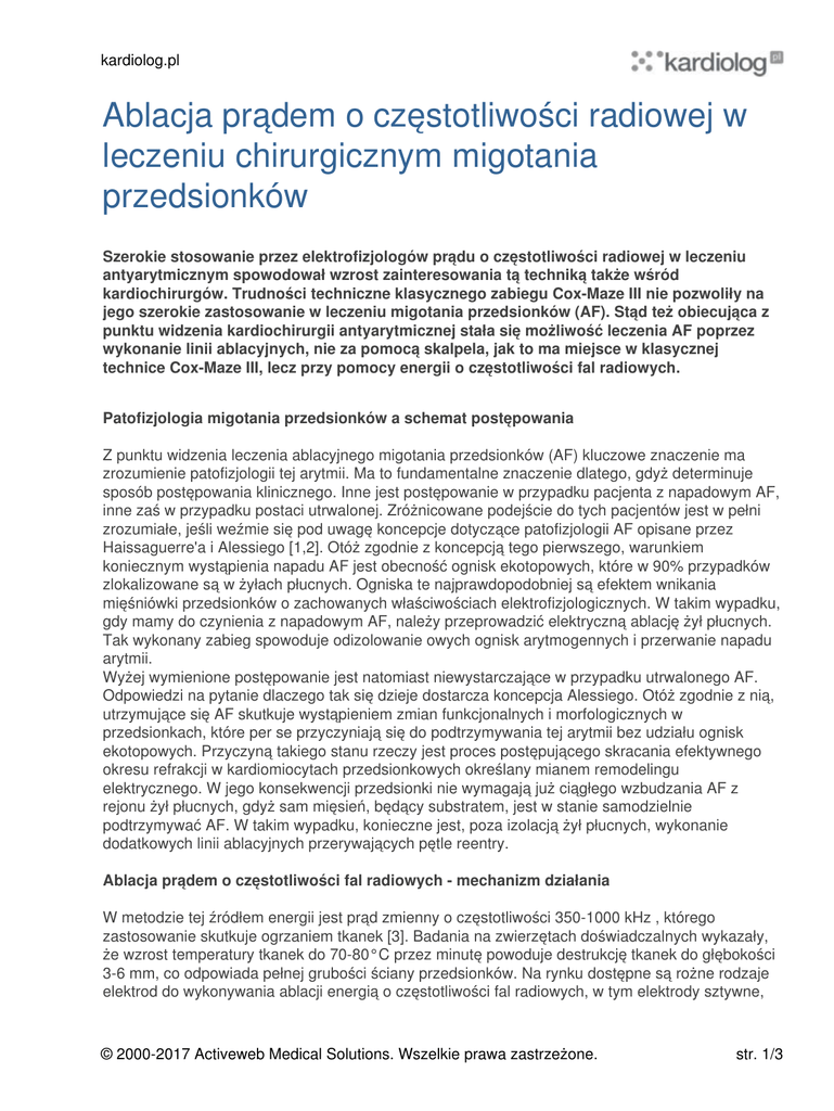 kardiolog.pl Ablacja prądem o częstotliwości radiowej w leczeniu chirurgicznym migotania przedsionków Szerokie stosowanie przez elektrofizjologów prądu o częstotliwości radiowej w leczeniu antyarytmicznym spowodował wzrost zainteresowania tą techniką także wśród kardiochirurgów. Trudności techniczne klasycznego zabiegu Cox-Maze III nie pozwoliły na jego szerokie zastosowanie w leczeniu migotania przedsionków (AF). Stąd też obiecująca z punktu widzenia kardiochirurgii antyarytmicznej stała się możliwość leczenia AF poprzez wykonanie linii ablacyjnych, nie za pomocą skalpela, jak to ma miejsce w klasycznej technice Cox-Maze III, lecz przy pomocy energii o częstotliwości fal radiowych. Patofizjologia migotania przedsionków a schemat postępowania Z punktu widzenia leczenia ablacyjnego migotania przedsionków (AF) kluczowe znaczenie ma zrozumienie patofizjologii tej arytmii. Ma to fundamentalne znaczenie dlatego, gdyż determinuje sposób postępowania klinicznego. Inne jest postępowanie w przypadku pacjenta z napadowym AF, inne zaś w przypadku postaci utrwalonej. Zróżnicowane podejście do tych pacjentów jest w pełni zrozumiałe, jeśli weźmie się pod uwagę koncepcje dotyczące patofizjologii AF opisane przez Haissaguerre'a i Alessiego [1,2]. Otóż zgodnie z koncepcją tego pierwszego, warunkiem koniecznym wystąpienia napadu AF jest obecność ognisk ekotopowych, które w 90% przypadków zlokalizowane są w żyłach płucnych. Ogniska te najprawdopodobniej są efektem wnikania mięśniówki przedsionków o zachowanych właściwościach elektrofizjologicznych. W takim wypadku, gdy mamy do czynienia z napadowym AF, należy przeprowadzić elektryczną ablację żył płucnych. Tak wykonany zabieg spowoduje odizolowanie owych ognisk arytmogennych i przerwanie napadu arytmii. Wyżej wymienione postępowanie jest natomiast niewystarczające w przypadku utrwalonego AF. Odpowiedzi na pytanie dlaczego tak się dzieje dostarcza koncepcja Alessiego. Otóż zgodnie z nią, utrzymujące się AF skutkuje wystąpieniem zmian funkcjonalnych i morfologicznych w przedsionkach, które per se przyczyniają się do podtrzymywania tej arytmii bez udziału ognisk ekotopowych. Przyczyną takiego stanu rzeczy jest proces postępującego skracania efektywnego okresu refrakcji w kardiomiocytach przedsionkowych określany mianem remodelingu elektrycznego. W jego konsekwencji przedsionki nie wymagają już ciągłego wzbudzania AF z rejonu żył płucnych, gdyż sam mięsień, będący substratem, jest w stanie samodzielnie podtrzymywać AF. W takim wypadku, konieczne jest, poza izolacją żył płucnych, wykonanie dodatkowych linii ablacyjnych przerywających pętle reentry. Ablacja prądem o częstotliwości fal radiowych - mechanizm działania W metodzie tej źródłem energii jest prąd zmienny o częstotliwości 350-1000 kHz , którego zastosowanie skutkuje ogrzaniem tkanek [3]. Badania na zwierzętach doświadczalnych wykazały, że wzrost temperatury tkanek do 70-80°C przez minutę powoduje destrukcję tkanek do głębokości 3-6 mm, co odpowiada pełnej grubości ściany przedsionków. Na rynku dostępne są rożne rodzaje elektrod do wykonywania ablacji energią o częstotliwości fal radiowych, w tym elektrody sztywne, © 2000-2017 Activeweb Medical Solutions. Wszelkie prawa zastrzeżone. str. 1/3 kardiolog.pl elastyczne, jednobiegunowe, dwubiegunowe czy elektrody irygowane. Elektrody dwubiegunowe a jednobiegunowe W systemie elektrod jednobiegunowych, jedna elektroda przyklejona jest do ciała pacjenta, drugą zaś posługuje się operator [3]. Po dotknięciu tkanek dochodzi do zamknięcia obwodu elektrycznego a to skutkuje ich ogrzaniem i uszkodzeniem. Podstawowym mankamentem tych elektrod jest możliwość spowodowania zwęglenia tkanek i uszkodzenia śródbłonka a to z kolei może skutkować formowaniem skrzeplin przyściennych i powikłaniami zakrzepowo-zatorowymi. Inną wadą ablacji za pomocą elektrod jednobiegunowych jest możliwość uszkodzenia struktur otaczających. Wśród powikłań wymienia się między innymi uszkodzenie naczyń wieńcowych, perforację przełyku i zatory powietrzne do ośrodkowego układu nerwowego [3-6]. Należy także zdawać sobie sprawę z tego, że aby proces ablacji mógł być skuteczny, zniszczeniu winna ulec cała grubość ściany przedsionka. Elektrody jednobiegunowe nie pozwalają niestety na pewne wykonanie tej procedury, gdyż nie ma jednoznacznych wykładników wskazujących na pełnościenne zniszczenie [7]. Części wyżej wymienionych ograniczeń pozbawione są elektrody dwubiegunowe. Pozwalają one na ablację jednolitą i pełnościenną [3]. Kontrolowany proces ablacji możliwy jest dzięki automatycznej rejestracji zmian impedancji tkanek podczas zabiegu. Zalety elektrod dwubiegunowych zdaje się potwierdzać badanie doświadczalne na zwierzętach przeprowadzone przez Prasad'a i wsp. [8]. Wskazuje ono, że podczas zabiegu z ich użyciem tkanki absorbują właściwą ilość energii potrzebną do zniszczenia pełnościennego [8]. Ponadto, zastosowanie elektrod dwubiegunowych, dzięki lepszej kontroli nad skutkami stosowanej energii, wiąże się z mniejszym ryzykiem uszkodzenia struktur otaczających. Dodatkową korzyścią jest możliwość ich stosowania podczas zabiegów bez użycia krążenia pozaustrojowego (ablacja nasierdziowa) oraz małoinwazyjnych [3]. Elektrody irygowane a elektrody nieirygowane Podczas zabiegu ablacji z użyciem elektrod jednobiegunowych temperatura w miejscu kontaktu z tkankami może wzrastać nawet do 100C, co może skutkować zwęgleniem tkanek oraz wystąpieniem wielu powikłań [3]. Częściowym rozwiązaniem tego problemu było wprowadzenie tzw. elektrod irygowanych. Chłodzenie elektrody za pomocą soli, poprzez wzrost przewodnictwa, pozwala na dostarczenie większej ilości energii do tkanek. Ponadto, jej zastosowanie chłodzi powierzchnię tkanek poddawanych zabiegowi ablacji 