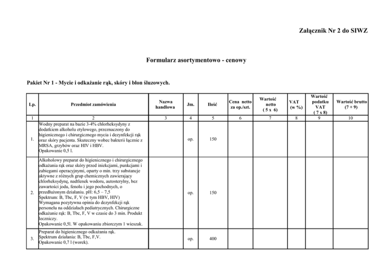 Załącznik Nr 2 do SIWZ Formularz asortymentowo