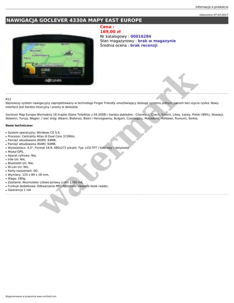 Informacje o produkcie Utworzono 07-03-2017 NAWIGACJA GOCLEVER 4330A MAPY EAST EUROPE Cena : 169,00 zł er m ar k Nr katalogowy : 00016284 Stan magazynowy : brak w magazynie Średnia ocena : brak recenzji R12 Najnowszy system nawigacyjny zaprojektowany w technologii Finger Friendly umożliwiający obsługę systemu jednym palcem bez użycia rysika. Nowy interface jest bardzo intuicyjny i prosty w obsłudze. Goclever Map Europa Wschodnia 18 krajów (Dane TeleAtlas z 04.2008) / bardzo dokładne : Chorwacji, Czech, Estonii, Litwy, Łotwy, Polski (99%), Słowacji, Słowenii, Turcja, Węgier. / sieć dróg: Albanii, Białorusi, Bośni i Hercegowiny, Bułgarii, Czarnogóry, Macedonii, Mołdawii, Rumunii, Serbia. Dane techniczne: ● ● ● ● ● ● ● ● ● ● ● ● ● ● w ● System operacyjny: Windows CE 5.0, Procesor: Centrality Atlas III Dual Core 372MHz, Pamięć wbudowana (ROM): 64MB, Pamięć wbudowana (RAM): 64MB, Wyświetlacz: 4,3", Format 16:9, 480x272 pikseli; Typ: LCD-TFT / kolorowy / dotykowy Moduł GPS, Aparat cyfrowy: Nie, Irda t/n: Nie, Bluetooth t/n: Nie, W-Lan t/n: Nie, Karty rozszerzeń: SD, Wymiary: 125 x 89 x 18 mm, Waga: 180g, Zasilanie: Akumulator Litowo-Jonowy Li-Ion 1260 mA, Funkcje dodatkowe: Odtwarzanie MP3/AVI/photo viewer/e-book reader, Gwarancja 1 rok at ● Wygenerowano w programie www.oscGold.com