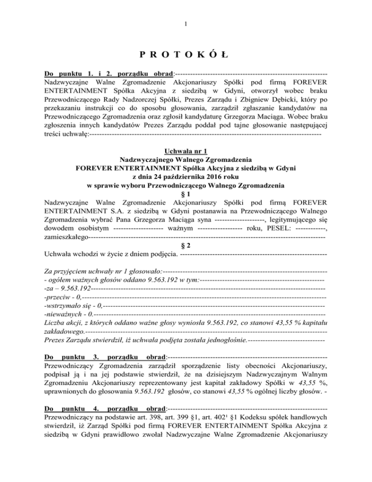 1 P R O T O K Ó Ł Do punktu 1. i 2. porządku obrad:------------------------------------------------------------Nadzwyczajne Walne Zgromadzenie Akcjonariuszy Spółki pod firmą FOREVER ENTERTAINMENT Spółka Akcyjna z siedzibą w Gdyni, otworzył wobec braku Przewodniczącego Rady Nadzorczej Spółki, Prezes Zarządu i Zbigniew Dębicki, który po przekazaniu instrukcji co do sposobu głosowania, zarządził zgłaszanie kandydatów na Przewodniczącego Zgromadzenia oraz zgłosił kandydaturę Grzegorza Maciąga. Wobec braku zgłoszenia innych kandydatów Prezes Zarządu poddał pod tajne głosowanie następującej treści uchwałę:--------------------------------------------------------------------------------------------Uchwała nr 1 Nadzwyczajnego Walnego Zgromadzenia FOREVER ENTERTAINMENT Spółka Akcyjna z siedzibą w Gdyni z dnia 24 października 2016 roku w sprawie wyboru Przewodniczącego Walnego Zgromadzenia §1 Nadzwyczajne Walne Zgromadzenie Akcjonariuszy Spółki pod firmą FOREVER ENTERTAINMENT S.A. z siedzibą w Gdyni postanawia na Przewodniczącego Walnego Zgromadzenia wybrać Pana Grzegorza Maciąga syna --------------------, legitymującego się dowodem osobistym -------------------- ważnym ------------------ roku, PESEL: ------------, zamieszkałego----------------------------------------------------------------------------------------------§2 Uchwała wchodzi w życie z dniem podjęcia. ----------------------------------------------------------Za przyjęciem uchwały nr 1 głosowało:------------------------------------------------------------------ ogółem ważnych głosów oddano 9.563.192 w tym:--------------------------------------------------za – 9.563.192----------------------------------------------------------------------------------------------przeciw - 0,--------------------------------------------------------------------------------------------------wstrzymało się - 0,-----------------------------------------------------------------------------------------nieważnych - 0.--------------------------------------------------------------------------------------------Liczba akcji, z których oddano ważne głosy wyniosła 9.563.192, co stanowi 43,55 % kapitału zakładowego.------------------------------------------------------------------------------------------------Prezes Zarządu stwierdził, iż uchwała podjęta została jednogłośnie.------------------------------Do punktu 3. porządku obrad:---------------------------------------------------------------Przewodniczący Zgromadzenia zarządził sporządzenie listy obecności Akcjonariuszy, podpisał ją i na jej podstawie stwierdził, że na dzisiejszym Nadzwyczajnym Walnym Zgromadzeniu Akcjonariuszy reprezentowany jest kapitał zakładowy Spółki w 43,55 %, uprawnionych do głosowania 9.563.192 głosów, co stanowi 43,55 % ogólnej liczby głosów. Do punktu 4. porządku obrad:---------------------------------------------------------------Przewodniczący na podstawie art. 398, art. 399 §1, art. 402¹ §1 Kodeksu spółek handlowych stwierdził, iż Zarząd Spółki pod firmą FOREVER ENTERTAINMENT Spółka Akcyjna z siedzibą w Gdyni prawidłowo zwołał Nadzwyczajne Walne Zgromadzenie Akcjonariuszy 2 Spółki na dzień 24 października 2016 roku w Gdyni, przy Alei Zwycięstwa 96/98, sala E3.27, III p., na godzinę 12:00 poprzez ogłoszenie zamieszczone na stronie internetowej Spółki http://www.forever-entertainment.com/pl.ogloszenia_i_publikacje.html. -------------------------Wobec powyższego oraz faktu, iż nikt z obecnych nie wniósł sprzeciwu ani co do odbycia Zgromadzenia ani co do postawienia poszczególnych spraw na porządku obrad, Przewodniczący stwierdził, iż Zgromadzenie niniejsze zdolne jest do podejmowania uchwał przewidzianych w ogłoszonej propozycji porządku obrad.------------------------------------------Do punktu 5. porządku obrad:----------------------------------------------------------------Następnie Przewodniczący Zgromadzenia zarządził głosowanie jawne, w wyniku którego podjęto następującej treści uchwałę:---------------------------------------------------------------------Uchwała nr 2 Nadzwyczajnego Walnego Zgromadzenia FOREVER ENTERTAINMENT Spółka Akcyjna z siedzibą w Gdyni z dnia 24 października 2016 roku w sprawie przyjęcia porządku obrad §1 Nadzwyczajne Walne Zgromadzenie Akcjonariuszy Spółki pod firmą FOREVER ENTERTAINMENT S.A. z siedzibą w Gdyni postanawia przyjąć następujący porządek obrad: -------------------------------------------------------------------------------------------------------1. Otwarcie obrad Nadzwyczajnego Walnego Zgromadzenia. --------------------------------2. Wybór Przewodniczącego Nadzwyczajnego Walnego Zgromadzenia.--------------------3. Sporządzenie listy obecności.--------------------------------------------------------------------4. Stwierdzenie prawidłowości zwołania Nadzwyczajnego Walnego Zgromadzenia oraz jego zdolności do podejmowania uchwał. ----------------------------------------------------5. Przyjęcie porządku obrad. -----------------------------------------------------------------------6. Podjęcie uchwały w sprawie uchylenia tajności głosowania dotyczącego wyboru komisji skrutacyjnej powoływanej przez Nadzwyczajne Walne Zgromadzenie. --------7. Podjęcie uchwały w sprawie wyboru komisji skrutacyjnej.---------------------------------8. Podjęcie uchwały w sprawie zmiany § 8 Statutu Spółki w zakresie upoważnienia Zarządu do podwyższenia kapitału zakładowego w granicach kapitału docelowego z pozbawieniem dotychczasowych Akcjonariuszy prawa poboru akcji w całości lub części. ----------------------------------------------------------------------------------------------9. Podjęcie uchwały w sprawie upoważnienia Rady Nadzorczej do ustalenia tekstu jednolitego statutu Spółki. -----------------------------------------------------------------------10. Wolne głosy