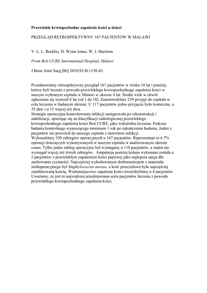 Przewlekłe krwiopochodne zapalenie kości u dzieci PRZEGLĄD RETROSPEKTYWNY 167 PACJENTÓW W MALAWI V. L. L. Beckles, H. Wynn Jones, W. J. Harrison From Beit CURE International Hospital, Malawi J Bone Joint Surg [Br] 2010;92-B:1138-43. Przedstawiamy retrospektywny przegląd 167 pacjentów w wieku 18 lat i poniżej, którzy byli leczeni z powodu przewlekłego krwiopochodnego zapalenia kości w naszym wybranym szpitalu w Malawi w okresie 4 lat. Średni wiek w chwili zgłaszania się wynosił 8 lat (od 1 do 18). Zanotowaliśmy 239 przyjęć do szpitala w celu leczenia w badanym okresie. U 117 pacjentów jedno przyjęcie było konieczne, u 35 daw i u 15 więcej niż dwa. Strategia operacyjna kontrolowania infekcji następowała po rekonstrukcji i stabilizacji, opierając się na klasyfikacji radiologicznej przewlekłego krwiopochodnego zapalenia kości Beit CURE, jako wskaźnika leczenia. Podczas badania kontrolnego wynoszącego minimum 1 rok po zakończeniu badania, żaden z pacjentów nie powrócił do naszego szpitala z nawrotem infekcji. Wykonaliśmy 350 zabiegów operacyjnych u 167 pacjentów. Reprezentuje to 6.7% operacji dziecięcych wykonywanych w naszym szpitalu w analizowanym okresie czasu. Tylko jeden zabieg operacyjny był wymagany u 110 pacjentów, a żaden nie wymagał więcej niż trzech zabiegów. Amputacja poniżej kolana wykonana została u 2 pacjentów z przewlekłym zapaleniem kości piętowej jako najlepsza opcja dla zachowania czynności. Najczęściej wyhodowanym drobnoustrojem z materiału śródoperacyjnego był Staphylococcus aureus, a kość piszczelowa była najczęściej zainfekowaną kością. Wielomiejscowe zapalenie kości stwierdziliśmy u 4 pacjentów. Uważamy, że jest to największa przedstawiana seria pacjentów leczona z powodu przewlekłego krwiopochodnego zapalenia kości. .
