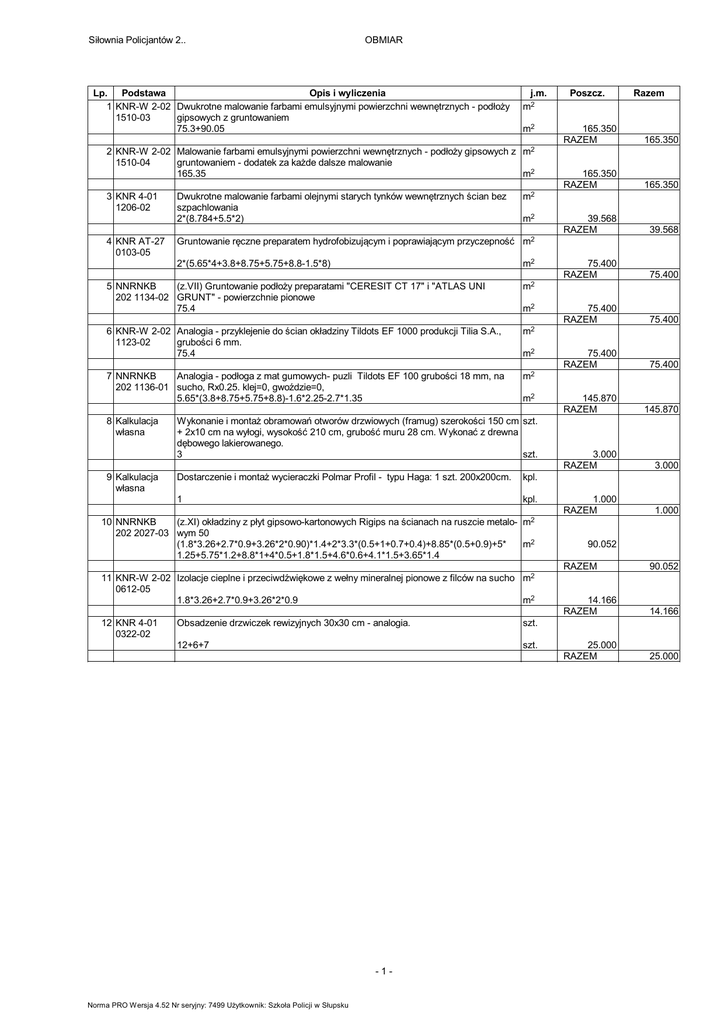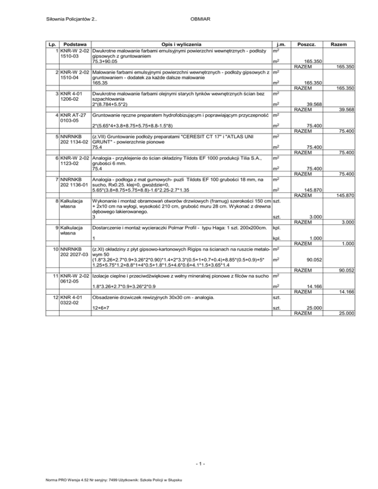 Siłownia Policjantów 2.. OBMIAR Lp. Podstawa Opis i wyliczenia 1 KNR-W 2-02 Dwukrotne malowanie farbami emulsyjnymi powierzchni wewnętrznych - podłoży 1510-03 gipsowych z gruntowaniem 75.3+90.05 j.m. m2 m2 2 KNR-W 2-02 Malowanie farbami emulsyjnymi powierzchni wewnętrznych - podłoży gipsowych z m2 1510-04 gruntowaniem - dodatek za każde dalsze malowanie 165.35 m2 3 KNR 4-01 1206-02 4 KNR AT-27 0103-05 Dwukrotne malowanie farbami olejnymi starych tynków wewnętrznych ścian bez szpachlowania 2*(8.784+5.5*2) m2 m2 m2 6 KNR-W 2-02 Analogia - przyklejenie do ścian okładziny Tildots EF 1000 produkcji Tilia S.A., 1123-02 grubości 6 mm. 75.4 m2 7 NNRNKB Analogia - podłoga z mat gumowych- puzli Tildots EF 100 grubości 18 mm, na 202 1136-01 sucho, Rx0.25. klej=0, gwoździe=0, 5.65*(3.8+8.75+5.75+8.8)-1.6*2.25-2.7*1.35 m2 m2 m2 m2 Wykonanie i montaż obramowań otworów drzwiowych (framug) szerokości 150 cm szt. + 2x10 cm na wyłogi, wysokość 210 cm, grubość muru 28 cm. Wykonać z drewna dębowego lakierowanego. 3 szt. Dostarczenie i montaż wycieraczki Polmar Profil - typu Haga: 1 szt. 200x200cm. kpl. 1 kpl. 10 NNRNKB (z.XI) okładziny z płyt gipsowo-kartonowych Rigips na ścianach na ruszcie metalo- m2 202 2027-03 wym 50 (1.8*3.26+2.7*0.9+3.26*2*0.90)*1.4+2*3.3*(0.5+1+0.7+0.4)+8.85*(0.5+0.9)+5* m2 1.25+5.75*1.2+8.8*1+4*0.5+1.8*1.5+4.6*0.6+4.1*1.5+3.65*1.4 11 KNR-W 2-02 Izolacje cieplne i przeciwdźwiękowe z wełny mineralnej pionowe z filców na sucho m2 0612-05 1.8*3.26+2.7*0.9+3.26*2*0.9 m2 12 KNR 4-01 0322-02 165.350 RAZEM 165.350 165.350 RAZEM 165.350 39.568 RAZEM 39.568 75.400 RAZEM 75.400 75.400 RAZEM 75.400 75.400 RAZEM 75.400 145.870 RAZEM 145.870 3.000 RAZEM 3.000 1.000 RAZEM 1.000 m2 5 NNRNKB (z.VII) Gruntowanie podłoży preparatami "CERESIT CT 17" i "ATLAS UNI 202 1134-02 GRUNT" - powierzchnie pionowe 75.4 9 Kalkulacja własna Razem Gruntowanie ręczne preparatem hydrofobizującym i poprawiającym przyczepność m2 2*(5.65*4+3.8+8.75+5.75+8.8-1.5*8) 8 Kalkulacja własna Poszcz. Obsadzenie drzwiczek rewizyjnych 30x30 cm - analogia. szt. 12+6+7 szt. -1- Norma PRO Wersja 4.52 Nr seryjny: 7499 Użytkownik: Szkoła Policji w Słupsku 90.052 RAZEM 90.052 14.166 RAZEM 14.166 25.000 RAZEM 25.000