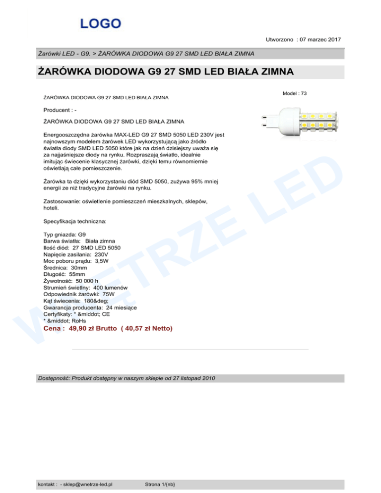 Utworzono : 07 marzec 2017 Żarówki LED - G9. > ŻARÓWKA DIODOWA G9 27 SMD LED BIAŁA ZIMNA ŻARÓWKA DIODOWA G9 27 SMD LED BIAŁA ZIMNA Model : 73 ŻARÓWKA DIODOWA G9 27 SMD LED BIAŁA ZIMNA Producent : ŻARÓWKA DIODOWA G9 27 SMD LED BIAŁA ZIMNA Energooszczędna żarówka MAX-LED G9 27 SMD 5050 LED 230V jest najnowszym modelem żarówek LED wykorzystującą jako źródło światła diody SMD LED 5050 które jak na dzień dzisiejszy uważa się za najjaśniejsze diody na rynku. Rozpraszają światło, idealnie imitując świecenie klasycznej żarówki, dzięki temu równomiernie oświetlają całe pomieszczenie. Żarówka ta dzięki wykorzystaniu diód SMD 5050, zużywa 95% mniej energii ze niż tradycyjne żarówki na rynku. Zastosowanie: oświetlenie pomieszczeń mieszkalnych, sklepów, hoteli. E Z Specyfikacja techniczna: Typ gniazda: G9 Barwa światła: Biała zimna Ilość diód: 27 SMD LED 5050 Napięcie zasilania: 230V Moc poboru prądu: 3,5W Średnica: 30mm Długość: 55mm Żywotność: 50 000 h Strumień świetlny: 400 lumenów Odpowiednik żarówki: 75W Kąt świecenia: 180° Gwarancja producenta: 24 miesiące Certyfikaty: * · CE * · RoHs R T Ę N W Cena : 49,90 zł Brutto ( 40,57 zł Netto) Dostępność: Produkt dostępny w naszym sklepie od 27 listopad 2010 kontakt : - [email protected] Strona 1/{nb} D E L