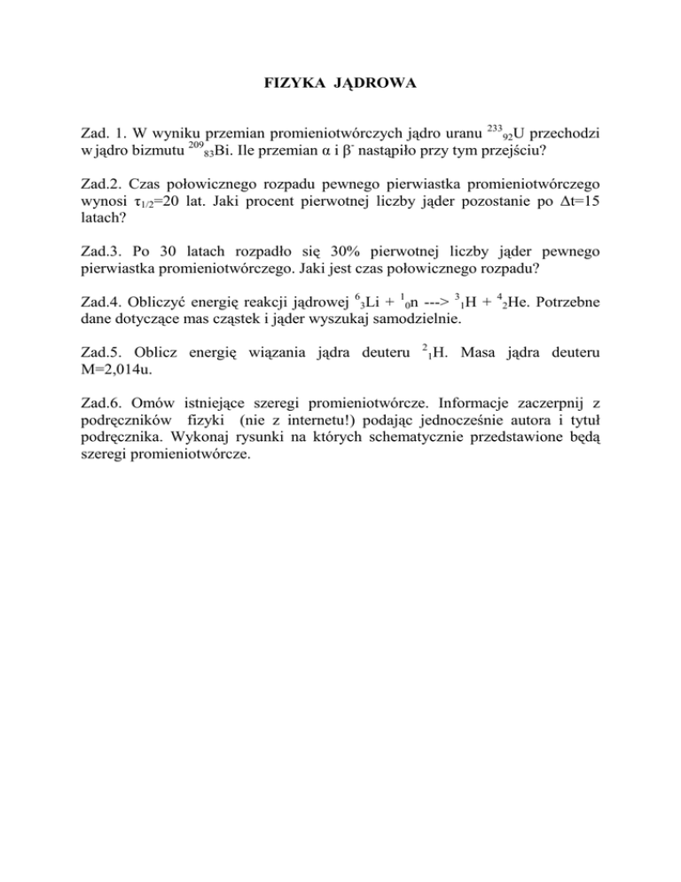 FIZYKA JĄDROWA Zad. 1. W wyniku przemian promieniotwórczych jądro uranu 23392U przechodzi w jądro bizmutu 20983Bi. Ile przemian α i β- nastąpiło przy tym przejściu? Zad.2. Czas połowicznego rozpadu pewnego pierwiastka promieniotwórczego wynosi τ1/2=20 lat. Jaki procent pierwotnej liczby jąder pozostanie po ∆t=15 latach? Zad.3. Po 30 latach rozpadło się 30% pierwotnej liczby jąder pewnego pierwiastka promieniotwórczego. Jaki jest czas połowicznego rozpadu? Zad.4. Obliczyć energię reakcji jądrowej 63Li + 10n ---> 31H + dane dotyczące mas cząstek i jąder wyszukaj samodzielnie. Zad.5. Oblicz energię wiązania jądra deuteru M=2,014u. 2 1H. 4 2He. Potrzebne Masa jądra deuteru Zad.6. Omów istniejące szeregi promieniotwórcze. Informacje zaczerpnij z podręczników fizyki (nie z internetu!) podając jednocześnie autora i tytuł podręcznika. Wykonaj rysunki na których schematycznie przedstawione będą szeregi promieniotwórcze.