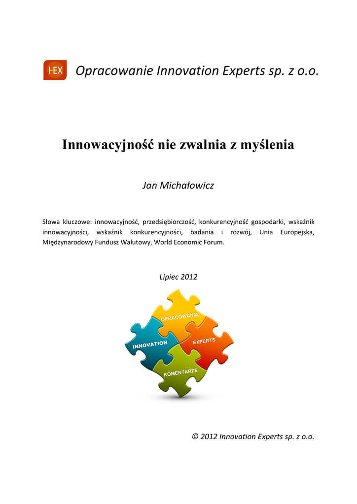 Opracowanie Innovation Experts sp. z o.o. Innowacyjność nie ie zwalnia z myślenia myś Jan Michałowicz Słowa kluczowe: innowacyjność, przedsiębiorczość, konkurencyjność gospodarki, wskaźnik innowacyjności, wskaźnik konkurencyjności, badania i rozwój, Unia Europejska, Międzynarodowy iędzynarodowy Fundusz Walutowy, World Economic Forum. Lipiec 2012 © 2012 Innovation Experts sp. z o.o. Innowacyjność nie zwalnia z myślenia – Jan Michałowicz, Innovation Experts sp. z.o.o. „Każdy dogmat ma dzień triumfu” – H.G. Wells a początku było Słowo. Potem również. Obserwując współczesnych specjalistów od ekonomii można odnieść wrażenie, że słowem tym powinno być „innowacyjność”. Próbę naukowej definicji tego znanego od zawsze zjawiska podjął jeden z najwybitniejszych ekonomistów świata, Austriak Józef Schumpeter. Jego prosta i szanowana do dzisiaj, a w świecie ekonomii trudno o szacunek kolegów, definicja z 1934 roku ewaluowała od stwierdzenia: „Innowacja polega na tym, że w sferze życia gospodarczego robi się rzeczy inaczej” do poważnych studiów. Fundamentalne dzieło z 1942 roku „Kapitalizm, socjalizm, demokracja”1 szczegółowo opisuje „twórczą destrukcję” - dynamiczny proces, w którym nowe technologie zastępują stare, stymulując rozwój gospodarczy. Schumpeter rozróżniał dwa rodzaje innowacji: „radykalne” prowadzące do wielkich destrukcyjnych zmian, oraz „przyrostowe” - nieustannie popychające proces zmian do przodu. W swych pracach wyróżnił on również pięć typów innowacji: N • • • • • wprowadzanie nowych produktów, wprowadzanie nowych metod produkcji, otwarcie nowych rynków zbytu, ukształtowanie nowych źródeł dostaw surowców lub innych środków, tworzenie nowych struktur rynkowych w ramach danego rodzaju działalności. Kluczową postacią w teorii innowacji jest przedsiębiorca. Zanim zaczną się z tego powodu cieszyć polscy przedsiębiorcy, warto wyjaśnić, że wyraz ten ma na świecie zgoła odmienne od polskiego znaczenie. Pojęcie pojawiło się w XVIII wieku i oznacza jednostkę, której bystrość sprawia, iż możliwe staje się przekształcenie pomysłu w efekt ekonomiczny. Specjaliści od początku XX wieku starannie odróżniają role przedsiębiorcy i przedsiębiorstwa (firmy). Wraz z pojawieniem się i ukształtowaniem ekonomicznej teorii firm przedsiębiorca został wygnany z analiz mikroekonomicznych. Po raz pierwszy wydarzyło się to w 1930 roku, kiedy to firma została podporządkowana neoklasycznej teorii cen. Drugie wygnanie przypadło na lata osiemdziesiąte XX wieku, gdy teoria firmy została sformułowana w języku teorii gier i ekonomii informacji. Jedynym uzasadnieniem ewentualnego bezpośredniego związku przedsiębiorcy z firmą jest ułatwienie w poddaniu się ocenie rynku. Nie umniejsza to w żadnym przypadku roli i oczekiwań związanych z przedsiębiorcami. Wprawiają oni bowiem w ruch gospodarkę kraju. Rozwój gospodarczy możliwy jest jedynie dzięki nowym celom i nowym sposobom pracy, otwierającym nowe możliwości działalności gospodarczej i czyniącym inne zbędnymi. Warunkiem zdolności gospodarki do zmian jest dojrzały system finansowy. Przedsiębiorca i firma, gotowa do wdrożenia jego pomysłów, muszą mieć szansę uzyskania środków niezbędnych do Strona 2 Niewątpliwie każda dyskusja na temat innowacyjności musi podjąć temat konkurencyjność rynkowej. Jak zwykle w ekonomii równolegle obowiązuje wiele definicji zagadnienia. Na potrzeby naszych rozważań przyjmiemy, że konkurencyjność to kryterium wszechstronnej oceny podmiotu, która określa jego zdolność do ciągłego kreowania tendencji rozwojowej, wzrostu produktywności oraz do skutecznego rozwijania rynków zbytu. Według Michaela E. Portera2 konkurencyjność państw jest uzależniona od zdolności ich społeczeństw do tworzenia i przyswajania wiedzy oraz wprowadzania innowacji w gospodarce. Wysoki poziom innowacyjności, a w jego efekcie także konkurencyjności państwa, przekłada się bezpośrednio na wysoki poziom życia jego obywateli. Innowacyjność nie zwalnia z myślenia – Jan Michałowicz, Innovation Experts sp. z.o.o. realizacji ich wspólnej wizji. Rolę dostarczyciela kapitału w dojrzałych gospodarkach pełnią zazwyczaj fundusze venture capital. Przedsiębiorstwa, w które inwestują podmioty obracające długoterminowym kapitałem podwyższonego ryzyka, osiągają lepsze wyniki niż firmy, które muszą polegać na krótkoterminowym finansowaniu bankowym. Jest to efektem rygorystycznego i drobiazgowego przeglądu nowego przedsięwzięcia, jakiego dokonuje venture capital zanim przystąpi do inwestycji. Przeciętny europejski fundusz venture capital jest wart ok. 60 mln euro. luczowe znaczenie innowacji dla rozwoju oraz konkurencyjności gospodarki Unii Europejskiej nie podlega dziś dyskusji. Priorytety wzrostu obejmują: rozwój inteligentny, oparty na wiedzy i innowacji; rozwój zrównoważony, oparty na zwiększeniu konkurencyjności gospodarki i jej przyjazności dla środowiska; rozwój sprzyjający włączeniu społecznemu, czyli wspieranie gospodarki o wysokim poziomie zatrudnienia, zapewniającej spójność społeczną i terytorialną. Dla zrealizowania celów Komisja Europejska zaproponowała uruchomienie inicjatyw przewodnich, wśród których znalazła się m.in. „Unia innowacji”3. Strategiczne podejście do innowacyjności czyni ją nadrzędnym celem polityki, zaś wszystkie instrumenty i środki polityczne oraz fundusze służą wspieraniu innowacji. K Strona Corocznie publikowany ranking innowacyjności krajów UE Innovation Union Scoreboard5 gromadzi dane w postaci 25 wskaźników, które są pogrupowane w trzy główne kategorie i osiem wymiarów. „Warunki podstawowe” mają za zadanie uchwycenie bodźców niezależnych od firm. Składają się na nie „Zasoby ludzkie”, „System badań”, oraz „Fina
