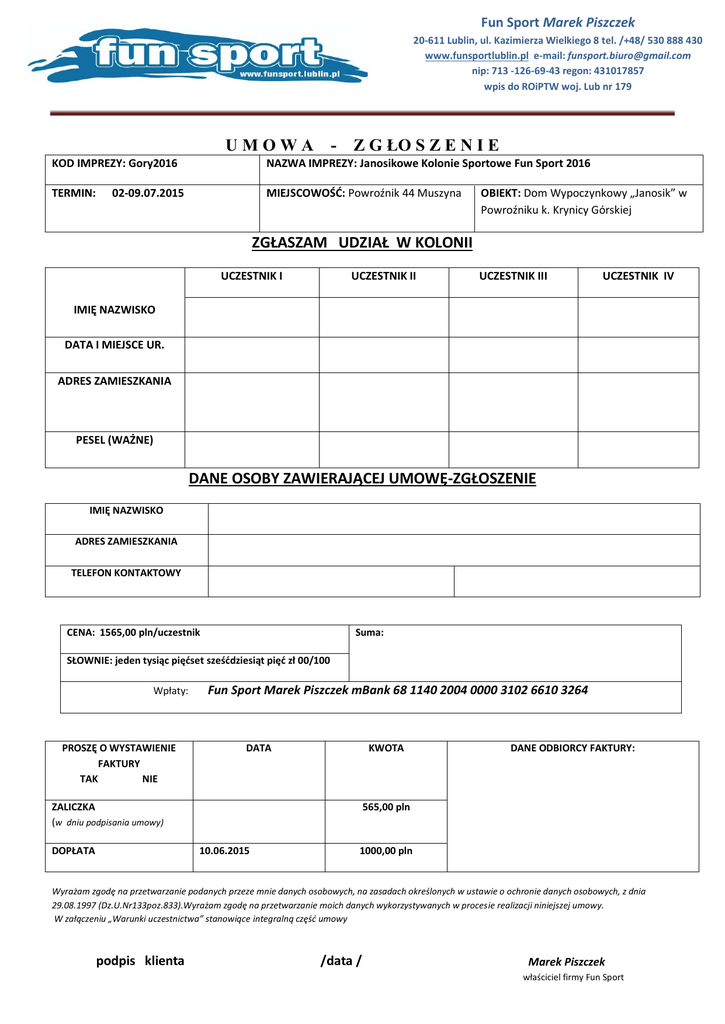 Fun Sport Marek Piszczek 20-611 Lublin, ul. Kazimierza Wielkiego 8 tel. /+48/ 530 888 430 www.funsportlublin.pl e-mail: [email protected] nip: 713 -126-69-43 regon: 431017857 wpis do ROiPTW woj. Lub nr 179 - Z G ŁO S Z E N I E UMOWA KOD IMPREZY: Gory2016 NAZWA IMPREZY: Janosikowe Kolonie Sportowe Fun Sport 2016 TERMIN: MIEJSCOWOŚĆ: Powroźnik 44 Muszyna 02-09.07.2015 OBIEKT: Dom Wypoczynkowy „Janosik” w Powroźniku k. Krynicy Górskiej ZGŁASZAM UDZIAŁ W KOLONII UCZESTNIK I UCZESTNIK II UCZESTNIK III UCZESTNIK IV IMIĘ NAZWISKO DATA I MIEJSCE UR. ADRES ZAMIESZKANIA PESEL (WAŻNE) DANE OSOBY ZAWIERAJĄCEJ UMOWĘ-ZGŁOSZENIE IMIĘ NAZWISKO ADRES ZAMIESZKANIA TELEFON KONTAKTOWY CENA: 1565,00 pln/uczestnik Suma: SŁOWNIE: jeden tysiąc pięćset sześćdziesiąt pięć zł 00/100 Wpłaty: PROSZĘ O WYSTAWIENIE FAKTURY TAK NIE Fun Sport Marek Piszczek mBank 68 1140 2004 0000 3102 6610 3264 DATA KWOTA ZALICZKA (w dniu podpisania umowy) DOPŁATA DANE ODBIORCY FAKTURY: 565,00 pln 10.06.2015 1000,00 pln Wyrażam zgodę na przetwarzanie podanych przeze mnie danych osobowych, na zasadach określonych w ustawie o ochronie danych osobowych, z dnia 29.08.1997 (Dz.U.Nr133poz.833).Wyrażam zgodę na przetwarzanie moich danych wykorzystywanych w procesie realizacji niniejszej umowy. W załączeniu „Warunki uczestnictwa” stanowiące integralną część umowy podpis klienta /data / Marek Piszczek właściciel firmy Fun Sport Fun Sport Marek Piszczek 20-611 Lublin, ul. Kazimierza Wielkiego 8 tel. /+48/ 530 888 430 www.funsportlublin.pl e-mail: [email protected] nip: 713 -126-69-43 regon: 431017857 wpis do ROiPTW woj. Lub nr 179 WARUNKI UCZESTNICTWA W IMPREZIE TURYSTYCZNEJ Fun Sport Marek Piszczek I. Postanowienia ogólne 1. Zawarcie umowy z Fun Sport Marek Piszczek, posiadającym wpis Rejestru Organizatorów i Pośredników Turystycznych Województwa Lubelskiego nr 179, zwanym dalej „ORGANIZATOREM”, następuje z chwilą zapoznania się z niniejszymi WARUNKAMI UCZESTNICTWA, wypełnienia, podpisania, wpłacenia ustalonej zaliczki, zeskanowania i odesłania przez Klienta stosownego formularza umowy emailem na adres ORGANIZATORA (email: [email protected]). Za osoby niepełnoletnie umowę podpisują ich przedstawiciele ustawowi. 2. Rezerwacja dla organizatora jest wiążąca tylko po wpłacie zaliczki ustalonej z organizatorem. 3. Do umowy Klient zobowiązany jest dołączyć skan dowodu wpłaty zaliczki w wysokości określonej w umowie. Klient zobowiązuje się dokonać dalszych wpłat w ustalonych w umowie terminach i wysokościach. 4. Niedokonanie przez Klienta pełnej wpłaty należności za imprezę w ustalonym terminie i wysokości, po wezwaniu do jej uiszczenia, ORGANIZATOR może potraktować jako rezygnację z imprezy z przyczyn leżących po stronie Klienta. 5. W przypadku rezygnacji z obozu w terminie dłuższym niż 30 dni przed datą rozpoczęcia organizator dokonuje zwrotu wpłaconej kwoty po potrąceniu kosztów manipulacyjnych w wysokości 300 zł od uczestnika. 6. W przypadku rezygnacji w terminie krótszym niż 14 dni przed rozpoczęciem lub w czasie trwania obozu, uczestnikowi nie przysługuje zwrot wpłaconej kwoty. Szczególne przypadki losowe (odpowiednio udokumentowane) powodujące rezygnację w terminie krótszym niż 14dni, będą rozpatrywane indywidualnie. 7. Klient powinien zapoznać się z ofertą, która jest integralną częścią umowy – zgłoszenia, uzupełnić kartę kwalifikacyjną i dostarczyć organizatorowi. 8. Uczestnicy obozu są ubezpieczeni od następstw nieszczęśliwych wypadków w okresie od dnia rozpoczęcia do dnia zakończenia pobytu. W przypadku wyjazdów zagranicznych również kosztów leczenia w/g oferty i stawek Europäische Reiseversicherung AG Oddział w Polsce z siedzibą przy ul. Chmielnej 101/102, 80-748 Gdańsk 9. Uczestnik zobowiązany jest zabrać ze sobą aktualną legitymację szkolną, jeśli w programie imprezy jest wycieczka zagraniczna (Słowacja, Czechy, Niemcy) dowód osobisty lub paszport. 10. Organizator nie ponosi odpowiedzialności za sprzęt elektroniczny, sportowy, rzeczy wartościowe oraz rzeczy pozostawione przez uczestników podczas pobytu oraz w środkach transportu. 11. Za ewentualne szkody wyrządzone przez dziecko odpowiadają rodzice, którzy po zakończeniu obozu zostaną obciążeni rachunkiem za straty. 12. Uczestnikowi nie przysługuje zwrot świadczeń nie wykorzystanych w trakcie obozu z przyczyn leżących po jego stronie. 13. Uczestnik zobowiązany jest stosować się do regulaminu obozu/ośrodka, gdzie organizowany jest wypoczynek oraz do poleceń wychowawców i instruktorów. 14. W przypadku palenia tytoniu, używania narkotyków, spożywania alkoholu, przebywania pod jego wpływem lub poważnego naruszenia regulaminu obozu (samowolnego opuszczenie terenu ośrodka, samowolnej kąpieli w jeziorze), uczestnik zostanie wydalony z placówki na koszt własny (rodziców, opiekunów). W przypadku rażących naruszeń regulaminu organizator zastrzega sobie możliwość wezwania policji, i odtransportowanie uczestnika kolonii/obozu na izbę dziecka, gdzie pozostanie do chwili odbioru dziecka przez rodziców. Organizator nie zwraca pieniędzy za niewykorzystane dni. 15. Wszelkie uwagi dotyczące obozu rozpatrywane będą w ciągu 7 dni od jego zakończenia. 16. Organizator zastrzega sobie prawo do wykonywania zdjęć i filmów podczas trwania obozu oraz wykorzystania ich w celach marketingowych. ……………………………………………….. Podpis rodzica lub prawnego opiekuna II. Zmiany umowy 1. O wszelkich zmianach danych Klienta zamieszczonych w umowie, Klient powinien niezwłocznie powiadomić ORGANIZATORA. ORGANIZATOR nie odpowiada za niewykonanie umowy z powodu zmiany danych, o której nie został powiadomiony. 2. ORGANIZATOR zastrzega sobie prawo zmiany warunków umowy z przyczyn (tzw. sił wyższych) niezależnych od organizatora. 3. O każdej zmianie istotnych warunków umowy (np. cena, termi