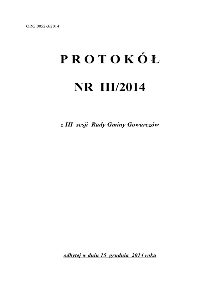 ORG.0052-3/2014 PROTOKÓŁ NR III/2014 z III sesji Rady Gminy Gowarczów odbytej w dniu 15 grudnia 2014 roku P R O T O K Ó Ł Nr III/2014 z sesji Rady Gminy w Gowarczowie odbytej w dniu 15 grudnia 2014 roku W sesji udział wzięło 14 Radnych Rady Gminy. Lista obecności stanowi integralną część niniejszego protokołu oraz 12 sołtysów lista obecności stanowi integralna część protokołu. Ponadto w sesji udział Wójt Gminy Stanisław Pacocha, zastępca wójta Barbara Panek, sekretarz Gminy Dorota Lachowicz, adwokat Sylwester Ziębicki. Przewodniczący Rady Gminy Czesław Ludwikowski otworzył III sesję Rady Gminy w Gowarczowie, powitał zebranych, stwierdził quorum dające gwarancję podejmowania prawomocnych uchwał. Ad. pkt. 1 Przewodniczący Rady Gminy przedstawił porządek obrad w następującej formie: Przyjęcie porządku obrad III sesji Rady Gminy w Gowarczowie. Przyjęcie protokołu z II sesji Rady Gminy w Gowarczowie. Informacja Wójta Gminy Gowarczów o pracy Wójta pomiędzy sesjami. Interpelacje i zapytania radnych oraz odpowiedzi na złożone interpelacje i zapytania radnych. 5. Podjęcie uchwały Nr III/3/2014 Rady Gminy w Gowarczowie w sprawie ustalenia maksymalnej liczby radnych wchodzących w skład stałych komisji Rady Gminy w Gowarczowie działających w kadencji na lata 2014-2018. 6. Podjęcie uchwały Nr III/4/2014 Rady Gminy w Gowarczowie w sprawie ustalenia składów osobowych stałych komisji Rady Gminy w Gowarczowie. 7. Podjęcie uchwały Nr III/5/2014 Rady Gminy w Gowarczowie w sprawie ustalenia warunków pracy i płacy Wójta oraz upoważnienia Przewodniczącego Rady Gminy do dokonania czynności w sprawach z zakresu pracy wobec Wójta. 8. Wnioski i oświadczenia radnych. 9. Sprawy różne. 10. Zakończenie obrad III sesji Rady Gminy w Gowarczowie. 1. 2. 3. 4. Następnie Przewodniczący Rady Gminy poddał powyższy porządek obrad pod głosowanie. W głosowaniu jawnym porządek obrad został jednogłośnie przyjęty. Ad.pkt.2 Protokół Nr II/2014 z sesji Rady Gminy w Gowarczowie odbytej w dniu 9 grudnia 2014 roku został wyłożony do wglądu. Następnie Przewodniczący Rady Gminy poddał go pod głosowanie. W głosowaniu protokół Nr II/2014 z sesji Rady Gminy Gowarczów odbytej w dniu 9 grudnia został przyjęty jednogłośnie. Ad. pkt. 3 Zarządzenia wydane od ostanie sesji czyli od 9 grudnia 2014 roku.: - zarządzenie w sprawie powołania Komisji Przetargowej do przeprowadzenia postepowania o udzielenie zamówienia publicznego w trybie przetargu nieograniczonego na: ”Odbiór i zagospodarowanie odpadów komunalnych wytworzonych na terenie nieruchomości zamieszkałych na terenie gminy Gowarczów oraz odpadów komunalnych pochodzących z działalności Urzędu Gminy w Gowarczowie i odpadów pochodzących ze sprzątania ulic, placów i cmentarzy na terenie gminy Gowarczów (kod odpadów: 20 02 01, 20 02 03, 20 03, 03). - zarządzenie w sprawie wprowadzenia zmian w budżecie Gminy na 2014 rok, Spraw jakie wydarzyły się na terenie Gminy od ostatniej sesji to: - dokonano odbioru ogrodzenia przy Szkole Podstawowej w Gowarczowie, -Wójt przedstawił mecenasa Sylwestra Ziębickiego, który będzie prowadził obsługę prawna w urzędzie. Ad. pkt.4 Tomasz Młynarczyk zam. Kamienna Wola – zwrócił się z pytaniem, czy będą realizowane wnioski zatwierdzone z poprzedniej kadencji, chciałbym, żeby Pan przedstawił je w skrócie, jakie to wnioski. Wójt Gminy Stanisław Pacocha – myślę, że tak, projekt budżetu jest już przygotowywany i będzie zatwierdzany. Będziemy realizować ten budżet co jest wcześniej zaplanowany i tu się nic nie zmienia. Tomasz Młynarczyk zam. Kamienna Wola – czy ustalenia jakie były poczynione odnośnie budowy dróg na terenie Gminy Gowarczów w terenach zwartej zabudowy będą realizowane. Wójt Gminy Stanisław Pacocha – tak nic się w tej kwestii nie zmieni. Andrzej Szulc zam. Bernów – jest tu nas sporo nowych radnych i chcieli byśmy wiedzieć czego dotyczą te wnioski. Wójt Gminy Stanisław Pacocha – wnioski dotyczą oświetlenia, utwardzenie dróg, budowy dróg, budowy dalszego etapu kanalizacji. Gdy rada dostanie projekt budżetu to tam będzie wszystko wiadomo. Paweł Kamoda zam. Ruda Białaczowska – czy znany jest termin przetargu na wywóz odpadów, czy wpłynęły już jakieś oferty. Wójt Gminy Stanisław Pacocha – z tego co wiem to cztery, albo pięć firm będzie uczestniczyć w przetargu, przetarg będzie, i zostanie wybrany najtańszy odbiorca. Paweł Kamoda zam. Ruda Białaczowska – czy firma, która na dzień dzisiejszy zajmuje się wywozem odpadów też się zgłosiła, ponieważ należałoby zwrócić uwagę na te worki, może należałoby zwrócić się do nich, aby zaopatrzyli nas w pojemniki, gdyż te worki szczególnie przy szkle nie zdaja egzaminu. Wójt Gminy Stanisław Pacocha – nie wiem trzeba pytać w referacie ochrony środowiska czy się zgłosiła, będziemy się nad tym zastanawiać , jak wygra jakaś firma, to będziemy wówczas z nią rozmawiać na ten temat. Sławomir Stańczyk zam. Gowarczów – uważam, że należałoby to ująć w specyfikacji przetargowej. Barbara Panek zastępca wójta – otwarcie przetargu ma być 18 grudnia o godz. 1015. W specyfikacji nie ma ujęte, że przedsiębiorstwo ma zaopatrzyć gminę w pojemniki, jest tylko, że ma nas zaopatrzyć w worki kolorowe. Zmiana w specyfikacji powoduje zwiększenie kosztów w budżecie gminy na ten zakup. Tomasz Młynarczyk zam. Kamienna Wola – czy będą utrzymane stawki za odpady takie jakie obowiązują do tej pory, czy będą zmienione. Wójt Gminy Stanisław Pacocha – stawki będą uchwalać radni. Leszek Matynia zam. Bębnów – przy ostatnim odbiorze odpadów firma nie zostawił worków. Wójt Gminy Stanisław Pacocha – sprawa ta została już wyjaśniona, odbiorca zobowiązał się, że worki zostaną dostarczone. Paweł Kamoda zam. Ruda Białaczowska – czy nadal obowiązuje t
