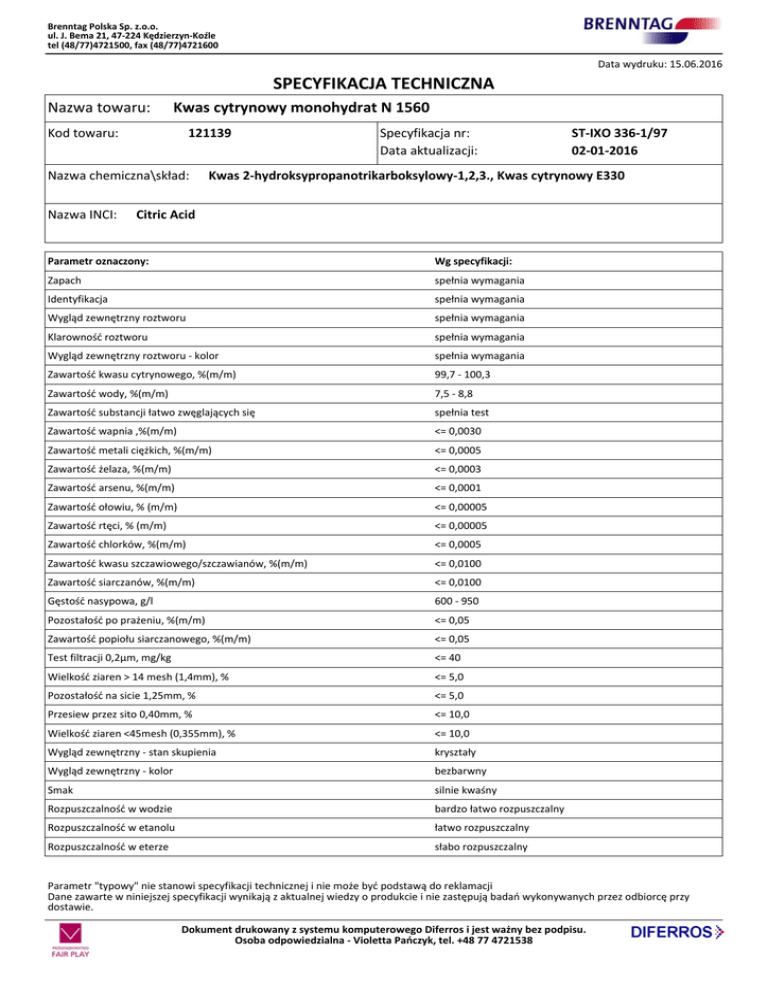 Brenntag Polska Sp. z.o.o. ul. J. Bema 21, 47-224 Kędzierzyn-Koźle tel (48/77)4721500, fax (48/77)4721600 Data wydruku: 15.06.2016 SPECYFIKACJA TECHNICZNA Nazwa towaru: Kwas cytrynowy monohydrat N 1560 Kod towaru: 121139 Nazwa chemiczna\skład: Nazwa INCI: Specyfikacja nr: Data aktualizacji: ST-IXO 336-1/97 02-01-2016 Kwas 2-hydroksypropanotrikarboksylowy-1,2,3., Kwas cytrynowy E330 Citric Acid Parametr oznaczony: Wg specyfikacji: Zapach spełnia wymagania Identyfikacja spełnia wymagania Wygląd zewnętrzny roztworu spełnia wymagania Klarowność roztworu spełnia wymagania Wygląd zewnętrzny roztworu - kolor spełnia wymagania Zawartość kwasu cytrynowego, %(m/m) 99,7 - 100,3 Zawartość wody, %(m/m) 7,5 - 8,8 Zawartość substancji łatwo zwęglających się spełnia test Zawartość wapnia ,%(m/m) <= 0,0030 Zawartość metali ciężkich, %(m/m) <= 0,0005 Zawartość żelaza, %(m/m) <= 0,0003 Zawartość arsenu, %(m/m) <= 0,0001 Zawartość ołowiu, % (m/m) <= 0,00005 Zawartość rtęci, % (m/m) <= 0,00005 Zawartość chlorków, %(m/m) <= 0,0005 Zawartość kwasu szczawiowego/szczawianów, %(m/m) <= 0,0100 Zawartość siarczanów, %(m/m) <= 0,0100 Gęstość nasypowa, g/l 600 - 950 Pozostałość po prażeniu, %(m/m) <= 0,05 Zawartość popiołu siarczanowego, %(m/m) <= 0,05 Test filtracji 0,2µm, mg/kg <= 40 Wielkość ziaren > 14 mesh (1,4mm), % <= 5,0 Pozostałość na sicie 1,25mm, % <= 5,0 Przesiew przez sito 0,40mm, % <= 10,0 Wielkość ziaren <45mesh (0,355mm), % <= 10,0 Wygląd zewnętrzny - stan skupienia kryształy Wygląd zewnętrzny - kolor bezbarwny Smak silnie kwaśny Rozpuszczalność w wodzie bardzo łatwo rozpuszczalny Rozpuszczalność w etanolu łatwo rozpuszczalny Rozpuszczalność w eterze słabo rozpuszczalny Parametr "typowy" nie stanowi specyfikacji technicznej i nie może być podstawą do reklamacji Dane zawarte w niniejszej specyfikacji wynikają z aktualnej wiedzy o produkcie i nie zastępują badań wykonywanych przez odbiorcę przy dostawie. Dokument drukowany z systemu komputerowego Diferros i jest ważny bez podpisu. Osoba odpowiedzialna - Violetta Pańczyk, tel. +48 77 4721538 Brenntag Polska Sp. z.o.o. ul. J. Bema 21, 47-224 Kędzierzyn-Koźle tel (48/77)4721500, fax (48/77)4721600 Opakowania: Wiaderko 20 litrów Worek 25 kg Transport: Przechowywanie: Klasa RID/ADR: nie podlega Kod klasyfikacji ADR: nie dotyczy Nalepka ostrzegawcza: Numer UN: Produkt higroskopijny. Przechowywać w szczelnych, zamkniętych opakowaniach w suchym i chłodnym (<30°C) pomieszczeniu, z dala od silnych zasad i utleniaczy. Unikać pylenia produktu. Unikać kontaktu ze skórą i oczami. Klasa wubuchowosci pyłu: St 0 Okres ważności: 1080 dni Uwagi: *bardzo łatwo rozpuszczalny w wodzie, rozpuszczalny w etanolu (96%), słabo rozpuszczalnyu w eterze; ma silnie kwaśny smak Produkt spełnia wymagania Ph.Eur. / E 330 / USP / FCC. Parametr "typowy" nie stanowi specyfikacji technicznej i nie może być podstawą do reklamacji Dane zawarte w niniejszej specyfikacji wynikają z aktualnej wiedzy o produkcie i nie zastępują badań wykonywanych przez odbiorcę przy dostawie. Dokument drukowany z systemu komputerowego Diferros i jest ważny bez podpisu. Osoba odpowiedzialna - Violetta Pańczyk, tel. +48 77 4721538