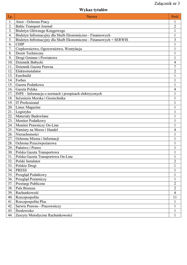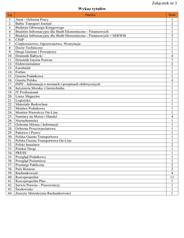 Załącznik nr 3 Wykaz tytułów Lp. 1. 2. 3. 4. 5. 6. 7. 8. 9. 10. 11. 12. 13. 14. 15. 16. 17. 18. 19. 20. 21. 22. 23. 24. 25. 26. 27. 28. 29. 30. 31. 32. 33. 34. 35. 36. 37. 38. 39. 40. 41. 42. 43. 44. Nazwa Atest - Ochrona Pracy Baltic Transport Journal Biuletyn Głównego Księgowego Biuletyn Infromacyjny dla Służb Ekonomiczno - Finansowych Biuletyn Infromacyjny dla Służb Ekonomiczno - Finansowych + SERWIS CHIP Ciepłownictwo, Ogrzewnictwo, Wentylacja Dozór Techniczny Drogi Gminne i Powiatowe Dziennik Bałtycki Dziennik Gazeta Prawna Elektroinstalator Eurobuild Forbes Gazeta Podatkowa Gazeta Polska INPE - Informacja o normach i przepisach elektrycznych Inżynieria Morska i Geotechnika IT Professional Linux Magazine Logistyka Materiały Budowlane Monitor Podatkowy Monitor Prawniczy On-Line Namiary na Morze i Handel Nieruchomości Ochrona Mienia i Informacji Ochrona Przeciwpożarowa Państwo i Prawo Polska Gazeta Transportowa Polska Gazeta Transportowa On-Line Polski Instalator Polskie Drogi PRESS Przegląd Podatkowy Przegląd Pożarniczy Przetargi Publiczne Puls Biznesu Rachunkowość Rzeczpospolita Rzeczpospolita Plus Serwis Prawno - Pracowniczy Środowisko Zeszyty Metodyczne Rachunkowości Ilość 1 2 1 1 3 1 1 1 1 4 7 2 1 1 1 4 1 1 1 1 1 1 1 1 4 1 1 1 1 1 1 2 1 1 1 1 2 2 4 11 1 1 1 1