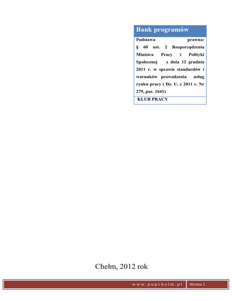 Bank programów Podstawa § 60 ust. Ministra prawna: 2 Rozporządzenia Pracy Społecznej i Polityki z dnia 12 grudnia 2011 r. w sprawie standardów i warunków prowadzenia usług rynku pracy ( Dz. U. z 2011 r. Nr 279, poz. 1641) KLUB PRACY Chełm, 2012 rok www.pupchelm.pl Strona 1 SPIS TREŚCI 1. ASERTYWNOŚĆ ....................................................................................................................................................3 2. METODY POSZUKIWANIA PRACY ..........................................................................................................4 3. RYNEK PRACY ......................................................................................................................................................5 4. DOKUMENTY APLIKACYJNE .....................................................................................................................6 5. AUTOPREZENTACJA ........................................................................................................................................7 6. ROZMOWA KWALIFIKACYJNA ................................................................................................................8 7. DIAGNOZA PREDYSPOZYCJI ZAWODOWYCH ..............................................................................9 8. WŁASNA FIRMA ................................................................................................................................................ 10 9. KOMPUTER JAKO NARZĘDZIE POSZUKIWANIA PRACY .................................................... 11 10. EKOMOMIA SPOŁECZNA ........................................................................................................................... 12 www.pupchelm.pl Strona 2 1. ASERTYWNOŚĆ Temat zajęć: „Asertywność w poszukiwaniu pracy” 1. Czas trwania: 3 godz. zegarowe 2. Sposób organizacji zajęć aktywizacyjnych: Zajęcia jednodniowe warsztatowe odbywające się w siedzibie PUP w Chełmie, Pl. Niepodległości 1 3. Wymagania wstępne dla uczestników zajęć aktywizacyjnych: Osoby bezrobotne/poszukujące pracy zarejestrowane w PUP w Chełmie, które: posiadają deficyt wiedzy i umiejętności w zakresie kształtowania asertywnej postawy w poszukiwaniu pracy. 4. Cel zajęć aktywizacyjnych: 1. Kształtowanie umiejętności stosowania zachowań asertywnych w procesie poszukiwania zatrudnienia. 2. Poznanie przez osoby bezrobotne i poszukujące pracy praw asertywności oraz strategii odmawiania. 5. Program zajęć aktywizacyjnych – główne zagadnienia: 1. Typy zachowań w komunikacji interpersonalnej: asertywność, uległość, agresja. 2.Pojęcie asertywności. 3.Prawa asertywności. 4.Obszary asertywności. 5.Asertywne zachowania: reagowanie na krytykę, przyjmowanie pochwał. 6. Zatrudnianie asertywnych pracowników www.pupchelm.pl Strona 3 2. METODY POSZUKIWANIA PRACY Temat zajęć: „Krok po kroku – jak znaleźć pracę” „Niezbędnik poszukującego pracy, czyli jak oraz gdzie szukać zatrudnienia” 1. Czas trwania: 3.godz. zegarowe 2. Sposób organizacji zajęć aktywizacyjnych: Zajęcia jednodniowe warsztatowe odbywające się w siedzibie PUP w Chełmie, Pl. Niepodległości 1 3. Wymagania wstępne dla uczestników zajęć aktywizacyjnych: Osoby, które nie posiadają doświadczenia w poszukiwaniu pracy, utraciły motywację do poszukiwania pracy w związku z długotrwałym niepowodzeniem w jej poszukiwaniu bądź chcą powrócić na rynek pracy po długim okresie braku aktywności zawodowej, posiadają deficyt wiedzy w zakresie metod i sposobów poszukiwania pracy. 4. Cel zajęć aktywizacyjnych: 1. Poznanie zasad ułatwiających poszukiwanie pracy. 2. Identyfikacja i analiza metod znajdowania ofert pracy. 3. Określenie indywidualnych sposobów poszukiwania ofert zatrudnienia. 5. Program zajęć aktywizacyjnych – główne zagadnienia: 1. Metody poszukiwania pracy. 2. Pracodawca szuka pracownika. www.pupchelm.pl Strona 4 3. RYNEK PRACY Temat zajęć: „ Rynek pracy i ja” 1. Czas trwania: 3 godz. zegarowe 2. Sposób organizacji zajęć aktywizacyjnych: Zajęcia jednodniowe warsztatowe odbywające się w siedzibie PUP w Chełmie, Pl. Niepodległości 1 3. Wymagania wstępne dla uczestników zajęć aktywizacyjnych: Osoby, które nie posiadają doświadczenia w poszukiwaniu pracy, utraciły motywację do poszukiwania pracy w związku z długotrwałym niepowodzeniem w jej poszukiwaniu bądź chcą powrócić na rynek pracy po długim okresie braku aktywności zawodowej, posiadają deficyt wiedzy w zakresie poruszania się po rynku pracy. 4. Cel zajęć aktywizacyjnych: 1. Poznanie zasad które rządzą rynkiem pracy. 2. Poznanie analiz statystycznych. 3. Poznanie zasad ułatwiających poszukiwanie pracy. 5. Program zajęć aktywizacyjnych – główne zagadnienia: 1. Pojęcia związane z rynkiem pracy 2. Lokalny rynek pracy, aktualna statystyka 3. Zawody deficytowe i nadwyżkowe 4. Źródła informacji o miejscach pracy 5. Metody i sposoby poszukiwania pracy www.pupchelm.pl Strona 5 4. DOKUMENTY APLIKACYJNE Temat zajęć: „Profesjonalne i niepowtarzalne - moje dokumenty aplikacyjne” 1. Czas trwania: 3 godz. zegarowe 2. Sposób organizacji zajęć aktywizacyjnych: Zajęcia jednodniowe warsztatowe odbywające się w siedzibie PUP w Chełmie, Pl. Niepodległości 1 3. Wymagania wstępne dla uczestników zajęć aktywizacyjnych: Osoby, które nie posiadają doświadczenia w poszukiwaniu pracy, utraciły motywację do poszukiwania pracy w związku z długotrwałym niepowodzeniem w jej poszukiwaniu bądź chcą powrócić na rynek pracy po długim okresie braku aktywności zawodowej, posiadają deficyt wiedzy w zakresie tworzenia dokumentów aplikacyjnych. 4. Cel zajęć aktywizacyjnych: 1. Poznanie zasad tworzenia dokumentów aplikacyjnych 2. Opracowanie własnego CV /życiorysu zawodowego/ i listu motywacyjnego 3. Uświadomienie powiązania między jakością CV i listu motywacyjnego a zaproszen