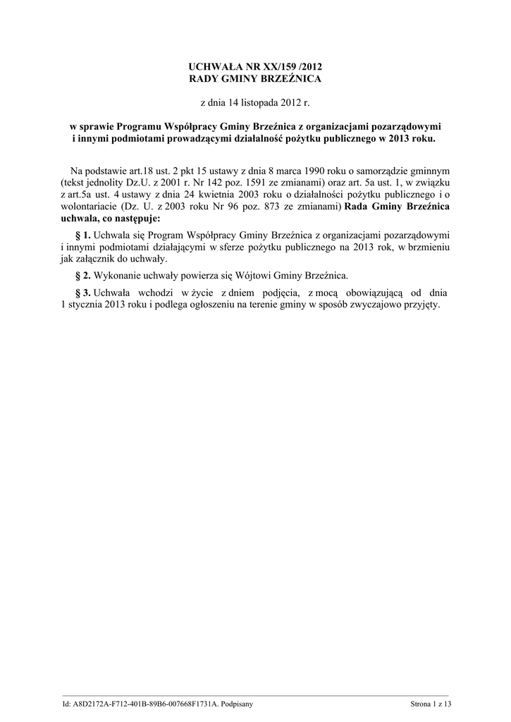 UCHWAŁA NR XX/159 /2012 RADY GMINY BRZEŹNICA z dnia 14 listopada 2012 r. w sprawie Programu Współpracy Gminy Brzeźnica z organizacjami pozarządowymi i innymi podmiotami prowadzącymi działalność pożytku publicznego w 2013 roku. Na podstawie art.18 ust. 2 pkt 15 ustawy z dnia 8 marca 1990 roku o samorządzie gminnym (tekst jednolity Dz.U. z 2001 r. Nr 142 poz. 1591 ze zmianami) oraz art. 5a ust. 1, w związku z art.5a ust. 4 ustawy z dnia 24 kwietnia 2003 roku o działalności pożytku publicznego i o wolontariacie (Dz. U. z 2003 roku Nr 96 poz. 873 ze zmianami) Rada Gminy Brzeźnica uchwala, co następuje: § 1. Uchwala się Program Współpracy Gminy Brzeźnica z organizacjami pozarządowymi i innymi podmiotami działającymi w sferze pożytku publicznego na 2013 rok, w brzmieniu jak załącznik do uchwały. § 2. Wykonanie uchwały powierza się Wójtowi Gminy Brzeźnica. § 3. Uchwała wchodzi w życie z dniem podjęcia, z mocą obowiązującą od dnia 1 stycznia 2013 roku i podlega ogłoszeniu na terenie gminy w sposób zwyczajowo przyjęty. —————————————————————————————————————————————————— Id: A8D2172A-F712-401B-89B6-007668F1731A. Podpisany Strona 1 z 13 Załącznik Nr 1 do Uchwały Nr XX/159 /2012 Rady Gminy Brzeźnica z dnia 14 listopada 2012 r. Program współpracy Gminy Brzeźnica z organizacjami pozarządowymi i innymi podmiotami prowadzącymi działalność pożytku publicznego na 2013 rok. ROZDZIAŁ I – POSTANOWIENIA OGÓLNE. 1. Ilekroć w Programie Współpracy Gminy Brzeźnica z organizacjami pozarządowymi i innymi podmiotami prowadzącymi działalność pożytku publicznego na 2013 rok jest mowa o: 1) Ustawie – należy przez to rozumieć ustawę z dnia 24 kwietnia 2003 r. o działalności pożytku publicznego i o wolontariacie (Dz. U. z 2003 nr 96 poz. 873 ze zm.) 2) Ustawie o sporcie – należy przez to rozumieć ustawę z dnia 25 czerwca 2010 roku o sporcie (Dz.U. z 2010 nr 127 poz. 857 ze zm.) 3) Uchwale – należy przez to rozumieć Uchwałę nr IX/58/2011 Rady Gminy Brzeźnica z dnia 31 sierpnia 2011 roku w sprawie określenia warunków i tryby finansowego wspierania rozwoju sportu w Gminie Brzeźnica. 4) Programie – rozumie się przez to Program Współpracy Gminy Brzeźnica z Organizacjami Pozarządowymi i innymi Podmiotami wymienionymi w art. 3 ust. 3 Ustawy 5) Dotacji – rozumie się przez to dotację w rozumieniu art. 2 pkt 1 ustawy 6) Dotacja na sport – rozumie się przez to dotację w rozumieniu §1 uchwały 7) Środkach publicznych – rozumie się przez to środki w rozumieniu art. 2 pkt 2 Ustawy 8) Ustawie o pomocy społecznej – należy przez to rozumieć ustawę z dnia 12 marca 2004 r. o pomocy społecznej (Dz. U. z 2008 r. nr 115, poz. 728 ze zm.) 9) Organizacji Pozarządowej – rozumie się przez to organizacje niebędące jednostkami sektora finansów publicznych, w rozumieniu przepisów o finansach publicznych i niedziałające w celu osiągnięcia zysku, osoby prawne lub jednostki nieposiadające osobowości prawnej utworzone na podstawie przepisów ustaw, w tym fundacje i stowarzyszenia z zastrzeżeniem art. 3 ust. 4 ustawy 10) Podmiocie – rozumie się przez to osoby prawne i jednostki organizacyjne działające na podstawie przepisów o stosunku Państwa do Kościoła Katolickiego w Rzeczypospolitej Polskiej, o stosunku Państwa do innych kościołów i związków wyznaniowych oraz o gwarancjach wolności sumienia i wyznania, jeżeli ich cele statutowe obejmują prowadzenie działalności pożytku publicznego lub stowarzyszenia jednostek samorządu terytorialnego. —————————————————————————————————————————————————— Id: A8D2172A-F712-401B-89B6-007668F1731A. Podpisany Strona 1 z 13 11) Gminie – rozumie się przez to Gminę Brzeźnica 12) Urzędzie – rozumie się przez to Urząd Gminy Brzeźnica. 13) Konkursie – należy przez to rozumieć otwarty konkurs ofert na dotacje z budżetu Gminy Brzeźnica na realizację zadań Gminy w 2013 roku. 14) Wkładzie własnym finansowym – należy przez to rozumieć niestanowiące dotacji, zaangażowane w realizację zadania środki, których dysponentem jest organizacja. 15) Niefinansowym wkładzie własnym osobowym (wolontariat) - należy przez to rozumieć, odpowiadające świadczeniu pracy na rzecz realizowanego zadania, udokumentowane ochotnicze i bez wynagrodzenia, świadczenie członka organizacji lub wolontariusza na zasadach określonych w ustawie o działalności pożytku publicznego i o wolontariacie. 16) Niefinansowym wkładzie własnym rzeczowym – należy przez to rozumieć nie powodujące kosztów finansowych, udokumentowane wykorzystanie na potrzeby realizacji zadania zasoby rzeczowe organizacji. 2. Program obejmuje współpracę Gminy z organizacjami i podmiotami działającymi na rzecz Gminy Brzeźnica i jej mieszkańców. 3. Program określa cele, formy, zasady i priorytetowe obszary współpracy organu samorządowego z organizacjami pozarządowymi i innymi podmiotami oraz podmioty odpowiedzialne za realizację programu. ROZDZIAŁ II – CEL GŁÓWNY I CELE SZCZEGÓŁOWE PROGRAMU. 1. Podstawowym celem Programu jest kształtowanie demokratycznego ładu społecznego w środowisku lokalnym oraz budowanie społeczeństwa obywatelskiego, poprzez rozwój dialogu i partnerstwa pomiędzy samorządem, a organizacjami pozarządowymi oraz podmiotami, o których mowa w art. 3 ust. 3 ustawy. 2. Cele szczegółowe Programu: 1) zwiększenie aktywności społecznej mieszkańców Gminy Brzeźnica, 2) umocnienie poczucia odpowiedzialności za siebie, swoje otoczenie (wspólnotę lokalną, 3) wypracowanie mechanizmów współpracy samorządu terytorialnego, organizacji, a także umożliwienia im udziału w realizacji zadań własnych samorządu, 4) wzmocnienie pozycji organizacji i zapew