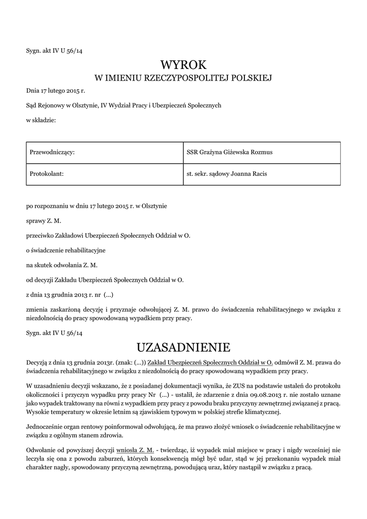 Sygn. akt IV U 56/14 WYROK W IMIENIU RZECZYPOSPOLITEJ POLSKIEJ Dnia 17 lutego 2015 r. Sąd Rejonowy w Olsztynie, IV Wydział Pracy i Ubezpieczeń Społecznych w składzie: Przewodniczący: SSR Grażyna Giżewska Rozmus Protokolant: st. sekr. sądowy Joanna Racis po rozpoznaniu w dniu 17 lutego 2015 r. w Olsztynie sprawy Z. M. przeciwko Zakładowi Ubezpieczeń Społecznych Oddział w O. o świadczenie rehabilitacyjne na skutek odwołania Z. M. od decyzji Zakładu Ubezpieczeń Społecznych Oddział w O. z dnia 13 grudnia 2013 r. nr (...) zmienia zaskarżoną decyzję i przyznaje odwołującej Z. M. prawo do świadczenia rehabilitacyjnego w związku z niezdolnością do pracy spowodowaną wypadkiem przy pracy. Sygn. akt IV U 56/14 UZASADNIENIE Decyzją z dnia 13 grudnia 2013r. (znak: (...)) Zakład Ubezpieczeń Społecznych Oddział w O. odmówił Z. M. prawa do świadczenia rehabilitacyjnego w związku z niezdolnością do pracy spowodowaną wypadkiem przy pracy. W uzasadnieniu decyzji wskazano, że z posiadanej dokumentacji wynika, że ZUS na podstawie ustaleń do protokołu okoliczności i przyczyn wypadku przy pracy Nr (...) - ustalił, że zdarzenie z dnia 09.08.2013 r. nie zostało uznane jako wypadek traktowany na równi z wypadkiem przy pracy z powodu braku przyczyny zewnętrznej związanej z pracą. Wysokie temperatury w okresie letnim są zjawiskiem typowym w polskiej strefie klimatycznej. Jednocześnie organ rentowy poinformował odwołującą, że ma prawo złożyć wniosek o świadczenie rehabilitacyjne w związku z ogólnym stanem zdrowia. Odwołanie od powyższej decyzji wniosła Z. M. - twierdząc, iż wypadek miał miejsce w pracy i nigdy wcześniej nie leczyła się ona z powodu zaburzeń, których konsekwencją mógł być udar, stąd w jej przekonaniu wypadek miał charakter nagły, spowodowany przyczyną zewnętrzną, powodującą uraz, który nastąpił w związku z pracą. W odpowiedzi na odwołanie Zakład Ubezpieczeń Społecznych Oddział w O. wniósł o jego oddalenie, podtrzymując stanowisko, iż zdarzenie z dnia 09 sierpnia 2013 r. nie stanowi wypadku, traktowanego na równi z wypadkiem przy pracy z uwagi na brak przyczyny zewnętrznej. W ocenie organu rentowego wysokie temperatury w okresie letnim są zjawiskiem typowym w polskiej strefie klimatycznej. Organ rentowy wskazał również, że przyznano ubezpieczonej prawo do świadczenia rehabilitacyjnego za okres od dnia 07.02.2014r. do dnia 07.05.2014r. w wysokości 90% podstawy wymiaru oraz od dnia 08.05.2014r. o dnia 05.08.2014r. w wysokości 75 % podstawy wymiaru. Sąd ustalił, co następuje: Odwołująca Z. M. zatrudniona jest w Urzędzie Pocztowym w B. na stanowisku asystentka. Do jej głównych zadań należy obsługa klientów, wszystkich instytucji i awizowanych przesyłek. (dowód: zeznania odwołującej k: 27-27v, 28v) W dniu 9 sierpnia 2013r. odwołująca pracowała, wykonując swoje obowiązki przy okienku nadawczo-oddawczym od godziny 13.00 do 21.00. Od tygodnia przed dniem 9 sierpnia 2013r. panowały na zewnątrz wysokie temperatury powietrza w okolicy 35 stopni. Dokładnie w dniu 09.08.2013r. maksymalna temperatura powietrza w O. wynosiła 26,9 stopni C., w dniu poprzednim tj. 08.08.2013r. – 35,7 stopni. Pomimo otwartych skrzydeł okiennych i drzwiowych w urzędzie pocztowym panowała podobnie , jak na zewnętrz budynku, bardzo wysoka temperatura. Było gorąco i duszno, a w urzędzie nie było zamontowanej klimatyzacji. Jedynym sprzętem chłodzącym był wiatrak, który stał w odległości ok. 30 cm od odwołującej. Około godziny 19.00 odwołująca bardzo źle się poczuła (bolała ją głowa, źle widziała i słyszała). W związku z tym K. R. (1) (współpracownica odwołującej) – poprosiła do swojego okienka wszystkich klientów, obsługiwanych przez odwołującą. W tym czasie w urzędzie pojawiła się jako klientka O. L. – lekarz rodzinny odwołującej, która zauważyła, że odwołująca bardzo źle się czuje. Po szybkiej analizie samopoczucia odwołującej – zaproponowała chorej przewiezienie jej swoim samochodem do Szpitalnego Oddziału Ratunkowego w B.. Odwołująca z uwagi na swój stan zdrowia zgodziła się i około godz. 19.15. została zawieziona na oddział SOR B.. Po przeprowadzonym badaniu odesłano odwołującą na Oddział Wewnętrzny z rozpoznaniem: „niedokrwienny udar mózgu”. Odwołująca przebywała na oddziale od dnia 9 sierpnia do 18 sierpnia 2013r., a następnie skierowano ją na oddział rehabilitacji neurologicznej, na którym przebywała od 19.08.2013r. do 17.09.2013r. Na zwolnieniu lekarskim przebywała od 17.09.2013r. do 17.10.2013r. . Wcześniej nie chorowała na schorzenia sercowo-naczyniowe i nie miała czynników ryzyka sercowo-naczyniowego. (dowód: zeznania odwołującej k: 27-27v, 28v; zeznania świadka K. R. k: 27v-28; zeznania świadka K. W. k: 28; informacja o warunkach atmosferycznych k: 41; historia choroby k: 4-15,55, 56) Zespół powypadkowy, który dokonał w dniach od 18.09.2013r. do 01.10.2013r. ustaleń, dotyczących okoliczności i przyczyn wypadku, jakiemu uległa w dniu 9 sierpnia 2013r. odwołująca stwierdził, że wypadek ten jest wypadkiem przy pracy, ponieważ spełnia wymogi definicji wypadku przy pracy w rozumieniu art. 3 ust. 1 pkt 1 i 2 ustawy z dnia 30.10.2002r. o ubezpieczeniu społecznym z tytułu wypadków przy pracy i chorób zawodowych. Zdarzenie to było zdarzeniem nagłym, mający związek z wykonywaną przez odwołująca pracą i było spowodowane przyczyną zewnętrzną (wysoka temperatura powietrza w granicach 35 stopni Celsjusza), powodującą uraz. Pracownik wykonywał zwykłe czynności na rzecz pracodawcy. (dowód: akta rentowe (...) – Protokół Nr (...) ustalenia okoliczności i przyczyn wypadku przy pracy k: 3) W toku procesu - Sąd dopuścił dowód z opinii biegłego neurologa H. F., który po zapoznaniu się z aktami sprawy, dokumentacją lekarską, i zbadaniu odwołującej uznał, że od