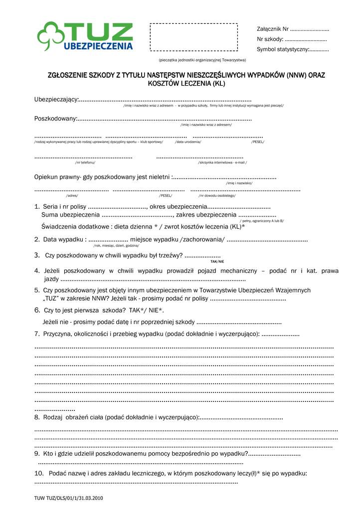 Załącznik Nr …………………….. Nr szkody: ………………………. Symbol statystyczny:…………. (pieczątka jednostki organizacyjnej Towarzystwa) ZGŁOSZENIE SZKODY Z TYTUŁU NASTĘPSTW NIESZCZĘŚLIWYCH WYPADKÓW (NNW) ORAZ KOSZTÓW KOSZTÓW LECZENIA (KL) Ubezpieczający:............................................................................................... /imię i nazwisko wraz z adresem - w przypadku szkoły, firmy lub innej instytucji wymagana jest pieczęć/ Poszkodowany:................................................................................................ /imię i nazwisko wraz z adresem/ ..................................... ............................................. ………………………………… /rodzaj wykonywanej pracy lub rodzaj uprawianej dyscypliny sportu – klub sportowy/ ...................................................... /data urodzenia/ /PESEL/ ................................................ /nr telefonu/ /skrzynka internetowa - e-mail / Opiekun prawny- gdy poszkodowany jest nieletni :......................................................... /imię i nazwisko/ ......................................... …………………………………. ……………………………………………………. /adres/ /PESEL/ /nr dowodu osobistego/ 1. Seria i nr polisy ................................, okres ubezpieczenia................................... Suma ubezpieczenia ......................................., zakres ubezpieczenia ..................... / pełny, ograniczony A lub B/ Świadczenia dodatkowe : dieta dzienna * / zwrot kosztów leczenia (KL)* 2. Data wypadku : ...................... miejsce wypadku /zachorowania/ ……………………………………… /rok, miesiąc, dzień, godzina/ 3. Czy poszkodowany w chwili wypadku był trzeźwy? .................... TAK/NIE 4. Jeżeli poszkodowany w chwili wypadku prowadził pojazd mechaniczny – podać nr i kat. prawa jazdy ...................................................................................................... 5. Czy poszkodowany jest objęty innym ubezpieczeniem w Towarzystwie Ubezpieczeń Wzajemnych „TUZ” w zakresie NNW? Jeżeli tak - prosimy podać nr polisy .......................................... 6. Czy to jest pierwsza szkoda? TAK*/ NIE*. Jeżeli nie - prosimy podać datę i nr poprzedniej szkody ............................................... 7. Przyczyna, okoliczności i przebieg wypadku (podać dokładnie i wyczerpująco): ..................... ……………………………………………………………………………………………………………………………………… ……………………………………………………………………………………………………………………………………… ……………………………………………………………………………………………………………………………………… ……………………………………………………………………………………………………………………………………… ……………………………………………………………………………………………………………………………………… ……………………………………………………………………………………………………………………………………… ……………………………………………………………………………………………………………………………………… ………………… 8. Rodzaj obrażeń ciała (podać dokładnie i wyczerpująco):.............................................. …………………………………………………………………………………………………………………………………………………… …………………………………………………………………………………………………………………………………………………… ………………………………………………………………………………………………………………………………………………… 9. Kto i gdzie udzielił poszkodowanemu pomocy bezpośrednio po wypadku?............................. ................................................................................................................. 10. Podać nazwę i adres zakładu leczniczego, w którym poszkodowany leczy(ł)* się po wypadku: ................................................................................................................ TUW TUZ/DLS/01/1/31.03.2010 11. Przewidywany termin zakończenia leczenia ............., okres niezdolności do pracy ............. 12. Czy wypadek zgłoszono na Policji? ..................................................................... /jednostka, miejscowość, data zgłoszenia/ 13` Świadkowie wypadku (imię, nazwisko, adres): ......................................................... ................................................................................................................. _______________________________________________________________________________________________________________________________________________________________________________________________________________________________________________ Dotyczy potwierdzenia ubezpieczenia wypełnia: - szkoła*szkoła*- firma*firma*- inna instytucja ubezpieczająca* Oświadczamy, że poszkodowany jest objęty ubezpieczeniem grupowym NNW zgodnie z polisą nr ............................ i figuruje pod pozycją nr .................... wykazu imiennego na sumę ubezpieczenia zł ............... Składka w zł ............... opłacona dnia ............................ 200.......roku. Wypadek został uznany*/nie uznany* za wypadek w pracy * – w drodze do pracy* – w drodze z pracy* ........................