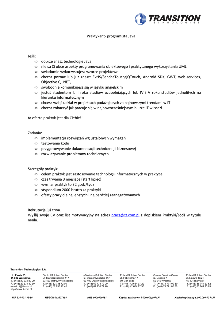 Praktykant- programista Java Jeśli: • • • • • • • • dobrze znasz technologie Java, nie sa Ci obce aspekty programowania obiektowego i praktycznego wykorzystania UML swiadomie wykorzystujesz wzorce projektowe chcesz poznac lub juz znasz: ExtJS/SenchaTouch/jQTouch, Android SDK, GWT, web-services, Objective C, .NET, swobodnie komunikujesz się w języku angielskim jesteś studentem I, II roku studiów uzupełniających lub IV i V roku studiów jednolitych na kierunku informatycznym chcesz wziąć udział w projektach podażajacych za najnowszymi trendami w IT chcesz zobaczyć jak pracuje się w najnowocześniejszym biurze IT w Łodzi ta oferta praktyk jest dla Ciebie!! Zadania: • implementacja rozwiązań wg ustalonych wymagań • testowanie kodu • przygotowywanie dokumentacji technicznej i biznesowej • rozwiazywanie problemow technicznych Szczegóły praktyk: • celem praktyk jest zastosowanie technologii informatycznych w praktyce • czas trwania 3 miesiące (start lipiec) • wymiar praktyk to 32 godz/tydz • stypendium 2000 brutto za praktyki • oferty pracy dla najlepszych i najbardziej zaanagażowanych Rekrutacja już trwa. Wyślij swoje CV oraz list motywacyjny na adres [email protected] z dopiskiem Praktyki/Łódź w tytule maila. Transition Technologies S.A. Ul. Pawia 55 01-030 Warszawa T.: (+48) 22 331 80 20 F.: (+48) 22 331 80 30 e-mail: [email protected] http://www.tt.com.pl NIP 526-021-35-86 Control Solution Center ul. Staroprzygodzka 117 63-400 Ostrów Wielkopolski T.: (+48) 62 738 72 00 F.: (+48) 62 738 72 40 REGON 012527198 eBusiness Solution Center ul. Staroprzygodzka 117 63-400 Ostrów Wielkopolski T.: (+48) 62 738 72 00 F.: (+48) 62 738 72 40 KRS 0000020081 Poland Solution Center ul. Fabryczna 17 90- 344 Łódź T.: (+48) 42 664 97 20 F.: (+48) 42 664 97 30 Control Solution Center ul. Liskego 7 50-345 Wrocław T.: (+48) 71 771 00 50 F.: (+48) 71 771 00 50 Kapitał zakładowy 6.000.000,00PLN Poland Solution Center ul. Lipowa 19/21 15-424 Białystok T.: (+48) 85 744 23 62 F.: (+48) 85 744 23 63 Kapitał wpłacony 6.000.000,00 PLN
