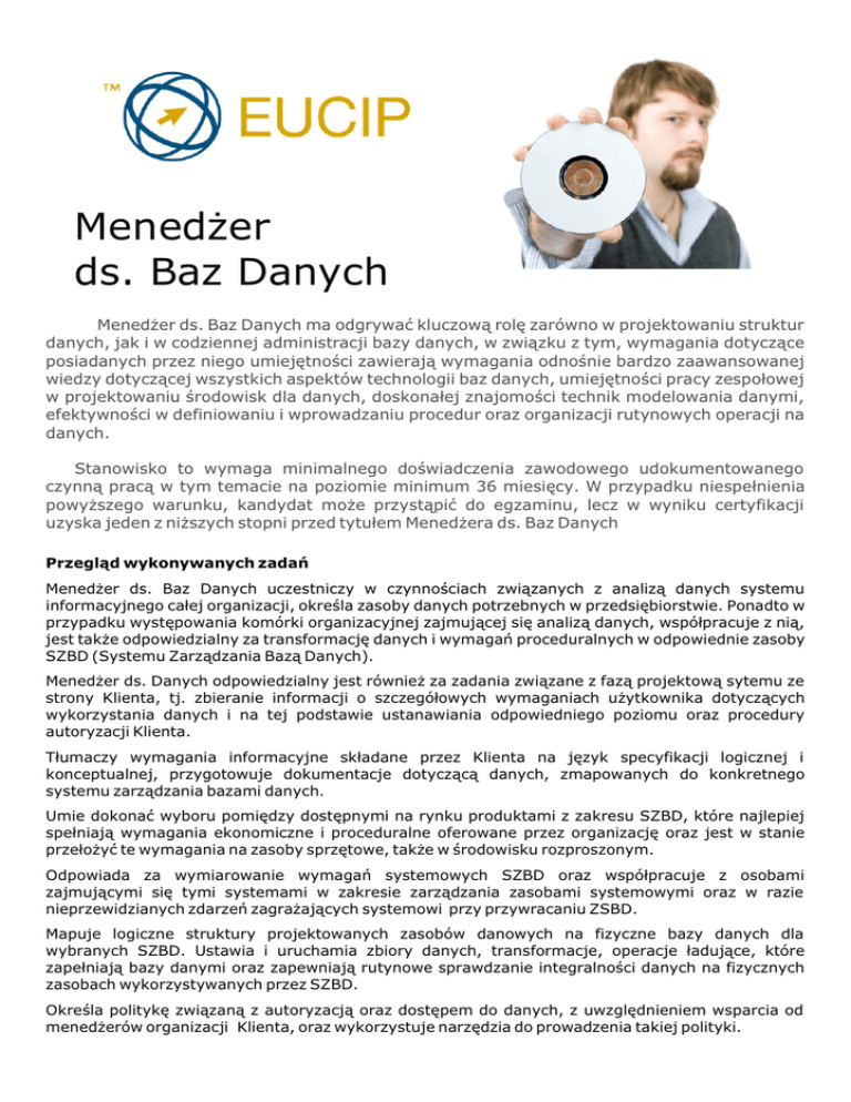 Mened¿er ds. Baz Danych Mened¿er ds. Baz Danych ma odgrywaæ kluczow¹ rolê zarówno w projektowaniu struktur danych, jak i w codziennej administracji bazy danych, w zwi¹zku z tym, wymagania dotycz¹ce posiadanych przez niego umiejêtnoœci zawieraj¹ wymagania odnoœnie bardzo zaawansowanej wiedzy dotycz¹cej wszystkich aspektów technologii baz danych, umiejêtnoœci pracy zespo³owej w projektowaniu œrodowisk dla danych, doskona³ej znajomoœci technik modelowania danymi, efektywnoœci w definiowaniu i wprowadzaniu procedur oraz organizacji rutynowych operacji na danych. Stanowisko to wymaga minimalnego doœwiadczenia zawodowego udokumentowanego czynn¹ prac¹ w tym temacie na poziomie minimum 36 miesiêcy. W przypadku niespe³nienia powy¿szego warunku, kandydat mo¿e przyst¹piæ do egzaminu, lecz w wyniku certyfikacji uzyska jeden z ni¿szych stopni przed tytu³em Mened¿era ds. Baz Danych Przegl¹d wykonywanych zadañ Mened¿er ds. Baz Danych uczestniczy w czynnoœciach zwi¹zanych z analiz¹ danych systemu informacyjnego ca³ej organizacji, okreœla zasoby danych potrzebnych w przedsiêbiorstwie. Ponadto w przypadku wystêpowania komórki organizacyjnej zajmuj¹cej siê analiz¹ danych, wspó³pracuje z ni¹, jest tak¿e odpowiedzialny za transformacjê danych i wymagañ proceduralnych w odpowiednie zasoby SZBD (Systemu Zarz¹dzania Baz¹ Danych). Mened¿er ds. Danych odpowiedzialny jest równie¿ za zadania zwi¹zane z faz¹ projektow¹ sytemu ze strony Klienta, tj. zbieranie informacji o szczegó³owych wymaganiach u¿ytkownika dotycz¹cych wykorzystania danych i na tej podstawie ustanawiania odpowiedniego poziomu oraz procedury autoryzacji Klienta. T³umaczy wymagania informacyjne sk³adane przez Klienta na jêzyk specyfikacji logicznej i konceptualnej, przygotowuje dokumentacje dotycz¹c¹ danych, zmapowanych do konkretnego systemu zarz¹dzania bazami danych. Umie dokonaæ wyboru pomiêdzy dostêpnymi na rynku produktami z zakresu SZBD, które najlepiej spe³niaj¹ wymagania ekonomiczne i proceduralne oferowane przez organizacjê oraz jest w stanie prze³o¿yæ te wymagania na zasoby sprzêtowe, tak¿e w œrodowisku rozproszonym. Odpowiada za wymiarowanie wymagañ systemowych SZBD oraz wspó³pracuje z osobami zajmuj¹cymi siê tymi systemami w zakresie zarz¹dzania zasobami systemowymi oraz w razie nieprzewidzianych zdarzeñ zagra¿aj¹cych systemowi przy przywracaniu ZSBD. Mapuje logiczne struktury projektowanych zasobów danowych na fizyczne bazy danych dla wybranych SZBD. Ustawia i uruchamia zbiory danych, transformacje, operacje ³aduj¹ce, które zape³niaj¹ bazy danymi oraz zapewniaj¹ rutynowe sprawdzanie integralnoœci danych na fizycznych zasobach wykorzystywanych przez SZBD. Okreœla politykê zwi¹zan¹ z autoryzacj¹ oraz dostêpem do danych, z uwzglêdnieniem wsparcia od mened¿erów organizacji Klienta, oraz wykorzystuje narzêdzia do prowadzenia takiej polityki. Zajmuje siê pielêgnowaniem baz danych, integracj¹ danych poprzez projektowanie oraz przeprowadzanie procedur tworzenia kopii zapasowych wg szczegó³owych planów. Przygotowuje plany dzia³ania na nieprzewidziane zdarzenia by zapewniæ jasne procedury wznawiania pracy systemu i odzyskiwania danych. Namierza oraz monitoruje zadania wykonywane przez SZBD poprzez wykorzystanie przygotowanych do tych celów danych. Korzysta z dostêpnych narzêdzi komputerowych w celu sprawdzenia u¿ytecznoœci posiadanych danych, jest w stanie skonfigurowaæ i udoskonalaæ struktury danych fizycznych, aby zapewniæ ci¹g³e ulepszenie wykonywanych operacji danowych. Uczestniczy w analizie danych, dobranej do celów biznesowych danej organizacji poprzez przygotowanie hurtowni danych oraz ³¹czy Ÿród³a informacyjne aby przeprowadzaæ ró¿ne procesy zwi¹zane z przeszukiwaniem systemów danych. Okreœla techniki magazynowania danych, które wspieraj¹ analizê business intelligence oraz dostarczaj¹ do organizacji struktury danowe (wyodrêbnione z SZBD) u³atwiaj¹ce proces wyszukiwania konkretnych danych. Przeprowadza statystyczna analizê danych, planuje operacje typu data mining na danych, które mo¿na wyodrêbniæ z SZBD. Zajmuje siê przetwarzaniem, transformacj¹ danych, które przychodz¹ w formie niestrukturalnej lub w czêœciowo strukturalnej (format XML) w formaty umo¿liwiaj¹ce ich wykorzystanie. W miarê mo¿liwoœci przeprowadza konwersjê danych w taki sposób, aby pasowa³y do struktur SZBD, przeprowadza transformacjê danych aby zapewniæ najlepsz¹ z mo¿liwych analizê danych. Kluczowe umiejêtnoœci behawioralne Zawód Mened¿era ds. Baz Danych wymaga innowacyjnoœci, dyspozycyjnoœci oraz umiejêtnoœci myœlenia koncepcyjnego i analitycznego, szczególnie w stresuj¹cych warunkach. Wra¿liwoœæ organizacyjna (z ang. organisational sensitivity), umiejêtnoœæ logicznego myœlenia, wyobraŸnia oraz aktywnoœæ jest konieczna do tworzenia oraz oceny rozwi¹zañ informatycznych. Umiejêtnoœæ zwracania uwagi na szczegó³y, dzia³ania sprzyjaj¹ce realizacji postawionych celów, dyspozycyjnoœæ, determinacja, zdolnoœci planowania i kontroli s¹ wymagane do uzyskiwania mierzalnych efektów w pracy. Innymi, równie wa¿nymi umiejêtnoœciami potencjalnego Mened¿era ds. Baz Danych jest zdolnoœæ komunikowania siê z Klientami oraz pracownikami, zarówno werbalnie jak i w formie pisemnej, umiejêtnoœæ pracy zespo³owej, efektywnoœæ w pozyskiwaniu informacji, jak równie¿ umiejêtnoœæ planowania, organizowania, podejmowania decyzji technicznych, dostarczania wskazówek dla potencjalnych u¿ytkowników SZBD oraz ró¿nego rodzaju dodatkowych informacji u³atwiaj¹cych ich wykorzystanie. Polskie Towarzystwo Informatyczne Zarz¹d G³ówny Al. Solidarnoœci 82A m.5, 01-003 Warszawa tel: +48 22 636 89 87 fax: +48 22 838 47 05 www.eucip.pl [email protected]