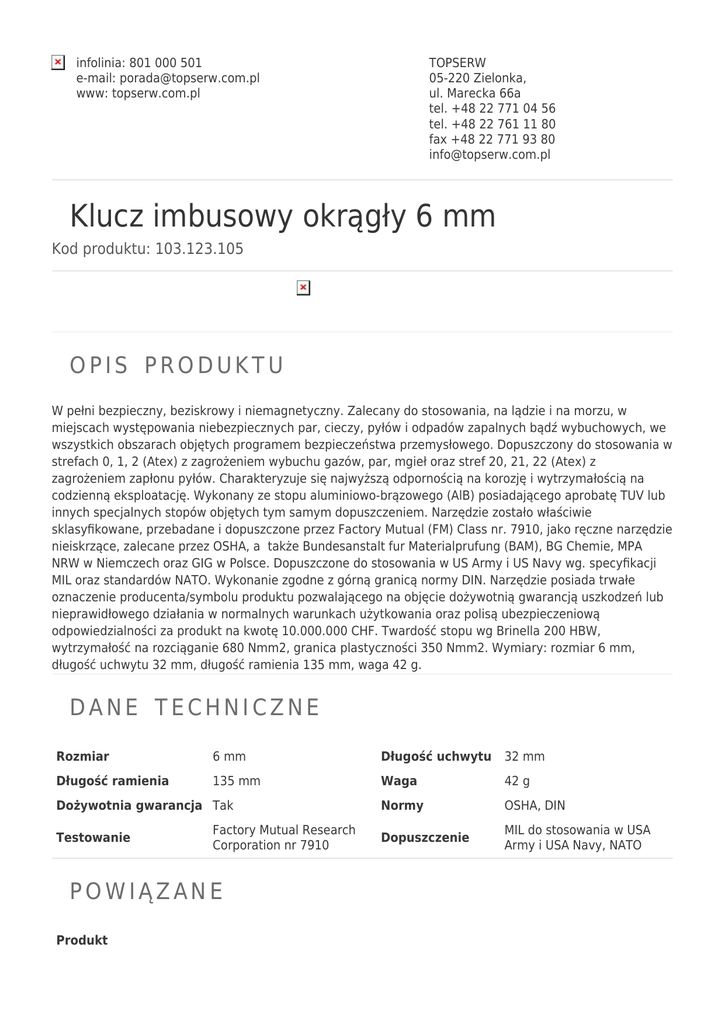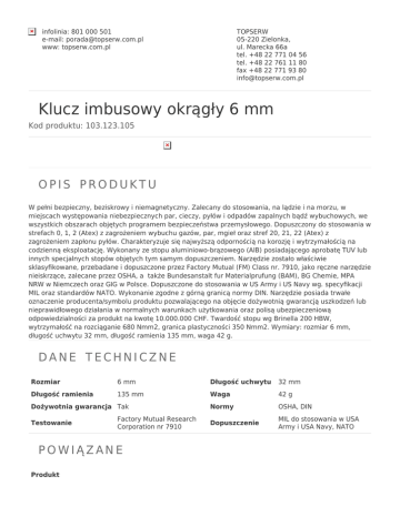infolinia: 801 000 501 e-mail: [email protected] www: topserw.com.pl TOPSERW 05-220 Zielonka, ul. Marecka 66a tel. +48 22 771 04 56 tel. +48 22 761 11 80 fax +48 22 771 93 80 [email protected] Klucz imbusowy okrągły 6 mm Kod produktu: 103.123.105 OPIS PRODUKTU W pełni bezpieczny, beziskrowy i niemagnetyczny. Zalecany do stosowania, na lądzie i na morzu, w miejscach występowania niebezpiecznych par, cieczy, pyłów i odpadów zapalnych bądź wybuchowych, we wszystkich obszarach objętych programem bezpieczeństwa przemysłowego. Dopuszczony do stosowania w strefach 0, 1, 2 (Atex) z zagrożeniem wybuchu gazów, par, mgieł oraz stref 20, 21, 22 (Atex) z zagrożeniem zapłonu pyłów. Charakteryzuje się najwyższą odpornością na korozję i wytrzymałością na codzienną eksploatację. Wykonany ze stopu aluminiowo-brązowego (AlB) posiadającego aprobatę TUV lub innych specjalnych stopów objętych tym samym dopuszczeniem. Narzędzie zostało właściwie sklasyfikowane, przebadane i dopuszczone przez Factory Mutual (FM) Class nr. 7910, jako ręczne narzędzie nieiskrzące, zalecane przez OSHA, a także Bundesanstalt fur Materialprufung (BAM), BG Chemie, MPA NRW w Niemczech oraz GIG w Polsce. Dopuszczone do stosowania w US Army i US Navy wg. specyfikacji MIL oraz standardów NATO. Wykonanie zgodne z górną granicą normy DIN. Narzędzie posiada trwałe oznaczenie producenta/symbolu produktu pozwalającego na objęcie dożywotnią gwarancją uszkodzeń lub nieprawidłowego działania w normalnych warunkach użytkowania oraz polisą ubezpieczeniową odpowiedzialności za produkt na kwotę 10.000.000 CHF. Twardość stopu wg Brinella 200 HBW, wytrzymałość na rozciąganie 680 Nmm2, granica plastyczności 350 Nmm2. Wymiary: rozmiar 6 mm, długość uchwytu 32 mm, długość ramienia 135 mm, waga 42 g. DANE TECHNICZNE Rozmiar 6 mm Długość uchwytu 32 mm Długość ramienia 135 mm Waga 42 g Normy OSHA, DIN Dopuszczenie MIL do stosowania w USA Army i USA Navy, NATO Dożywotnia gwarancja Tak Testowanie Factory Mutual Research Corporation nr 7910 POWIĄZANE Produkt Klucz imbusowy okrągły 2 mm klucz imbusowy okrągły 2.5 mm Klucz imbusowy okrągły 3 mm Klucz imbusowy okrągły 4 mm Klucz imbusowy okrągły 5 mm Klucz imbusowy okrągły 6 mm Klucz imbusowy okrągły 7 mm Klucz imbusowy okrągły 8 mm Klucz imbusowy okrągły 9 mm Klucz imbusowy okrągły 10 mm