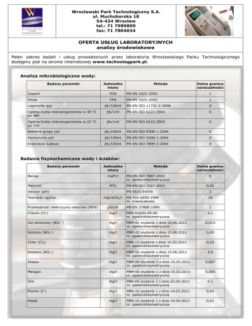 Wrocławski Park Technologiczny S.A. ul. Muchoborska 18 54-424 Wrocław tel.: 71 7985800 fax: 71 7804034 OFERTA USŁUG LABORATORYJNYCH analizy środowiskowe Pełen zakres badań i usług prowadzonych przez laboratoria Wrocławskiego Parku Technologicznego dostępny jest na stronie internetowej www.technologpark.pl. Analiza mikrobiologiczna wody: Badany parametr Jednostka miary Metoda Dolna granica oznaczalności Zapach TON PN-EN 1622:2003 1 Smak TFN PN-EN 1622:2003 1 PN-EN ISO 11731-2:2008 0 Legionella spp. jtk/100ml o Ogólna liczba mikroorganizmów w 36 C po 48h jtk/1ml PN-EN ISO 6222:2004 0 Ogólna liczba mikroorganizmów w 22 oC po 72h jtk/1ml PN-EN ISO 6222:2004 0 Bakterie grupy coli jtk/100ml PN-EN ISO 9308-1:2004 0 Escherichia coli jtk/100ml PN-EN ISO 9308-1:2004 0 Enterokoki kałowe jtk/100ml PN-EN ISO 7899-2:2004 0 Badania fizykochemiczne wody i ścieków: Badany parametr Barwa Jednostka miary mgPt/l Mętność NTU Odczyn (pH) Twardość ogólna Przewodność elektryczna właściwa (PEW) - Metoda PN-EN ISO 7887:2002 m. spektrofotometryczna PN-EN ISO 7027:2003 PN-90/C-04540 Dolna granica oznaczalności 5 0,02 2 mgCaCO3/l PN-ISO 6059:1999 m. miareczkowa 10 µS/cm PN-EN 27888:1999 1 - Chlorki (Cl ) mg/l PBN-91820-09.08 m. spektrofotometryczna Jon amonowy (NH4+ ) mg/l PBM-01 wydanie z dnia 15.06.2011 m. spektrofotometryczna 0,013 Azotyny (NO2-) mg/l PBM-03 wydanie z dnia 15.06.2011 m. spektrofotometryczna 0,05 Chlor (Cl2) mg/l PBN-15 wydanie z dnia 16.03.2011 m. spektrofotometryczna 0,02 Azotany (NO3-) mg/l PBM-02 wydanie z dnia 15.06.2011 m. spektrofotometryczna 4,0 Żelazo mg/l PBM-04 wydanie 1 z dnia 15.03.2011 m. spektrofotometryczna 0,007 Mangan mg/l PBM-05 wydanie 1 z dnia 15.03.2011 m. spektrofotometryczna 0,005 Glin mg/l PBN-09 wydanie 2 z dnia 22.04.2011 m. spektrofotometryczna 0,1 Fluorki (F-) mg/l PBN-10 wydanie 1 z dnia 14.03.2011 m. spektrofotometryczna 0,05 Miedź mg/l PBN-14 wydanie 1 z dnia 19.04.2011 m. spektrofotometryczna 0,01 0,1 Zasadowość ogólna mgCaCO3/l PN-EN ISO 9963-1:2001 / Ap1:2004 m. miareczkowa 0,4 Kwasowość ogólna mval/l PBW-20 wydanie z dnia 17.10.2012 m. miareczkowa 0,1 0,5 Siarczany (SO42-) mg/l PN-C-04566-10:1979 m. spektrofotometryczna Dwutlenek węgla agresywny mg/l PN-74/C-04547.03 m. miareczkowa 1 Dwutlenek węgla wolny (CO2) mg/l PN-74/C-04547/01 m. miareczkowa 2,2 Wapń mg/l PN-ISO 6058:1999 m. miareczkowa 2 mg/l Metoda obliczeniowa 8 mval/l Metoda obliczeniowa 0,01 Magnez - Zawartość wodorowęglanów (HCO3 ) Zawiesina ogólna mg/l Korozyjność wody 2 PN-72/C-04609 ChZT Ortofosforany (PO4 PN-EN 872:2007 3- ) mg/l PN-ISO 6060:2006 m. miareczkowa mg/l PN-EN ISO 6878:2006 m. spektrofotometryczna 30,0 0,5 Ołów Chrom µg/l 4,0 Kadm µg/l 0,30 Miedź mg/l 0,0020 Sód mg/l 1,0 PN-EN ISO 17294-2:2006 m. spektrometrii mas z plazmą wzbudzoną indukcyjnie (ICP-MS) Glin µg/l Żelazo µg/l Arsen Antymon µg/l 1,0 Nikiel µg/l 5,0 Selen µg/l 2,0 Bor µg/l 0,050 Rtęć mg/l Tryt [Bq/l] PN-EN 1483:2007 KJ-I-5.4-153 10,0 60,0 0,050 40,0 Benzyna suma (węglowodory C6-C12) mg/l PN-EN ISO 15680:2008 m. chromatografii gazowej 0,070 Pestycydy mg/l PN-EN ISO 6468:2002 m. chromatografii gazowej - BZT5 mg/l PN-EN 1899-1:2002 PN-EN 1899-2:2002 0,5 Węglowodory ropopochodne (Indeks oleju mineralnego) mg/l PN-EN ISO 9377-2:2003 metoda chromatografii gazowej z detekcją płomieniowojonizacyjną (GCFID) 0,1 1,2 Dichloroetan µg/l PN-EN ISO 15680:2008 Zapraszamy do skorzystania z naszej oferty! KONTAKT: Kierownik Działu Laboratoriów Badawczo-Rozwojowych dr inż. Agnieszka Kowalska tel. 71 7985802 e-mail: [email protected]