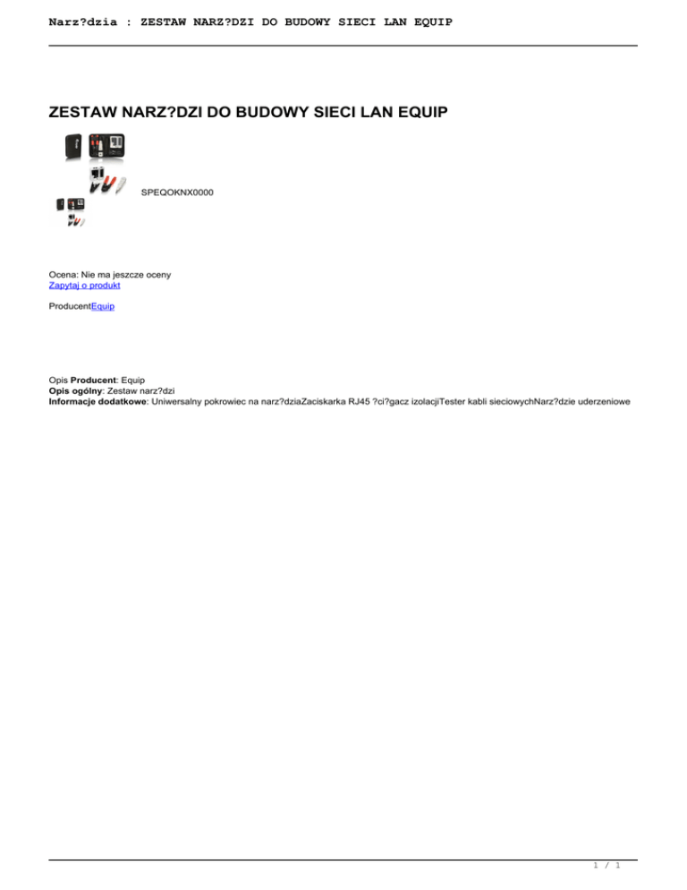 Narz?dzia : ZESTAW NARZ?DZI DO BUDOWY SIECI LAN EQUIP ZESTAW NARZ?DZI DO BUDOWY SIECI LAN EQUIP SPEQOKNX0000 Ocena: Nie ma jeszcze oceny Zapytaj o produkt ProducentEquip Opis Producent: Equip Opis ogólny: Zestaw narz?dzi Informacje dodatkowe: Uniwersalny pokrowiec na narz?dziaZaciskarka RJ45 ?ci?gacz izolacjiTester kabli sieciowychNarz?dzie uderzeniowe 1 / 1 Powered by TCPDF (www.tcpdf.org)