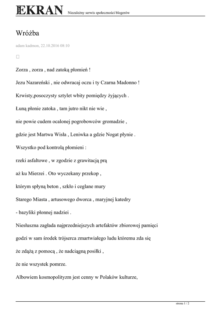 Niezależny serwis społeczności blogerów Wróżba adam kadmon, 22.10.2016 08:10 Zorza , zorza , nad zatoką płomień ! Jezu Nazareński , nie odwracaj oczu i ty Czarna Madonno ! Krwisty,posoczysty sztylet wbity pomiędzy żyjących . Łuną płonie zatoka , tam jutro nikt nie wie , nie powie cudem ocalonej pogrobowców gromadzie , gdzie jest Martwa Wisła , Leniwka a gdzie Nogat płynie . Wszystko pod kontrolą płomieni : rzeki asfaltowe , w zgodzie z grawitacją prą aż ku Mierzei . Oto wyczekany przekop , którym spłyną beton , szkło i ceglane mury Starego Miasta , artusowego dworca , maryjnej katedry - bazyliki płonnej nadziei . Niesłuszna zagłada najprzedniejszych artefaktów zbiorowej pamięci godzi w sam środek trójserca zmartwiałego ludu któremu zda się że zdążą z pomocą , że nadciągną posiłki , że nie wszystek pomrze. Albowiem kosmopolityzm jest cenny w Polaków kulturze, strona 1 / 2 Niezależny serwis społeczności blogerów jak najbardziej z resztą , co czuć było , słychać i widać jeszcze wczoraj . Jeno nie widziano polskich pancerników , nie wzlecą pociski odpłaty , nie przybędą na czas ratunku zuchwałe korwety. Zasiano prawo mroku , prawem bezprawia ,odwetem . Miazga dokoła , świat lokalny spowity wyziewem tłamszącym nadzieję. Ostatnią jak ostatni oddech. Mało zostanie trójmieszczan , prawie nic z substancji , ich dorobku pokoleń . Dopadnie rykoszet Wenedię opodal trwającą odwiecznie , niepokorną wobec obcych i swojskich żywiołów. Co tchu uciekajcie , Dzieci. ! ______________________________________________________________________ Powyższy tekst ” chodził ” za mną krok w krok , burząc mi wątłe poczucie ładu wewnętrznego. Wreszcie się doigrał ! strona 2 / 2 Powered by TCPDF (www.tcpdf.org)
