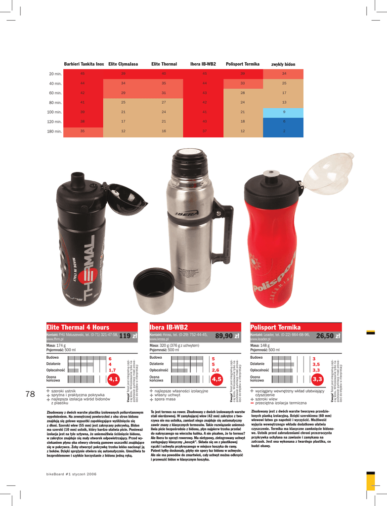 Ibera IB-WB2 Polisport Termika zwykły bidon 20 min. 45 39 40 45 39 34 40 min. 44 34 35 44 33 25 60 min. 42 29 31 43 28 17 80 min. 41 25 27 42 24 13 100 min. 39 21 24 41 21 9 120 min. 38 17 21 40 18 6 180 min. 35 12 16 37 12 2 Elite Thermal 4 Hours Kontakt: FHU Matuszewski, tel. (0-71) 321-47-58, www.fhm.pl Ibera IB-WB2 119 zł Działanie Opłacalność Ocena końcowa 6 4 1,7 4,1 szeroki ustnik sprytna i praktyczna pokrywka najlepsza izolacja wśród bidonów z plastiku Budowa Zbudowany z dwóch warstw plastiku izolowanych poliuretanowym wypełnieniem. Na zewnętrznej powierzchni z obu stron bidonu znajdują się gelowe wypustki zapobiegające wyśliźnięciu się z dłoni. Szeroki wlew (55 mm) jest zakręcany pokrywką. Bidon ma szeroki (10 mm) ustnik, który bardzo ułatwia picie. Ponieważ izolacja jest na tyle sztywna, że uniemożliwia ściśnięcie bidonu, w zakrętce znajduje się mały otworek odpowietrzający. Przed wyciekaniem płynu oba otwory chronią gumowe uszczelki znajdujące się w pokrywce. Żeby otworzyć pokrywkę trzeba lekko nacisnąć ją z boków. Dzięki sprężynie otwiera się automatycznie. Umożliwia to bezproblemowe i szybkie korzystanie z bidonu jedną ręką. bi k eBoar d #1 styczeń 2006 Polisport Termika 89,90 zł Masa: 320 g (376 g z uchwytem) Pojemność: 500 ml Uwaga! Tekst jest integralną częścią testu. Wnioskowanie tylko na podstawie punktacji może prowadzić do błędów w interpretacji Budowa Kontakt: Kross, tel. (0-29) 752-44-45, www.kross.pl Opłacalność 5 5 2,6 Ocena końcowa 4,5 Działanie najlepsze własności izolacyjne własny uchwyt spora masa Kontakt: Leader, tel. (0-22) 664-68-96, www.leader.pl 26,50 zł Masa: 148 g Pojemność: 500 ml Budowa Uwaga! Tekst jest integralną częścią testu. Wnioskowanie tylko na podstawie punktacji może prowadzić do błędów w interpretacji Masa: 174 g Pojemność: 500 ml 78 Elite Thermal To jest termos na rower. Zbudowany z dwóch izolowanych warstw stali nierdzewnej. W zamykającej wlew (42 mm) zakrętce z tworzywa nie ma ustnika, zamiast niego znajduje się automatyczny zawór znany z klasycznych termosów. Takie rozwiązanie uniemożliwia picie bezpośrednio z bidonu, płyn najpierw trzeba przelać do nakręcanego na wierzchu kubka. A nie pisałem, że to termos? Ale Ibera to sprzęt rowerowy. Ma nietypowy, zintegrowany uchwyt zastępujący klasyczny „koszyk”. Składa się on z plastikowej rączki i uchwytu przykręcanego w miejsce koszyka do ramy. Patent byłby doskonały, gdyby nie spory luz bidonu w uchwycie. Ale nie ma powodów do zmartwień, cały uchwyt można odkręcić i przewozić bidon w klasycznym koszyku. Opłacalność 3 3,5 3,3 Ocena końcowa 3,3 Działanie wyciągany wewnętrzny wkład ułatwiający czyszczenie szeroki wlew przeciętna izolacja termiczna Uwaga! Tekst jest integralną częścią testu. Wnioskowanie tylko na podstawie punktacji może prowadzić do błędów w interpretacji Barbieri Tankita Inox Elite ClymaJasa Zbudowany jest z dwóch warstw tworzywa przedzielonych pianką izolacyjną. Dzięki szerokiemu (60 mm) wlewowi łatwo go napełnić i wyczyścić. Możliwość wyjęcia wewnętrznego wkładu dodatkowo ułatwia czyszczenie. Termika ma klasyczne zamknięcie bidonowe. Ustnik przed zabrudzeniami chroni przezroczysta przykrywka uchylana na zawiasie i zamykana na zatrzask. Jest ona wykonana z twardego plastiku, co budzi obawy.