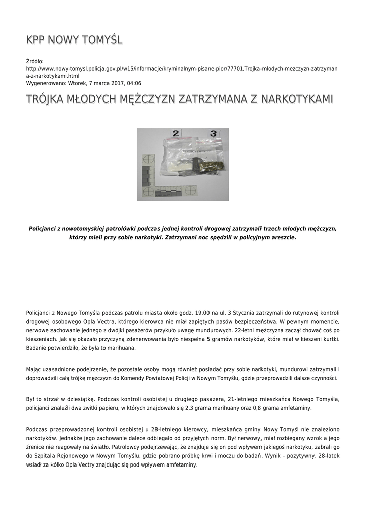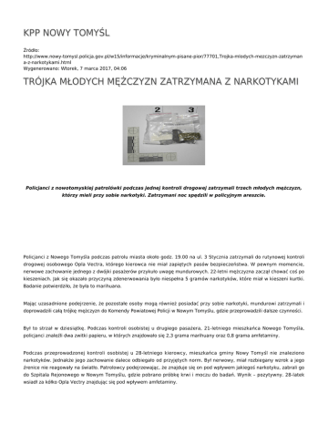 KPP NOWY TOMYŚL Źródło: http://www.nowy-tomysl.policja.gov.pl/w15/informacje/kryminalnym-pisane-pior/77701,Trojka-mlodych-mezczyzn-zatrzyman a-z-narkotykami.html Wygenerowano: Wtorek, 7 marca 2017, 04:06 TRÓJKA MŁODYCH MĘŻCZYZN ZATRZYMANA Z NARKOTYKAMI Policjanci z nowotomyskiej patrolówki podczas jednej kontroli drogowej zatrzymali trzech młodych mężczyzn, którzy mieli przy sobie narkotyki. Zatrzymani noc spędzili w policyjnym areszcie. Policjanci z Nowego Tomyśla podczas patrolu miasta około godz. 19.00 na ul. 3 Stycznia zatrzymali do rutynowej kontroli drogowej osobowego Opla Vectra, którego kierowca nie miał zapiętych pasów bezpieczeństwa. W pewnym momencie, nerwowe zachowanie jednego z dwójki pasażerów przykuło uwagę mundurowych. 22-letni mężczyzna zaczął chować coś po kieszeniach. Jak się okazało przyczyną zdenerwowania było niespełna 5 gramów narkotyków, które miał w kieszeni kurtki. Badanie potwierdziło, że była to marihuana. Mając uzasadnione podejrzenie, że pozostałe osoby mogą również posiadać przy sobie narkotyki, mundurowi zatrzymali i doprowadzili całą trójkę mężczyzn do Komendy Powiatowej Policji w Nowym Tomyślu, gdzie przeprowadzili dalsze czynności. Był to strzał w dziesiątkę. Podczas kontroli osobistej u drugiego pasażera, 21-letniego mieszkańca Nowego Tomyśla, policjanci znaleźli dwa zwitki papieru, w których znajdowało się 2,3 grama marihuany oraz 0,8 grama amfetaminy. Podczas przeprowadzonej kontroli osobistej u 28-letniego kierowcy, mieszkańca gminy Nowy Tomyśl nie znaleziono narkotyków. Jednakże jego zachowanie dalece odbiegało od przyjętych norm. Był nerwowy, miał rozbiegany wzrok a jego źrenice nie reagowały na światło. Patrolowcy podejrzewając, że znajduje się on pod wpływem jakiegoś narkotyku, zabrali go do Szpitala Rejonowego w Nowym Tomyślu, gdzie pobrano próbkę krwi i moczu do badań. Wynik – pozytywny. 28-latek wsiadł za kółko Opla Vectry znajdując się pod wpływem amfetaminy. To jednak nie koniec przestępstw, których się dopuścił. Mundurowym z Nowego Tomyśla nie dawał spokoju fakt, że kierowca zażywał amfetaminę, ale nie miał narkotyków przy sobie. Postanowili przeszukać dokładnie jego samochód. Kolejny raz policyjny nos nie zawiódł. Przy fotelu pasażera znaleźli woreczek strunowy z zawartością 1,48 grama amfetaminy. Kierowca przyznał się, że znaleziony narkotyk należy do niego. Zatrzymani mężczyźni noc spędzili w policyjnym areszcie. Następnego dnia usłyszeli zarzut posiadania narkotyków. Kierowca dodatkowo usłyszał zarzut kierowania pojazdem mechanicznym pod wpływem narkotyków. Za popełnione przestępstwa kodeks karny przewiduje karę do 3 lat pozbawienia wolności. 3 zatrzymanych z narkotykami Ocena: 0/5 (0) Tweetnij