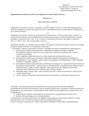Zał cznik do Uchwały Nr XXVI/149 /2012 Rady Gminy w Iwkowej z dnia26 listopada 2012 roku. Regulamin utrzymania czysto ci i porz dku na terenie Gminy Iwkowa. ROZDZIAŁ I POSTANOWIENIA OGÓLNE §1 Regulamin utrzymania czysto ci i porz dku na terenie Gminy Iwkowa, zwany dalej Regulaminem, okre la szczegółowe zasady utrzymania czysto ci i porz dku na terenie nieruchomo ci znajduj cych si w Gminie Iwkowa. §2 Regulamin obowi zuje wła cicieli nieruchomo ci, mieszka ców, osoby przebywaj ce czasowo na terenie Gminy Iwkowa oraz przedsi biorców wiadcz cych usługi w zakresie utrzymania czysto ci i porz dku, o których mowa w art. 7 ust. 1 ustawy o utrzymaniu czysto ci i porz dku w gminach (Dz. U. z 2012 r. poz. 391) zwanej dalej „ustaw ”. §3 Regulamin zgodnie z wymogami ustawy okre la szczegółowe zasady utrzymania czysto ci i porz dku na terenie gminy Iwkowa, w szczególno ci dotycz ce: 1. Wymaga w zakresie utrzymania czysto ci i porz dku na terenie nieruchomo ci obejmuj cych: 1) prowadzenie selektywnego zbierania i odbierania nast puj cych frakcji odpadów komunalnych: papieru i tektury (w tym opakowania, gazety, czasopisma itd.), metalu, tworzywa sztucznego, szkła i odpadów opakowaniowych ze szkła, opakowa wielomateriałowych; 2) prowadzenie selektywnego zbierania i odbierania odpadów komunalnych ulegaj cych biodegradacji w tym odpadów opakowaniowych ulegaj cych biodegradacji, a tak e odpadów zielonych z ogrodów i parków; 3) prowadzenie selektywnego zbierania i odbierania powstaj cych w gospodarstwach domowych: przeterminowanych leków, zu ytych baterii i akumulatorów, zu ytego sprz tu elektrycznego i elektronicznego, mebli i innych odpadów wielkogabarytowych, odpadów budowlanoremontowych i rozbiórkowych, zu ytych opon, zu ytej odzie y. 4) uprz tanie błota, niegu, lodu i innych zanieczyszcze z cz ci nieruchomo ci słu cych do u ytku publicznego; 5) mycia i naprawy pojazdów samochodowych poza myjniami i warsztatami naprawczymi; 3.Rodzaju i minimalnej pojemno ci pojemników przeznaczonych do zbierania odpadów komunalnych na terenie nieruchomo ci oraz na drogach publicznych, warunków rozmieszczania tych pojemników i ich utrzymania w odpowiednim stanie sanitarnym, porz dkowym i technicznym, przy uwzgl dnieniu: 1) redniej ilo ci odpadów komunalnych wytwarzanych w gospodarstwach domowych; 2) liczby osób korzystaj cych z tych pojemników; Cz stotliwo ci i sposobu pozbywania si odpadów komunalnych i nieczysto ci ciekłych z terenu nieruchomo ci oraz z terenów przeznaczonych do u ytku publicznego; Innych wymaga wynikaj cych z Planu Gospodarki Odpadami Województwa Małopolskiego; Obowi zków osób utrzymuj cych zwierz ta domowe, maj cych na celu ochron przed zagro eniem lub uci liwo ci dla ludzi oraz przed zanieczyszczeniem terenów przeznaczonych do wspólnego u ytku; Wymaga utrzymywania zwierz t gospodarskich na terenach wył czonych z produkcji rolniczej, w tym tak e zakazu ich utrzymywania na okre lonych obszarach lub w poszczególnych nieruchomo ciach; Wyznaczania obszarów podlegaj cych obowi zkowej deratyzacji i terminów jej przeprowadzania. §4 Ilekro w Regulaminie jest mowa o: 1) ustawie – nale y przez to rozumie ustaw z dnia 13 wrze nia 1996r. o utrzymaniu czysto ci i porz dku w gminach (Dz. U. z 2012 r. poz. 391 ); 2) nieruchomo ci - nale y przez to rozumie , zgodnie z art. 46 § 1 kodeksu cywilnego nast puj ce rodzaje nieruchomo ci: a) nieruchomo ci gruntowe (zabudowane lub niezabudowane), które ze wzgl du na przeznaczenie gospodarcze dziel si na: - nieruchomo ci rolne, - nieruchomo ci le ne - inne nieruchomo ci zabudowane lub przeznaczone pod zabudow ; b) nieruchomo ci budynkowe, c) nieruchomo ci lokalowe (lokale mieszkalne i lokale u ytkowe); 3) wła cicielach nieruchomo ci – nale y przez to rozumie tak e współwła cicieli, u ytkowników wieczystych oraz jednostki organizacyjne i osoby posiadaj ce nieruchomo ci w zarz dzie lub u ytkowaniu, a tak e inne podmioty władaj ce nieruchomo ci ; 4) budynku mieszkalnym jednorodzinnym - to zgodnie z tre ci art. 3 pkt 2a ustawy z dnia lipca 1994r.Prawo budowlane- budynek wolnostoj cy albo budynek w zabudowie bli niaczej, szeregowej lub grupowej, słu cy zaspokajaniu potrzeb mieszkaniowych, stanowi cy konstrukcyjnie samodzieln cało , w którym dopuszcza si wydzielenie nie wi cej ni dwóch lokali mieszkalnych albo jednego lokalu mieszkalnego i lokalu u ytkowego o powierzchni całkowitej nieprzekraczaj cej 30 proc. powierzchni całkowitej budynku; 5) gospodarstwo domowe – rozumie si przez to osoby prowadz ce wspólne gospodarstwo domowe i zamieszkuj ce wspólnie w jednym lokalu; 6) miejscu zamieszkania – rozumie si przez to miejsce, w którym dana osoba zazwyczaj sp dza czas przeznaczony na odpoczynek, niezale nie od czasowych nieobecno ci zwi zanych z wypoczynkiem, urlopem, odwiedzinami u przyjaciół i krewnych, interesami, leczeniem medycznym lub pielgrzymkami religijnymi; 7) budynku u yteczno ci publicznej – to zgodnie z zapisami § 3 pkt 6 Rozporz dzenia Ministra Infrastruktury z dnia 12 kwietnia 2002r. w sprawie warunków technicznych, jakim powinny odpowiada budynki i ich usytuowanie – budynek przeznaczony dla administracji publicznej, wymiaru sprawiedliwo ci, kultury, kultu religijnego, o wiaty, szkolnictwa wy szego, nauki, opieki zdrowotnej, opieki społecznej i socjalnej, obsługi bankowej, handlu, gastronomii, usług turystyki, sportu, obsługi pasa erów w transporcie kolejowym, drogowym, lotniczym lub wodnym, poczty lub telekomunikacji oraz inny ogólnodost pny budynek przeznaczony do wykonywania podobnych funkcji; za budynek u yteczno ci publicznej uznaje si tak e budynek biurowy i socjalny. 8) umowach – nale y przez to rozumie umowy, rozumiane zgodnie z tre ci art. 6. ust. 1 ustawy, podpisane z podmiotem uprawnionym przez wła cicieli nieruchomo ci; 9) Krajowym Planie Gospodarki Odpadami (KPGO) – nale y rozumie przez to dokument przyj ty przez Rad Ministrów uchwał nr 217 z dnia 24 g