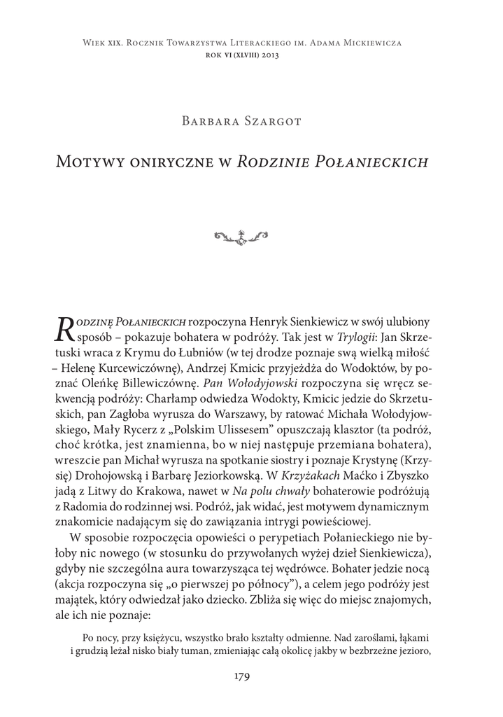 Wiek XIX . Rocznik Towarzystwa Literackiego im. Adama Mickiewicza rok VI (XLVIII) 2013 Barbara Szargot Motywy oniryczne w Rodzinie Połanieckich R odzinę Połanieckich rozpoczyna Henryk Sienkiewicz w swój ulubiony sposób – pokazuje bohatera w podróży. Tak jest w Trylogii: Jan Skrzetuski wraca z Krymu do Łubniów (w tej drodze poznaje swą wielką miłość – Helenę Kurcewiczównę), Andrzej Kmicic przyjeżdża do Wodoktów, by poznać Oleńkę Billewiczównę. Pan Wołodyjowski rozpoczyna się wręcz sekwencją podróży: Charłamp odwiedza Wodokty, Kmicic jedzie do Skrzetuskich, pan Zagłoba wyrusza do Warszawy, by ratować Michała Wołodyjowskiego, Mały Rycerz z „Polskim Ulissesem” opuszczają klasztor (ta podróż, choć krótka, jest znamienna, bo w niej następuje przemiana bohatera), wreszcie pan Michał wyrusza na spotkanie siostry i poznaje Krystynę (Krzysię) Drohojowską i Barbarę Jeziorkowską. W Krzyżakach Maćko i Zbyszko jadą z Litwy do Krakowa, nawet w Na polu chwały bohaterowie podróżują z Radomia do rodzinnej wsi. Podróż, jak widać, jest motywem dynamicznym znakomicie nadającym się do zawiązania intrygi powieściowej. W sposobie rozpoczęcia opowieści o perypetiach Połanieckiego nie byłoby nic nowego (w stosunku do przywołanych wyżej dzieł Sienkiewicza), gdyby nie szczególna aura towarzysząca tej wędrówce. Bohater jedzie nocą (akcja rozpoczyna się „o pierwszej po północy”), a celem jego podróży jest majątek, który odwiedzał jako dziecko. Zbliża się więc do miejsc znajomych, ale ich nie poznaje: Po nocy, przy księżycu, wszystko brało kształty odmienne. Nad zaroślami, łąkami i grudzią leżał nisko biały tuman, zmieniając całą okolicę jakby w bezbrzeżne jezioro, 179 • Barbara Szargot • które to złudzenie powiększały jeszcze odzywające się w tumanie chóry żab. (i 1)1 Noc nadaje odmienny kształt przedmiotom, a nawet niejako zmienia substancjalność rzeczy (czyniąc z suchego lądu jezioro). Przy czym to przeobrażenie się ma charakter zarówno wizualny, jak i audialny: Po podwórkach szczekały psy, ale j a k b y p r z e z s e n, dając wtór rzechotaniu żab, graniu derkaczy, bąków i tym wszystkim wołaniom, którymi odzywa się letnia noc, a k t ó r e p o t ę g u j ą j e s z c z e w r a ż e n i e c i s z y. (i 2) Z jednej strony mamy więc do czynienia z somnambulicznie szczekającymi psami, z drugiej, z kontrastem – wołaniami podkreślającymi ciszę2. Wrażenie nierealności pejzażu potęguje w Rodzinie Połanieckich oświetlony księżycem krajobraz: Jak okiem sięgnąć, połyskiwały tylko na nocnym tle nieba oświecone księżycem dachy chałup, które w tym blasku wydawały się s r e b r n e i s i w e. Niektóre chałupy były umazane wapnem i ś w i e c i ł y j a s n o z i e l o n o; inne ukryte w sadkach wiśniowych, w gąszczu słoneczników lub tyczkowej fasoli, zaledwie wychylały się z cienia. (I 2) Noc zmienia kolory chałup. Mało tego, dzieli je na „świecące” i schowane w cieniu. Zwłaszcza „świecenie” jest odwróceniem normalnego porządku świata – to, co jest zwykle zgaszone, zaczyna fosforyzować. Aury tajemniczości dodaje pejzażowi pochylony krzyż na wydmie. Stoi on na grobie samobójcy i protagonista powieści pamięta, że ludzie bali się tego miejsca3. Cytaty z Rodziny Połanieckich podaję według wydania: H. Sienkiewicz, Dzieła, wydanie zbiorowe pod redakcją J. Krzyżanowskiego, t. 32–34 (1–3), Warszawa 1949. W nawiasach podaję numery tomów (powieści) cyfrą rzymską i numery stron – cyfrą arabską; podkreślenia przez rozstrzelenie druku pochodzą ode mnie – B.Sz. 2 Taki zabieg znany jest każdemu wykształconemu Polakowi: „Wpłynąłem na suchego przestwór oceanu […]”. I następnie hiperbolizacja ciszy: „Stójmy! – jak cicho! – słyszę ciągnące żurawie […]. / Słyszę kędy się motyl kołysa na trawie” (A. Mickiewicz, Stepy Akermańskie, w: tegoż, Dzieła. Wydanie rocznicowe, t. 1, Wiersze, oprac. Cz. Zgorzelski, Warszawa 1993, s. 235). 3 Przejeżdżanie nocą obok grobu samobójcy należy do romantycznego sztafażu grozy. Przywołam choćby powszechnie znaną w XIX wieku Marię Antoniego Malczewskiego: 1 Minął już kozak bezdnię i głębokie jary, Gdzie się lubią ukrywać wilki i Tatary; Przyleciał do figury (co jej wzgórek znany, Bo pod nią już od dawna upiór pochowany), Uchylił przed nią czapki, żegnał się trzy razy [……………………………………………] I przez puste bezdroża król pustyni rusza – A step – koń – kozak – ciemność – jedna dzika dusza. (A. Malczewski, Maria, oprac. R. Przybylski, Wrocław–Kraków 1958, s. 8–9, w. 31–35 i 47–48). 180 • Motywy oniryczne w Rodzinie Połanieckich • Zastosowana tu konwencja obrazowania jest zgodna z romantycznym sposobem postrzegania świata. Nie chodzi mi tutaj jednak o nastrój grozy, choć on także przynależy do zbanalizowanych w czasach Sienkiewicza konwencji romantycznych. Daleko ważniejsza jest przemiana znanego miejsca. Adam Mickiewicz ten sposób opisywania pejzażu zastosował już w Balladach i romansach. Jak wykazał Ireneusz Opacki, ten zabieg ma ważkie znaczenie: Wytwarza się sytuacja – na tle odziedziczonych po Oświeceniu obyczajów obserwacji świata – paradoksalna. Oto konkretny obserwator znajduje się w konkretnym, topograficznie określonym miejscu, do którego narrator zaprowadził go za rękę po konkretnej i określonej okolicy […] I oto – odziedziczony po Oświeceniu empiryzm zawodzi, „szkiełko i oko” nie pozwalają na precyzyjne określenie świata. Wymyka się on zmysłom, nie pozwala się im opanować i „oswoić”. Pozostaje dla obserwatora niepewny, niejasny, nieokreślony, niezgodny z codziennym doświadczeniem. I w ślad za tym – również obserwator nie czuje się w tym świecie pewnie. Przeciwnie: jest właśnie „niepewny”, zdezorientow
