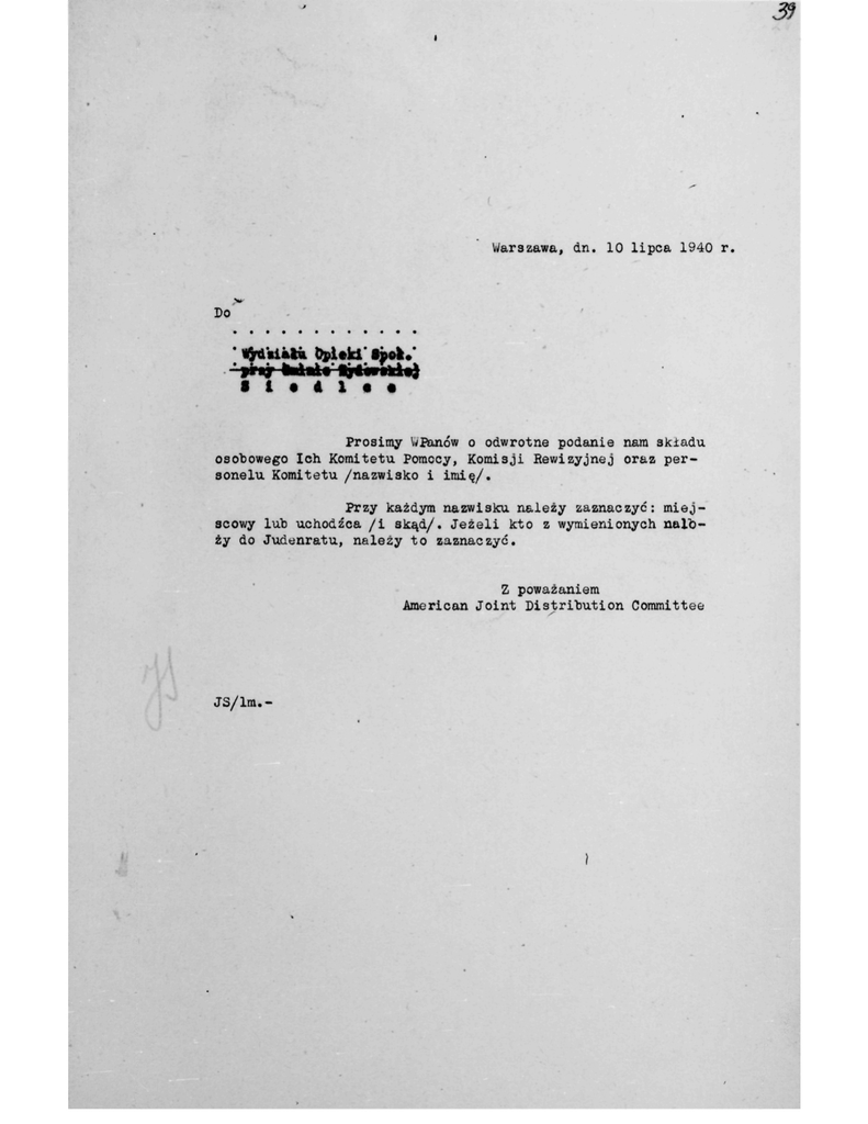 Warszawa, dn. 10 l i p c a 1940 r . Prosimy WPanow o odwrotne podanie nam akiadu osobowego Ich Koraitetu Poraocy, Komisji Bewizyjnej oraz p e r sonelu Komitetu /nazwi3ko i i m i e / . Przy kazdym nazwisku nalezy zaznaczyc: m i e j scowy lub uchodzca / i ska,d/. J e z e l i kto z wyraienionych n a l b zy do Judenratu, nalezy t o zaznaczyc. Z powazaniem American J o i n t D i s t r i b u t i o n Committee JS/lm.- I