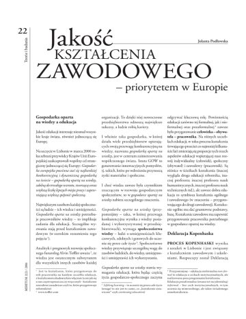 Teorie i badania 22 Jakość Jolanta Podłowska KSZTAŁCENIA ZAWODOWEGO – priorytetem w Europie Gospodarka oparta na wiedzy a edukacja Jakość edukacji interesuje nieomal wszystkie kraje świata, również jednoczącą się Europę. Na szczycie w Lizbonie w marcu 2000 roku zebrani przywódcy Krajów Unii Europejskiej zaakceptowali wspólny cel strategiczny jednoczącej się Europy: Gospodarka europejska powinna stać się najbardziej konkurencyjną i dynamiczną gospodarką na świecie – gospodarką opartą na wiedzy, zdolną do trwałego wzrostu, tworzącą coraz większą liczbę lepszych miejsc pracy i zapewniającą większą spójność społeczną. MERITUM 2(2) / 2006 Największym zasobem każdej społeczności są ludzie – ich wiedza i umiejętności. Gospodarka oparta na wiedzy potrzebuje pracowników wiedzy – to implikuje zadania dla edukacji. Szczególne wyzwania stają przed kształceniem zawodowym (w szerokim rozumieniu tego pojęcia 1). Analityk i prognostyk rozwoju społecznego futurolog Alvin Toffler uważa 2, że wiedza jest ostatecznym substytutem dla wszystkich innych zasobów każdej 1 Jest to kształcenie, które przygotowuje do roli pracownika na każdym szczeblu edukacji, z kształceniem akademickim włącznie (a nie jak się u nas często upraszcza czy wręcz myli – kształcenie zawodowe zasadnicze czyli to, które przygotowuje robotników) 2 www.toffler.com organizacji. To dzięki niej nowoczesne przedsiębiorstwa odnoszą największe sukcesy, a ludzie robią kariery. I właśnie taka gospodarka, w której działa wiele przedsiębiorstw opierających swoją przewagę konkurencyjną na wiedzy, nazwana gospodarką opartą na wiedzy, jest w centrum zainteresowania współczesnego świata. Istota GOW to generowanie innowacyjnych pomysłów, tj. takich, które po wdrożeniu przynoszą zyski materialne i społeczne. I choć wiedza zawsze była czynnikiem znaczącym w rozwoju gospodarczym społeczeństw, to w gospodarce opartej na wiedzy nabiera szczególnego znaczenia. Gospodarka oparta na wiedzy (przypomnijmy – taka, w której przewaga konkurencyjna wynika z wiedzy posiadanej i wykorzystywanej w przedsiębiorstwach), wymaga społeczeństwa wiedzy – ludzi o umiejętnościach kluczowych, zdolnych i gotowych do uczenia się przez całe życie 3. Społeczeństwo wiedzy przywiązuje szczególną wagę do zasobów ludzkich, do wiedzy, umiejętności i umiejętności ich wykorzystania. Gospodarka oparta na wiedzy stawia wymagania edukacji, która będąc częścią życia gospodarczo-społecznego zaczyna 3 Lifelong learning – to uczenie się przez całe życie (uwaga! to nie jest to samo, co „kształcenie ustawiczne” czyli continuing education) odgrywać kluczową rolę. Powinnością edukacji zarówno tej formalnej, jak i nieformalnej oraz pozaformalnej 4 zawsze było przygotowanie człowieka – obywatela – pracownika. Na różnych szczeblach edukacji, w toku procesu kształcenia (trwającego przecież co najmniej kilkanaście lat) zmieniają się proporcje tych trzech aspektów edukacji wspierającej nasz rozwój indywidualny (człowiek), społeczny (obywatel) i zawodowy (pracownik). Są różnice w ścieżkach kształcenia (inaczej wygląda droga edukacji robotnika, inaczej profesora; inaczej profesora nauk humanistycznych, inaczej profesora nauk technicznych itd.), ale zawsze dobra edukacja to symbioza kształcenia ogólnego i zawodowego (w znaczeniu – przygotowującego do drogi zawodowej). Kształcenie ogólne ma dać gruntowne podstawy, bazę. Kształcenie zawodowe ma zapewnić przygotowanie pracownika potrzebnego w gospodarce opartej na wiedzy. Deklaracja Kopenhaska PROCES KOPENHASKI wynika z ustaleń w Lizbonie i jest związany z kształceniem zawodowym i szkoleniami. Rozpoczęty został Deklaracją 4 Przypomnijmy – edukacja nieformalna non-formal to edukacja o cechach instytucjonalnych, ale realizowana poza programami kształcenia; Edukacja pozaformalna (zwana też incydentalną) informal – bez cech instytucjonalnych, w tym uczenia się mimowolnego, ale także świadomego samokształcenia. • • Wśród zadań wynikających z Deklaracji Kopenhaskiej trzy zostały przyjęte do realizacji w pierwszej kolejności. Są to: • utworzenie jednolitych ram przezroczystości kompetencji i kwalifikacji, których narzędziem jest EUROPASS, • stworzenie systemu punktów kredytowych w kształceniu i szkoleniu zawodowym, • stworzenie mechanizmów zapewniania jakości w kształceniu i szkoleniu zawodowym – wypracowanie standardów jakości, norm, kryteriów i wskaźników jakości kształcenia i szkolenia zawodowego. To ostatnie zadanie zaowocowało opracowaniem „wspólnych ram zapewniania jakości” w kształceniu zawodowym. (Common Quality Assurance Framework). Ich znajomość może pomóc dyrektorowi placówki kształcenia zawodowego w budowaniu wewnątrzszkolnego systemu zapewniania jakości. • • grupy roboczej zajmującej się jakością w kształceniu zawodowym i szkoleniach (Quality in VET – Vocational Education and Training). Zawarte w raporcie propozycje zostały zatwierdzone do realizacji przez Radę Unii Europejskiej – decyzja z dnia 18 maja 2004 r. Draft Council Conclusions on Quality Assurance in VET. 24 czerwca 2004 r. opublikowano Fundamentals of A „Common Quality Assurance Framework” for VET in Europe – głównie na podstawie tego dokumentu przedstawiamy CQAF. W rezultacie prac specjalnie powołanej grupy roboczej wspólne ramy zapewniania jakości CQAF zostały skonstruowane wg struktury 4 M, obejmującej cztery elementy (rys. 1.), którymi są: wynikać ze zgodnego podejścia do identyfikacji obszarów i kryteriów kluczowych dla zapewniania i podnoszenia jakości; stawiać pytania i sugerować możliwe odpowiedzi (kryteria jakości) na poziomie systemu i realizatorów kształcenia, bez opisywania „jak to się robi”; być spójne z głównymi etapami i pytaniami w odpowiednich istniejących już narzędzi