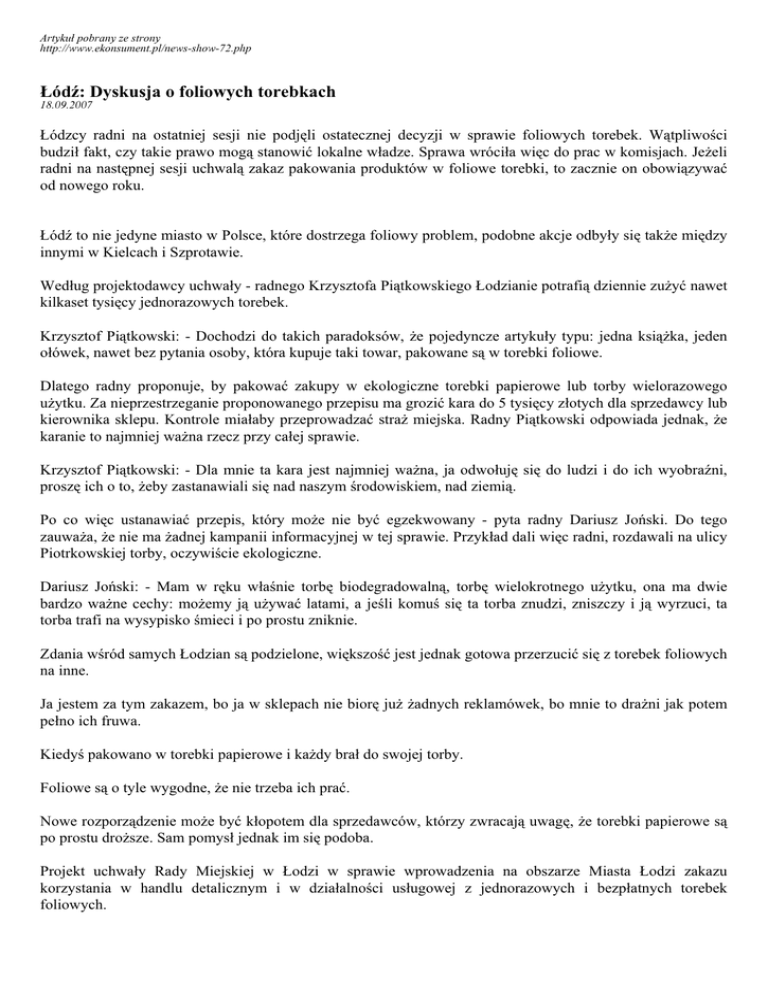 Artykuł pobrany ze strony http://www.ekonsument.pl/news-show-72.php Łódź: Dyskusja o foliowych torebkach 18.09.2007 Łódzcy radni na ostatniej sesji nie podjęli ostatecznej decyzji w sprawie foliowych torebek. Wątpliwości budził fakt, czy takie prawo mogą stanowić lokalne władze. Sprawa wróciła więc do prac w komisjach. Jeżeli radni na następnej sesji uchwalą zakaz pakowania produktów w foliowe torebki, to zacznie on obowiązywać od nowego roku. Łódź to nie jedyne miasto w Polsce, które dostrzega foliowy problem, podobne akcje odbyły się także między innymi w Kielcach i Szprotawie. Według projektodawcy uchwały - radnego Krzysztofa Piątkowskiego Łodzianie potrafią dziennie zużyć nawet kilkaset tysięcy jednorazowych torebek. Krzysztof Piątkowski: - Dochodzi do takich paradoksów, że pojedyncze artykuły typu: jedna książka, jeden ołówek, nawet bez pytania osoby, która kupuje taki towar, pakowane są w torebki foliowe. Dlatego radny proponuje, by pakować zakupy w ekologiczne torebki papierowe lub torby wielorazowego użytku. Za nieprzestrzeganie proponowanego przepisu ma grozić kara do 5 tysięcy złotych dla sprzedawcy lub kierownika sklepu. Kontrole miałaby przeprowadzać straż miejska. Radny Piątkowski odpowiada jednak, że karanie to najmniej ważna rzecz przy całej sprawie. Krzysztof Piątkowski: - Dla mnie ta kara jest najmniej ważna, ja odwołuję się do ludzi i do ich wyobraźni, proszę ich o to, żeby zastanawiali się nad naszym środowiskiem, nad ziemią. Po co więc ustanawiać przepis, który może nie być egzekwowany - pyta radny Dariusz Joński. Do tego zauważa, że nie ma żadnej kampanii informacyjnej w tej sprawie. Przykład dali więc radni, rozdawali na ulicy Piotrkowskiej torby, oczywiście ekologiczne. Dariusz Joński: - Mam w ręku właśnie torbę biodegradowalną, torbę wielokrotnego użytku, ona ma dwie bardzo ważne cechy: możemy ją używać latami, a jeśli komuś się ta torba znudzi, zniszczy i ją wyrzuci, ta torba trafi na wysypisko śmieci i po prostu zniknie. Zdania wśród samych Łodzian są podzielone, większość jest jednak gotowa przerzucić się z torebek foliowych na inne. Ja jestem za tym zakazem, bo ja w sklepach nie biorę już żadnych reklamówek, bo mnie to drażni jak potem pełno ich fruwa. Kiedyś pakowano w torebki papierowe i każdy brał do swojej torby. Foliowe są o tyle wygodne, że nie trzeba ich prać. Nowe rozporządzenie może być kłopotem dla sprzedawców, którzy zwracają uwagę, że torebki papierowe są po prostu droższe. Sam pomysł jednak im się podoba. Projekt uchwały Rady Miejskiej w Łodzi w sprawie wprowadzenia na obszarze Miasta Łodzi zakazu korzystania w handlu detalicznym i w działalności usługowej z jednorazowych i bezpłatnych torebek foliowych. Na podstawie: Polskie Radio (http://www.polskieradio.pl )