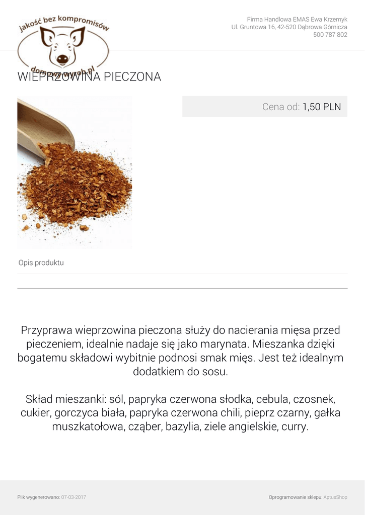 Firma Handlowa EMAS Ewa Krzemyk Ul. Gruntowa 16, 42-520 Dąbrowa Górnicza 500 787 802 WIEPRZOWINA PIECZONA Cena od: 1,50 PLN Opis produktu Przyprawa wieprzowina pieczona służy do nacierania mięsa przed pieczeniem, idealnie nadaje się jako marynata. Mieszanka dzięki bogatemu składowi wybitnie podnosi smak mięs. Jest też idealnym dodatkiem do sosu. Skład mieszanki: sól, papryka czerwona słodka, cebula, czosnek, cukier, gorczyca biała, papryka czerwona chili, pieprz czarny, gałka muszkatołowa, cząber, bazylia, ziele angielskie, curry. Plik wygenerowano: 07-03-2017 Oprogramowanie sklepu: AptusShop Firma Handlowa EMAS Ewa Krzemyk Ul. Gruntowa 16, 42-520 Dąbrowa Górnicza 500 787 802 KRAJ POCHODZENIA POLSKA Warianty produktu 50g 1,50 PLN 30,00 PLN/1KG 100g 2,50 PLN 25,00 PLN/1KG 250g 5,00 PLN 20,00 PLN/1KG Plik wygenerowano: 07-03-2017 Powered by TCPDF (www.tcpdf.org) Oprogramowanie sklepu: AptusShop