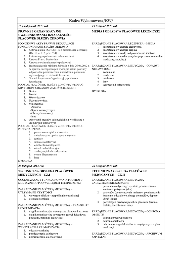 Kadra Wykonawcza/KW/ 15 październik 2013 rok 19 listopad 2013 rok PRAWNE I ORGANIZACYJNE UWARUNKOWANIA DZIAŁALNOŚCI PLACÓWEK SŁUŻBY ZDROWIA MEDIA I ODPADY W PLACÓWCE LECZNICZEJ PODATKOWE AKTY PRAWNE REGULUJĄCE FUNKCJONOWANIE SŁUŻBY ZDROWIA 1. Ustawa z dnia 15.04.2011 r. o działalności leczniczej (Dz. U. nr 112, poz. 654) 2. Ustawa o gospodarce nieruchomościami 3. Ustawa Prawo Budowlane 4. Ustawa o ochronie przeciwpożarowej 5. Rozporządzenie Ministra Zdrowia z dnia 26.06.2012 r. w sprawie szczegółowych wymagań jakim powinny odpowiadać pomieszczenia i urządzenia podmiotu wykonującego działalność leczniczą 6. Statut i Regulamin Organizacyjny podmiotu leczniczego PODZIAŁ PLACÓWEK SŁUŻBY ZDROWIA WEDŁUG KRYTERIÓW ORGANÓW ZAŁOŻYCIELSKICH 1. Gmina 2. Powiat 3. Województwo 4. Uczelnia wyższa 5. Ministerstwo - Zdrowia - Spraw wewnętrznych - Obrony Narodowej - inne 6. Obowiązki organów założycielskich wynikające z uregulowań ustawowych PODZIAŁ PLACÓWEK SŁUŻBY ZDROWIA WEDŁUG PRZEZNACZENIA 1. podstawowa opieka zdrowotna 2. ambulatoryjna opieka specjalistyczna 3. szpitale 4. szpitale sanatoryjne 5. opieka stomatologiczna 6. ośrodki rehabilitacyjne 7. zakłady opiekuńczo-lecznicze 8. centra diagnostyczne 9. inne DYSKUSJA ZARZĄDZANIE PLACÓWKĄ LECZNICZĄ – MEDIA 1. zaopatrzenie w energię elektryczną 2. zaopatrzenie w energię cieplną 3. zaopatrzenie w wodę i odprowadzenie ścieków 4. zaopatrzenie w media specjalnego przeznaczenia (tlen medyczny, azot, itp.) 20 listopad 2013 rok 26 listopad 2013 rok TECHNICZNA OBSŁUGA PLACÓWEK MEDYCZNYCH – CZ.I TECHNICZNA OBSŁUGA PLACÓWEK MEDYCZNYCH – CZ.II OGÓLNE ZASADY FUNKCJONOWANIA PODMIOTU MEDYCZNEGO POD WZGLĘDEM TECHNICZNYM ZARZĄDZANIE PLACÓWKĄ MEDYCZNĄ – ZABEZPIECZENIE SOCJALNE 1. personelu medycznego (szatnie, pomieszczenia sanitarne, pokoje socjalne) 2. pacjentów (pomieszczenia sanitarne, pomieszczenia kuchenne oddziałowe, dostęp do mediów, depozyt ubrań i inne) 3. pozostałych przebywających w placówce (szatnia, toaleta, poczekalnia i inne) ZARZĄDZANIE PLACÓWKĄ MEDYCZNĄ – UTRZYMANIE CZYSTOŚCI 1. wewnątrz obiektu – zespół higieny szpitalnej 2. otoczenie szpitala ZARZĄDZANIE PLACÓWKĄ MEDYCZNĄ – TRANSPORT I KOMUNIKACJA 1. ciągi komunikacyjne wewnętrzne pionowe i poziome 2. ciągi komunikacyjne zewnętrzne (drogi dojazdowe, podjazdy, parkingi, lądowiska) ZARZĄDZANIE PLACÓWKĄ MEDYCZNĄ – WENTYLACJA I KLIMATYZACJA 1. oddziały szpitalne 2. pomieszczenia zabiegowe 3. pomieszczenia diagnostyczne ZARZĄDZANIE PLACÓWKĄ MEDYCZNĄ – ODPADY I NIECZYSTOŚCI 1. komunalne 2. medyczne 3. nuklearne 4. inne 5. segregacja i składowanie DYSKUSJA ZARZĄDZANIE PLACÓWKĄ MEDYCZNĄ – OCHRONA OBIEKTU 1. ochrona przeciwpożarowa 2. ochrona obiektowa 3. ochrona na wypadek aktów terrorystycznych – plan ewakuacji ZARZĄDZANIE PLACÓWKĄ MEDYCZNĄ – ARCHIWUM SZPITALNE 4. pozostałe ZARZĄDZANIE PLACÓWKĄ MEDYCZNĄ – ŁĄCZNOŚĆ 1. zewnętrzna (telefoniczna, internetowa, specjalna) 2. wewnętrzna (telefoniczna wewnętrznej łączności szpitalnej, intranet) DYSKUSJA ZARZĄDZANIE PLACÓWKĄ MEDYCZNĄ – POSTĘPOWANIE ZE ZWŁOKAMI ZARZĄDZANIE PLACÓWKĄ MEDYCZNĄ – POMIESZCENIA TOWARZYSZĄCE 1. komercyjne (punkty handlowe, usługowe, gastronomiczne itp.) 2. niekomercyjne (biblioteka, kaplica itp.) ZARZĄDZANIE PLACÓWKĄ MEDYCZNĄ – OBRONA CYWILNA DYSKUSJA 27 listopad 2013 rok DOKUMENTACJA TECHNICZNA I UBEZPIECZENIA MAJĄTKOWE I OC ZARZĄDZANIE NIERUCHOMOŚCIĄ LECZNICZĄ W ZAKRESIE PROWADZENIA DOKUMENTACJI 1. odpis z ksiąg wieczystych 2. wypis z rejestru gruntu 3. ewidencji i uzbrojenia terenu 4. wyciąg z planu przestrzennego zagospodarowania 5. świadectwo charakterystyki energetycznej budynku 6. książka obiektu budowlanego 7. książka dozoru technicznego 8. inne UBEZPIECZENIA MAJĄTKOWE I OD ODPOWIEDZIALNOŚCI CYWILNEJ W PLACÓWKACH LECZNICZYCH − seminaria warsztatowe prowadzone będą przez przedstawicieli firm ubezpieczeniowych DYSKUSJA