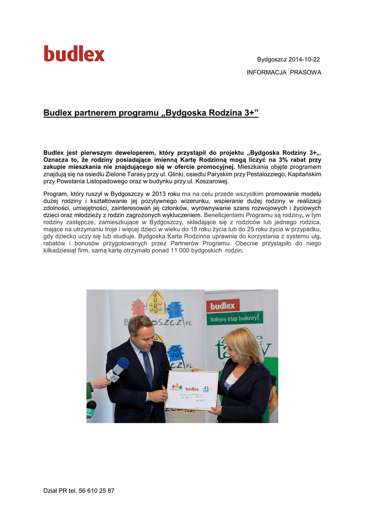 Bydgoszcz 2014-10-22 INFORMACJA PRASOWA Budlex partnerem programu „Bydgoska Rodzina 3+” Budlex jest pierwszym deweloperem, który przystąpił do projektu „Bydgoska Rodziny 3+„. Oznacza to, że rodziny posiadające imienną Kartę Rodzinną mogą liczyć na 3% rabat przy zakupie mieszkania nie znajdującego się w ofercie promocyjnej. Mieszkania objęte programem znajdują się na osiedlu Zielone Tarasy przy ul. Glinki, osiedlu Paryskim przy Pestalozziego, Kapitańskim przy Powstania Listopadowego oraz w budynku przy ul. Koszarowej. Program, który ruszył w Bydgoszczy w 2013 roku ma na celu przede wszystkim promowanie modelu dużej rodziny i kształtowanie jej pozytywnego wizerunku, wspieranie dużej rodziny w realizacji zdolności, umiejętności, zainteresowań jej członków, wyrównywanie szans rozwojowych i życiowych dzieci oraz młodzieży z rodzin zagrożonych wykluczeniem. Beneficjentami Programu są rodziny, w tym rodziny zastępcze, zamieszkujące w Bydgoszczy, składające się z rodziców lub jednego rodzica, mające na utrzymaniu troje i więcej dzieci w wieku do 18 roku życia lub do 25 roku życia w przypadku, gdy dziecko uczy się lub studiuje. Bydgoska Karta Rodzinna uprawnia do korzystania z systemu ulg, rabatów i bonusów przygotowanych przez Partnerów Programu. Obecnie przystąpiło do niego kilkadziesiąt firm, samą kartę otrzymało ponad 11 000 bydgoskich rodzin. Dział PR tel. 56 610 25 87