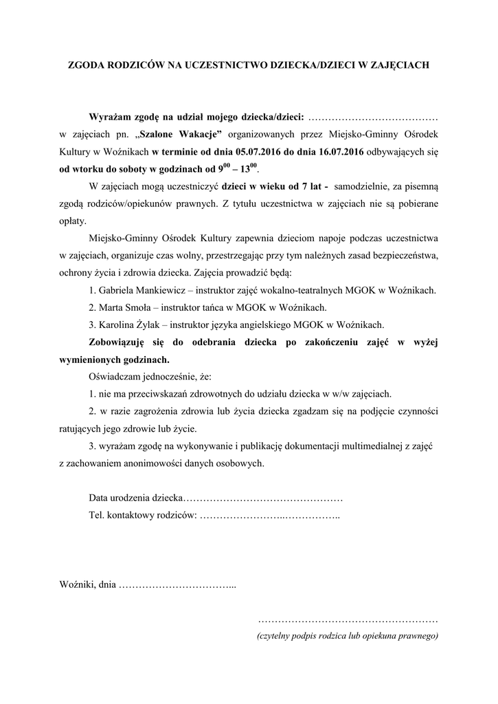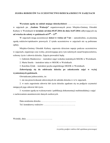 ZGODA RODZICÓW NA UCZESTNICTWO DZIECKA/DZIECI W ZAJĘCIACH Wyrażam zgodę na udział mojego dziecka/dzieci: ………………………………… w zajęciach pn. „Szalone Wakacje” organizowanych przez Miejsko-Gminny Ośrodek Kultury w Woźnikach w terminie od dnia 05.07.2016 do dnia 16.07.2016 odbywających się od wtorku do soboty w godzinach od 900 – 1300. W zajęciach mogą uczestniczyć dzieci w wieku od 7 lat - samodzielnie, za pisemną zgodą rodziców/opiekunów prawnych. Z tytułu uczestnictwa w zajęciach nie są pobierane opłaty. Miejsko-Gminny Ośrodek Kultury zapewnia dzieciom napoje podczas uczestnictwa w zajęciach, organizuje czas wolny, przestrzegając przy tym należnych zasad bezpieczeństwa, ochrony życia i zdrowia dziecka. Zajęcia prowadzić będą: 1. Gabriela Mankiewicz – instruktor zajęć wokalno-teatralnych MGOK w Woźnikach. 2. Marta Smoła – instruktor tańca w MGOK w Woźnikach. 3. Karolina Żylak – instruktor języka angielskiego MGOK w Woźnikach. Zobowiązuję się do odebrania dziecka po zakończeniu zajęć w wyżej wymienionych godzinach. Oświadczam jednocześnie, że: 1. nie ma przeciwskazań zdrowotnych do udziału dziecka w w/w zajęciach. 2. w razie zagrożenia zdrowia lub życia dziecka zgadzam się na podjęcie czynności ratujących jego zdrowie lub życie. 3. wyrażam zgodę na wykonywanie i publikację dokumentacji multimedialnej z zajęć z zachowaniem anonimowości danych osobowych. Data urodzenia dziecka………………………………………… Tel. kontaktowy rodziców: ……………………..…………….. Woźniki, dnia ……………………………... ……………………………………………… (czytelny podpis rodzica lub opiekuna prawnego)
