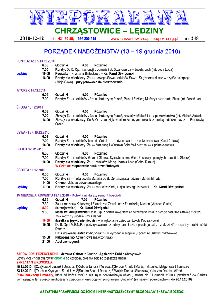 NIEPOKALANA CHRZĄSTOWICE – LĘDZINY 2010-12-12 tel. 421 90 88; 696 200 515 www.chrzastowice.opole.opoka.org.pl nr 248 PORZĄDEK NABOŻEŃSTW (13 – 19 grudnia 2010) PONIEDZIAŁEK 13.12.2010 6.05 Godzinki 6.30 RóŜaniec 7.00 Roraty: Do B. Op. i św. Łucji o zdrowie i bł. BoŜe oraz za + Józefa Loch (int. Loch Łucja) Lędziny 10.00 Pogrzeb: + Krystiana Białeckiego – Ks. Karol Dźwigoński 18.00 Roraty dla młodzieŜy: Za ++ Jerzego Sowa, rodziców Sowa i Segiet oraz dusze w czyśćcu cierpiące (Alicja Sowa) – przygotowanie do bierzmowania WTOREK 14.12.2010 6.05 7.00 ŚRODA 15.12.2010 6.05 7.00 18.00 CZWARTEK 16.12.2010 6.05 7.00 18.00 PIĄTEK 17.12.2010 6.05 7.00 18.00 SOBOTA 18.12.2010 6.05 7.00 14.00 Lędziny 17.00 Godzinki 6.30 RóŜaniec Roraty: Za ++ rodziców Józefa i Katarzynę Pasoń, Piusa i ElŜbietę Mańczyk oraz brata Piusa (int. Pasoń Jan) Godzinki 6.30 RóŜaniec Roraty: Za ++ rodziców Józefa i Katarzynę Pasoń, rodziców Micheń i ++ z pokrewieństwa (int. Micheń Antoni) Roraty dla młodzieŜy: Do B. Op. z podziękowaniem za otrzymane łaski z prośbą o dalsze oraz za + Franciszkę Olech Godzinki 6.30 RóŜaniec Roraty: Za ++ rodziców Michel i Cebula, ++ rodzeństwo i ++ z pokrewieństwa (Karol Cebula) Roraty dla młodzieŜy: Za ++ Mariannę i Wacława Sobański oraz za ++ z pokrewieństwa Godzinki 6.30 RóŜaniec Roraty: Za ++ rodziców Grund i Glensk, Syna Joachima Glensk, siostry i poległych braci (int. Glensk) Roraty dla młodzieŜy: Za ++ rodziców Martę i Karola Loch (Gobel Dorota) W Ozimku: rozpoczęcie nauk przedślubnych Godzinki 6.30 RóŜaniec Roraty: Za + męŜa Józefa Mateja i do B. Op. za Ŝyjącą rodzinę (Mateja Elfryda) Chrzest: Jakuba Lewandowskiego Roraty dla młodzieŜy: Za ++ rodziców Kiehl, + ojca Jerzego Nowański – Ks. Karol Dźwigoński IV NIEDZIELA ADWENTU 19.12.2010 – Kolekta na dalszy remont kościoła 6.35 Godzinki 7.00 RóŜaniec 7.30 Za ++ rodziców Katarzynę i Franciszka Zmuda oraz Franciszkę Michen (Woszek Ginter) Lędziny 8.30 (intencja wolna) – Ks. Karol Dźwigoński 9.30 Msza św. dwujęzyczna: Do B. Op. z podziękowaniem za otrzymane łaski, z prośbą o dalsze zdrowie z okazji 75 – rocznicy urodzin Emila Bartek 10.30 Jasełka w języku niemieckim – w wykonaniu dzieci ze Szkoły Podstawowej 10.45 Do B. Op. i M.B.N.P. z podziękowaniem za otrzymane łaski, z prośbą o dalsze z okazji 40 – rocznicy urodzin córki Donaty Po: PrzekaŜcie sobie znak pokoju – w wykonaniu zespołu „Tęcza” ze Szkoły Podstawowej 15.00 NaboŜeństwo Adwentowe (na wzór rorat) 21.00 Apel Jasnogórski ZAPOWIEDZI PRZEDŚLUBNE: Mateusz Ochota z Grudzic i Agnieszka Buhl z Chrząstowic Gdyby ktoś chciał ofiarować choinki do kościoła, prosimy zgłosić to jeszcze dzisiaj. SPRZĄTANIE KOŚCIOŁA: 18.12.2010: 1)Czajkowski Leszek i Urszula, 2)Cebula Janusz i Teresa, 3)Sordoń Arnold i Marta, 4)Strzelec Małgorzata i Stanisław 23.12.2010: 1)Truchan Krystyna i Stanisław, 2)Sordoń Beata i Dariusz, 3)Wójcik Dorota i Stanisław, 4)Joszko Dorota i Alfred Stare banknoty i monety, które od końca 1996 r. nie są w powszechnym obiegu, moŜna do 31 grudnia 2010 r. przekazać do Caritas, pomagając w ten sposób najuboŜszym dzieciom w kraju objętym programem "Skrzydła" (za naszym pośrednictwem do 26.12.2010). WSZYSTKIM PARAFIANOM, GOŚCIOM I INTERNAUTOM śYCZYMY BŁOGOSŁAWIEŃSTWA BOśEGO! PORZĄDEK NABOŻEŃSTW (20 – 26 grudnia 2010) PONIEDZIAŁEK 20.12.2010 6.05 Godzinki 6.30 Spowiedź święta i RóŜaniec 7.00 Roraty: Za ++ rodziców Pawła i Zofię Malek, dwóch braci i ++ z pokrewieństwa WTOREK 21.12.2010 6.05 7.00 Godzinki 6.30 Spowiedź święta i RóŜaniec Roraty: Za + Marię RoŜek i ++ z pokrewieństwa ŚRODA 22.12.2010 6.05 Godzinki 6.30 Spowiedź święta i RóŜaniec 7.00 Roraty: Za ++ Ŝonę Stefanię, rodziców oraz dusze w czyśćcu cierpiące (int. Pluta Ewald) Lędziny 16.00 – 17.00 Spowiedź święta – Ks. Karol Dźwigoński 17.00 – 18.00 SPOWIEDŹ ŚWIĘTA 18.00 Roraty dla młodzieŜy: Za + Herberta Kanz w I – rocznicę śmierci – przygotowanie do bierzmowania CZWARTEK 23.12.2010 6.05 Godzinki 6.30 Spowiedź święta i RóŜaniec 7.00 Roraty: Za + męŜa Gintra Marek (int. Marek) Lędziny 16.00 – 17.00 Spowiedź święta (dla tych, którzy nie mogli się wcześniej wyspowiadać) – Ks. Karol Dźwigoński 17.00 – 18.00 SPOWIEDŹ ŚWIĘTA (dla tych, którzy nie mogli się wcześniej wyspowiadać) PIĄTEK 24.12.2010 6.05 7.00 Lędziny 22.00 Godzinki 6.30 Spowiedź święta i RóŜaniec Roraty: Do B. Op. z podz. za otrzymane łaski i z prośbą o dalsza opiekę dla całej rodziny, oraz za ++ rodziców Wieszołek i Truchan, syna Rafała, Matyldę Golomb i ++ z pokrewieństwa (int. Wieszołek Ansgar) Pasterka: (intencja wolna) – Ks. Karol Dźwigoński SOBOTA 25.12.2010 – UROCZYSTOŚĆ BOśEGO NARODZENIA 0.00 Pasterka: Za Parafian – Kolekta na Dom Matki i Dziecka w Opolu Lędziny 8.30 (intencja wolna) – Ks. Karol Dźwigoński 9.00 RóŜaniec 9.30 Msza św. dwujęzyczna: Do B.Op. i M.B.N.P. z podziękowaniem za otrzymane łaski z prośbą o dalszą opiekę i zdrowie w rodzinie oraz za + ojca Alojzego Waldera i ++ z pokrewieństwa Kondziela-Waldera 10.45 Do Dzieciątka Jezus z podziękowaniem za otrzymane łaski i z prośbą o dalszą opiekę i zdrowie (Malek Gerard) 15.00 NaboŜeństwo NIEDZIELA 26.12.2010 – ŚWIĘTO ŚWIĘTEJ RODZINY – Kolekta na Wydział Teologiczny w Opolu StraŜacy przed kościołem zbierają na odbudowę gospodarstwa po poŜarze w Dańcu 6.35 Godzinki 7.00 RóŜaniec 7.30 Do Dzieciątka Jezus z podziękowaniem za otrzymane łaski, z prośbą o dalszą opiekę w rodzinie Sylwii i Bernarda Malek Lędziny 8.30 Za + Henryka Sowiecki – Ks. Karol Dźwigoński 9.30 Msza św. dwujęzyczna: Do Anioła StróŜa za roczne dziecko Marię Bartek, jej rodziców, siostrę i chrzestnych 10.45 Do B.Op. i M.B.N.P. z podz. za wszelkie otrzymane łaski, z prośbą o dalsze