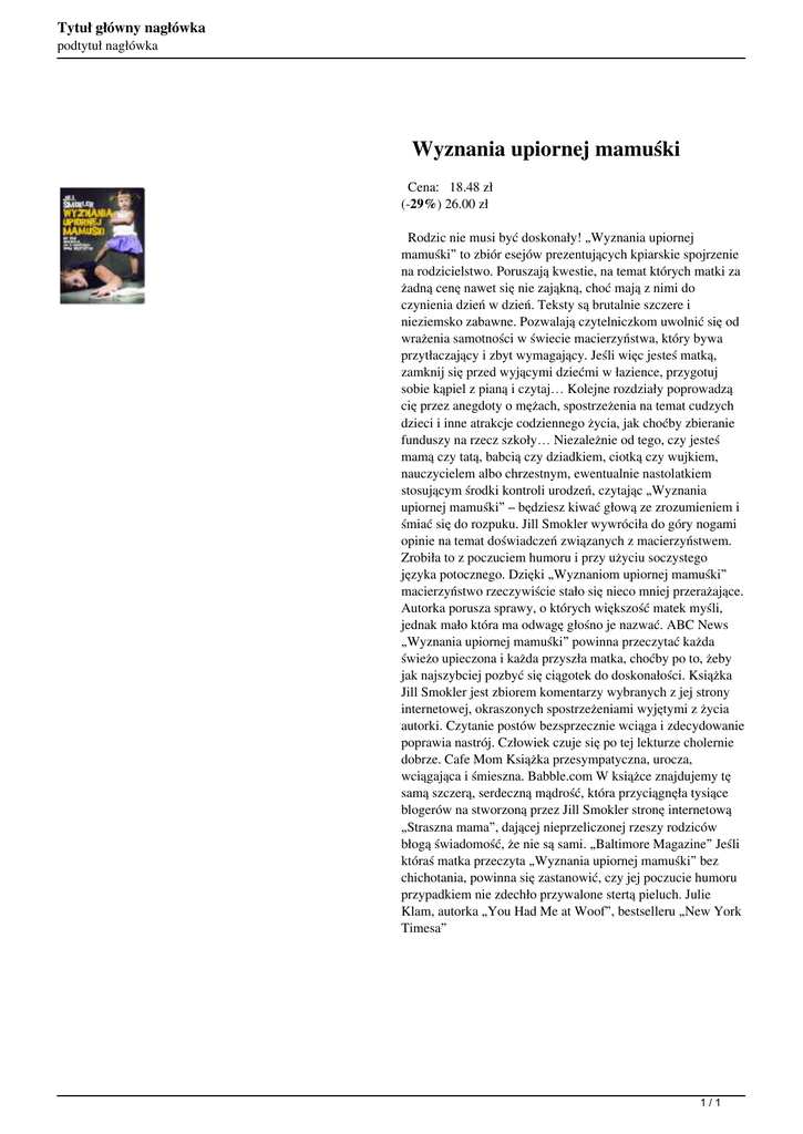 Tytuł główny nagłówka podtytuł nagłówka Wyznania upiornej mamuśki Cena: 18.48 zł (-29%) 26.00 zł Rodzic nie musi być doskonały! „Wyznania upiornej mamuśki” to zbiór esejów prezentujących kpiarskie spojrzenie na rodzicielstwo. Poruszają kwestie, na temat których matki za żadną cenę nawet się nie zająkną, choć mają z nimi do czynienia dzień w dzień. Teksty są brutalnie szczere i nieziemsko zabawne. Pozwalają czytelniczkom uwolnić się od wrażenia samotności w świecie macierzyństwa, który bywa przytłaczający i zbyt wymagający. Jeśli więc jesteś matką, zamknij się przed wyjącymi dziećmi w łazience, przygotuj sobie kąpiel z pianą i czytaj… Kolejne rozdziały poprowadzą cię przez anegdoty o mężach, spostrzeżenia na temat cudzych dzieci i inne atrakcje codziennego życia, jak choćby zbieranie funduszy na rzecz szkoły… Niezależnie od tego, czy jesteś mamą czy tatą, babcią czy dziadkiem, ciotką czy wujkiem, nauczycielem albo chrzestnym, ewentualnie nastolatkiem stosującym środki kontroli urodzeń, czytając „Wyznania upiornej mamuśki” – będziesz kiwać głową ze zrozumieniem i śmiać się do rozpuku. Jill Smokler wywróciła do góry nogami opinie na temat doświadczeń związanych z macierzyństwem. Zrobiła to z poczuciem humoru i przy użyciu soczystego języka potocznego. Dzięki „Wyznaniom upiornej mamuśki” macierzyństwo rzeczywiście stało się nieco mniej przerażające. Autorka porusza sprawy, o których większość matek myśli, jednak mało która ma odwagę głośno je nazwać. ABC News „Wyznania upiornej mamuśki” powinna przeczytać każda świeżo upieczona i każda przyszła matka, choćby po to, żeby jak najszybciej pozbyć się ciągotek do doskonałości. Książka Jill Smokler jest zbiorem komentarzy wybranych z jej strony internetowej, okraszonych spostrzeżeniami wyjętymi z życia autorki. Czytanie postów bezsprzecznie wciąga i zdecydowanie poprawia nastrój. Człowiek czuje się po tej lekturze cholernie dobrze. Cafe Mom Książka przesympatyczna, urocza, wciągająca i śmieszna. Babble.com W książce znajdujemy tę samą szczerą, serdeczną mądrość, która przyciągnęła tysiące blogerów na stworzoną przez Jill Smokler stronę internetową „Straszna mama”, dającej nieprzeliczonej rzeszy rodziców błogą świadomość, że nie są sami. „Baltimore Magazine” Jeśli któraś matka przeczyta „Wyznania upiornej mamuśki” bez chichotania, powinna się zastanowić, czy jej poczucie humoru przypadkiem nie zdechło przywalone stertą pieluch. Julie Klam, autorka „You Had Me at Woof”, bestselleru „New York Timesa” 1/1 Powered by TCPDF (www.tcpdf.org)