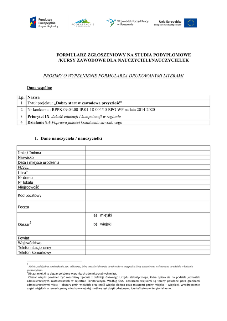 FORMULARZ ZGŁOSZENIOWY NA STUDIA PODYPLOMOWE /KURSY ZAWODOWE DLA NAUCZYCIELI/NAUCZYCIELEK PROSIMY O WYPEŁNIENIE FORMULARZA DRUKOWANYMI LITERAMI Dane wspólne Lp. Nazwa 1 Tytuł projektu: „Dobry start w zawodową przyszłość” 2 Nr konkursu : RPPK.09.04.00-IP.01-18-004/15 RPO WP na lata 2014-2020 3 4 Priorytet IX Jakość edukacji i kompetencji w regionie Działanie 9.4 Poprawa jakości kształcenia zawodowego I. Dane nauczyciela / nauczycielki Imię / Imiona Nazwisko Data i miejsce urodzenia PESEL 1 Ulica Nr domu Nr lokalu Miejscowość Kod pocztowy Poczta a) miejski Obszar 2 b) wiejski Powiat Województwo Telefon stacjonarny Telefon komórkowy 1 Należy podaćadres zamieszkania, tzn. taki adres, który umożliwi dotarcie do tej osoby w przypadku kiedy zostanie ona wylosowana do udziału w badaniu ewaluacyjnym. 2 Obszar miejski to obszar położony w granicach administracyjnych miast. Obszar wiejski powinien byd rozumiany zgodnie z definicją Głównego Urzędu statystycznego, która opiera się na podziale jednostek administracyjnych zastosowanych w rejestrze Terytorialnym. Według GUS, obszarami wiejskimi są tereny położone poza granicami administracyjnymi miast – obszary gmin wiejskich oraz częśd wiejska (leżąca poza miastem) gminy miejsko – wiejskiej. Wyodrębnienie części wiejskich w ramach gminy miejsko – wiejskiej możliwe jest dzięki odrębnemu identyfikatorowi terytorialnemu. Adres poczty elektronicznej (e-mail) Fakt bycia osobą z niepełnosprawnością (na podstawie orzeczenia) TAK/NIE II. Kryteria rekrutacji: Rodzaj kryterium Wypełnia nauczyciel/ka Wykształcenie :ukończony kierunek studiów, studia podyplomowe, kursy, szkolenia Nauczane przedmioty w ZST im. T. Kościuszki w Leżajsku Adekwatność formy wsparcia do posiadanego wykształcenia i nauczanych przedmiotów (kryterium obligatoryjne) Staż pracy (kryterium uzupełniające) Wypełnia Komisja Rekrutacyjna ---------------------------------------------------- TAK/NIE -------------------------------------------------------------- Łączna ilość punktów --------------------------------------------------------------- ……………………………………… Data wpływu dokumentów …………………………………………. Podpis osoby składającej dokumenty Uwaga ! W przypadku uzyskania równorzędnej pozycji na liście rankingowej premiowane będą osoby z grupy niedoreprezentowanej tj. osoby z niepełnosprawnościami (na podst. posiadanego orzeczenia) albo osoby legitymujące się dłuższym stażem pracy. III. Wybór formy wsparcia dla nauczycieli/nauczycielek ZST Prosimy wstawić znak „ X” tylko przy jednej wybranej formie wsparcia Lp. NAZWA KURSU ZAWODOWEGO 1. Budowa, programowanie i symulacja stanowisk zrobotyzowanych 2. Lutowanie gazowe 3. Nowoczesna technika pojazdów samochodowych 4. Technolog robót wykończeniowych w budownictwie 5. Obsługa programu Subject i Rachmistrz 6. Tworzenie i serwisowanie aplikacji w systemie wizualizacyjnym Wonderware in Touch Montaż, demontaż i regeneracja wyprowadzeń komponentów BGA/CSP 7. 8. Współrzędnościowa technika pomiarowa 9. NX CAD 1 10. Savoir vivre dla hotelarzy 11. Etykieta biznesu 12. Kelnerski I stopnia 13. Operator- programista CNC 14. Projektowanie mebli 15. Techniki pomiarowe i obsługa, wykonywanie pomiarów WYBÓR FORMY WSPARCIA wielofunkcyjnym miernikiem oraz sporządzanie protokołów pomiarów z wykorzystaniem programu Sonel PE 5 Lp. NAZWA STUDIÓW PODYPLOMOWYCH 1. Programowanie aplikacji webowych WYBÓR FORMY WSPARCIA 2. Budowa, obsługa i naprawa pojazdów samochodowych i maszyn rolniczych