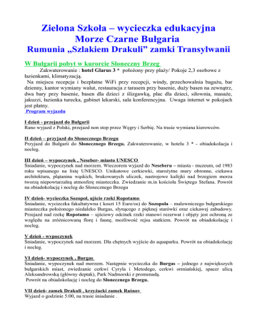 Zielona Szkoła – wycieczka edukacyjna Morze Czarne Bułgaria Rumunia „Szlakiem Drakuli” zamki Transylwanii W Bułgarii pobyt w kurorcie Słoneczny Brzeg Zakwaterowanie : hotel Glarus 3 * położony przy plaży/ Pokoje 2,3 osobowe z łazienkami, klimatyzacją. Na miejscu recepcja i bezpłatne WiFi przy recepcji, windy, przechowalnia bagażu, bar dzienny, kantor wymiany walut, restauracja z tarasem przy basenie, duży basen na zewnątrz, dwa bary przy basenie, basen dla dzieci z ślizgawką, plac dla dzieci, siłownia, masaże, jakuzzi, łazienka turecka, gabinet lekarski, sala konferencyjna. Uwaga internet w pokojach jest płatny. Program wyjazdu I dzień - przejazd do Bułgarii Rano wyjazd z Polski, przejazd non stop przez Węgry i Serbię. Na trasie wymiana kierowców. II dzień – przyjazd do Słonecznego Brzegu Przyjazd do Bułgarii do Słonecznego Brzegu. Zakwaterowanie, w hotelu 3 * - obiadokolacja i nocleg. III dzień – wypoczynek , Neseber- miasto UNESCO Śniadanie, wypoczynek nad morzem. Wieczorem wyjazd do Neseberu – miasta - muzeum, od 1983 roku wpisanego na listę UNESCO. Unikatowe cerkiewki, starożytne mury obronne, ciekawa architektura, plątanina wąskich, brukowanych uliczek, nastrojowe kafejki nad brzegiem morza tworzą niepowtarzalną atmosferę miasteczka. Zwiedzanie m.in kościoła Świętego Stefana. Powrót na obiadokolację i nocleg do Słonecznego Brzegu IV dzień- wycieczka Sozopoł, ujście rzeki Ropotamo Śniadanie, wycieczka fakultatywna ( koszt 15 Euro/os) do Sozopola – malowniczego bułgarskiego miasteczka położonego niedaleko Burgas, słynącego z pięknej starówki oraz ciekawej zabudowy. Przejazd nad rzekę Ropotamo – ujściowy odcinek rzeki stanowi rezerwat i objęty jest ochroną ze względu na zróżnicowaną florę i faunę, możliwość rejsu statkiem. Powrót na obiadokolację i nocleg. V dzień - wypoczynek Śniadanie, wypoczynek nad morzem. Dla chętnych wyjście do aquaparku. Powrót na obiadokolację i nocleg. VI dzień- wypoczynek , Burgas Śniadanie, wypoczynek nad morzem. Następnie wycieczka do Burgas – jednego z największych bułgarskich miast, zwiedzanie cerkwi Cyryla i Metodego, cerkwi ormiańskiej, spacer ulicą Aleksandrowską (główny deptak), Park Nadmorski z promenadą. Powrót na obiadokolację i nocleg do Słonecznego Brzegu. VII dzień- zamek Drakuli , krzyżacki zamek Raśnov Wyjazd o godzinie 5:00, na trasie śniadanie . Przyjazd do Rumunii do miasteczka Bran, zwiedzanie Białego Zamku zwanego również zamkiem Drakuli. Następnie przejazd do miejscowości Rasnov (zamek na skalnym wzgórzu). Obiadokolacja i nocleg w okolicach Sighisoary. VIII dzień- Sighisoara, „saski kościół obronny Biertan Śniadanie oraz prowiant na drogę powrotną zwiedzanie Sighişoary: Wieża Zegarowa, Kościół na Wzgórzu, Kościół Klasztorny, Dom Drakuli, Dom rodzinny Hermana Obertha, Mury i Baszty Obronne, przejazd na zwiedzanie największego w Siedmiogrodzie kościoła obronnego w Biertan wpisanego na listę UNESCO. Alternatywnie w tym dniu zamiast Sighisoary i Biertanu zwiedzanie Sybina i zamku w Hunedoarze. Dalsza podróż do Polski. IX dzień Powrót do Polski, zakończenie imprezy. CENA = 1.190-zł/os grupa min 40 osób + 3 opiekunów nieodpłatnie Cena obejmuje : przejazd autokarem LUX 6 noclegów w pokojach 2-osobowych z łazienkami – w Bułgarii hotel 3 * -posiłki w formie bufetu, w Rumunii hotel 2 * 6 śniadań, 6 obiadokolacji + prowiant ubezpieczenie Gothaer: NNW (do 10 000 zł/os) i KL (do 40 000zł/os) opieka pilota Cena nie obejmuje : biletów wstępu do zwiedzanych obiektów ok 20 lewa ( 11 Euro) 45 lei ( ok 40 zł) wycieczek fakultatywnych – np. do Sozopola i Ropotamo ( koszt 15 Euro/os ) ORGANIZATOR : Biuro Podróży Polan Travel ul/ 11 Listopada 60-62 - Bielsko-Biała tel. 33 81 19 550 www.polan-travel.com.pl