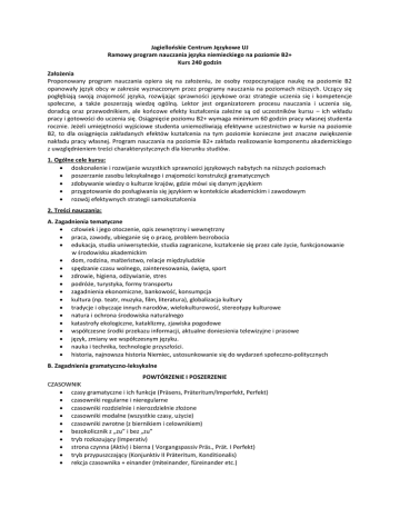 Jagiellońskie Centrum Językowe UJ Ramowy program nauczania języka niemieckiego na poziomie B2+ Kurs 240 godzin Założenia Proponowany program nauczania opiera się na założeniu, że osoby rozpoczynające naukę na poziomie B2 opanowały język obcy w zakresie wyznaczonym przez programy nauczania na poziomach niższych. Uczący się pogłębiają swoją znajomość języka, rozwijając sprawności językowe oraz strategie uczenia się i kompetencje społeczne, a także poszerzają wiedzę ogólną. Lektor jest organizatorem procesu nauczania i uczenia się, doradcą oraz przewodnikiem, ale końcowe efekty kształcenia zależne są od uczestników kursu – ich wkładu pracy i gotowości do uczenia się. Osiągnięcie poziomu B2+ wymaga minimum 60 godzin pracy własnej studenta rocznie. Jeżeli umiejętności wyjściowe studenta uniemożliwiają efektywne uczestnictwo w kursie na poziomie B2, to dla osiągnięcia zakładanych efektów kształcenia na tym poziomie konieczne jest znaczne zwiększenie nakładu pracy własnej. Program nauczania na poziomie B2+ zakłada realizowanie komponentu akademickiego z uwzględnieniem treści charakterystycznych dla kierunku studiów. 1. Ogólne cele kursu: doskonalenie i rozwijanie wszystkich sprawności językowych nabytych na niższych poziomach poszerzanie zasobu leksykalnego i znajomości konstrukcji gramatycznych zdobywanie wiedzy o kulturze krajów, gdzie mówi się danym językiem przygotowanie do posługiwania się językiem w kontekście akademickim i zawodowym rozwój efektywnych strategii samokształcenia 2. Treści nauczania: A. Zagadnienia tematyczne człowiek i jego otoczenie, opis zewnętrzny i wewnętrzny praca, zawody, ubieganie się o pracę, problem bezrobocia edukacja, studia uniwersyteckie, studia zagraniczne, kształcenie się przez całe życie, funkcjonowanie w środowisku akademickim dom, rodzina, małżeństwo, relacje międzyludzkie spędzanie czasu wolnego, zainteresowania, święta, sport zdrowie, higiena, odżywianie, stres podróże, turystyka, formy transportu zagadnienia ekonomiczne, bankowość, konsumpcja kultura (np. teatr, muzyka, film, literatura), globalizacja kultury tradycje i obyczaje innych narodów, wielokulturowość, stereotypy kulturowe natura i ochrona środowiska naturalnego katastrofy ekologiczne, kataklizmy, zjawiska pogodowe współczesne środki przekazu informacji, aktualne doniesienia telewizyjne i prasowe język, zmiany we współczesnym języku. nauka i technika, technologie przyszłości. historia, najnowsza historia Niemiec, ustosunkowanie się do wydarzeń społeczno-politycznych B. Zagadnienia gramatyczno-leksykalne POWTÓRZENIE I POSZERZENIE CZASOWNIK czasy gramatyczne i ich funkcje (Präsens, Präteritum/Imperfekt, Perfekt) czasowniki regularne i nieregularne czasowniki rozdzielnie i nierozdzielnie złożone czasowniki modalne (wszystkie czasy, użycie) czasowniki zwrotne (z biernikiem i celownikiem) bezokolicznik z „zu” i bez „zu” tryb rozkazujący (Imperativ) strona czynna (Aktiv) i bierna ( Vorgangspassiv Präs., Prät. I Perfekt) tryb przypuszczający (Konjunktiv II Präteritum, Konditionalis) rekcja czasownika + einander (miteinander, füreinander etc.) RZECZOWNIK deklinacja (rodzaj i końcówka, liczba pojedyncza i mnoga, odmiana przez przypadki) rodzajnik (określony, nieokreślony) PRZYMIOTNIK deklinacja – po rodzajniku określonym, nieokreślonym, bez rodzajnika oraz po zaimkach stopniowanie regularne i nieregularne, porównania (höher als) połączenie stopniowania i deklinacji (der höchste Turm) rekcja przymiotnika (bekannt für) LICZEBNIK liczebniki główne i porządkowe określanie czasu ZAIMKI zaimki osobowe i dzierżawcze zaimki pytające i względne zaimki zwrotne i wzajemne (sich / einander) zaimek nieosobowy „es” i inne PRZYIMKI przyimki czasowe – z Dativem (np. ab / aus / nach), z Akkusativem (np. bis / für), z Genitivem (np. während / innerhalb) Wechselpräpositionen (in / vor / zwischen / über) przyimki miejsca – z Dativem (np. gegenüber / von / nach), z Akkusativem (np. bis / durch / entlang) przyimki z Genitivem ZDANIE przeczenie – np. nicht / kein / niemand pozycja przeczenia w zdaniu spójniki: zdanie główne + zdanie główne, np. und, aber, deshalb spójniki: zdanie główne + zdanie podrzędne (czasownik na końcu zdania): np. dass, wenn zdania okolicznikowe czasu (np. als / wenn / während) zdania okolicznikowe przyczyny (Weil / da) zdania okolicznikowe warunku (wenn / falls) zdania okolicznikowe przyzwolenia (obwohl / trotzdem) zdania okolicznikowe celu (damit / um...zu) zdania dopełnieniowe z dass / konstrukcja bezokolicznikowa z zu rekcja czasownika oraz zdania złożone z damit / dafür etc. + …zu / dass zdania przydawkowe z: der / die / das oraz was / womit / wofür etc. zdania warunkowe nierzeczywiste (wenn + Konjunktiv II Präteritum/würde+ bezokolicznik) zdania ze spójnikami dwuczłonowymi (np. weder…noch / entweder…oder) WPROWADZENIE NOWYCH STRUKTUR CZASOWNIK czasy gramatyczne i ich funkcje ( Plusquamperfekt, Futur I i II) strona bierna z czasownikiem modalnym (Vorgangspassiv mit Modalverb) strona bierna Zustandspassiv struktury zastępujące Passiv (Passiversatzformen: lassen/ sein +zu + Inf./ -bar) Partizip I i II jako przydawka, przydawka rozwinięta, przekształcanie na zdania przydawkowe (der lesende Vater, das gestern von mir gekaufte Buch) Konjunktiv I i mowa zależna (Er sagte, er sei unglücklich) Gerundivum (der zu übersetzende Text) RZECZOWNIK rekcja rzeczownika (Achtung vor) tworzenie rzeczowników od czasowników i przymiotników (achten – Achtung) PRZYMIOTNIK przedrostki i przyrostki przymiotników (ur-/ über-/ un-/ miss-/ il-/ -los/ -lich/ -bar/ -ig/ -ent/ -ell/ i in.), przysłówki wzmacniające przymiotnik (recht/ überhaupt/ sehr i.in.) liczebniki ułamkowe, jednostki miary i wagi (ein Drittel) ZDANIE budowa zdania – kolejność części mowy w zdaniu, szczególnie okoliczników zdania ok