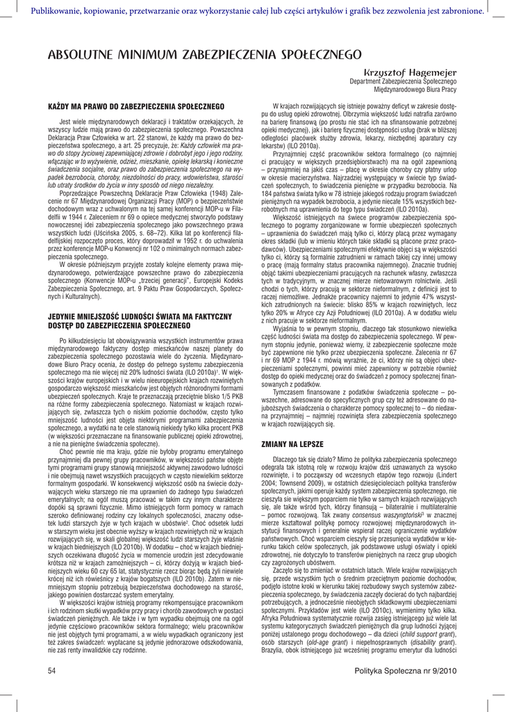 Publikowanie, kopiowanie, przetwarzanie oraz wykorzystanie całej lub części artykułów i grafik bez zezwolenia jest zabronione. ABSOLUTNE MINIMUM ZABEZPIECZENIA SPOŁECZNEGO Krzysztof Hagemejer Department Zabezpieczenia Społecznego Międzynarodowego Biura Pracy KAŻDY MA PRAWO DO ZABEZPIECZENIA SPOŁECZNEGO Jest wiele międzynarodowych deklaracji i traktatów orzekających, że wszyscy ludzie mają prawo do zabezpieczenia społecznego. Powszechna Deklaracja Praw Człowieka w art. 22 stanowi, że każdy ma prawo do bezpieczeństwa społecznego, a art. 25 precyzuje, że: Każdy człowiek ma prawo do stopy życiowej zapewniającej zdrowie i dobrobyt jego i jego rodziny, włączając w to wyżywienie, odzież, mieszkanie, opiekę lekarską i konieczne świadczenia socjalne, oraz prawo do zabezpieczenia społecznego na wypadek bezrobocia, choroby, niezdolności do pracy, wdowieństwa, starości lub utraty środków do życia w inny sposób od niego niezależny. Poprzedzające Powszechną Deklaracje Praw Człowieka (1948) Zalecenie nr 67 Międzynarodowej Organizacji Pracy (MOP) o bezpieczeństwie dochodowym wraz z uchwalonym na tej samej konferencji MOP-u w Filadelfii w 1944 r. Zaleceniem nr 69 o opiece medycznej stworzyło podstawy nowoczesnej idei zabezpieczenia społecznego jako powszechnego prawa wszystkich ludzi (Uścińska 2005, s. 68–72). Kilka lat po konferencji filadelfijskiej rozpoczęto proces, który doprowadził w 1952 r. do uchwalenia przez konferencje MOP-u Konwencji nr 102 o minimalnych normach zabezpieczenia społecznego. W okresie późniejszym przyjęte zostały kolejne elementy prawa międzynarodowego, potwierdzające powszechne prawo do zabezpieczenia społecznego (Konwencje MOP-u „trzeciej generacji”, Europejski Kodeks Zabezpieczenia Społecznego, art. 9 Paktu Praw Gospodarczych, Społecznych i Kulturalnych). JEDYNIE MNIEJSZOŚĆ LUDNOŚCI ŚWIATA MA FAKTYCZNY DOSTĘP DO ZABEZPIECZENIA SPOŁECZNEGO Po kilkudziesięciu lat obowiązywania wszystkich instrumentów prawa międzynarodowego faktyczny dostęp mieszkańców naszej planety do zabezpieczenia społecznego pozostawia wiele do życzenia. Międzynarodowe Biuro Pracy ocenia, że dostęp do pełnego systemu zabezpieczenia społecznego ma nie więcej niż 20% ludności świata (ILO 2010a)1. W większości krajów europejskich i w wielu nieeuropejskich krajach rozwiniętych gospodarczo większość mieszkańców jest objętych różnorodnymi formami ubezpieczeń społecznych. Kraje te przeznaczają przeciętnie blisko 1/5 PKB na różne formy zabezpieczenia społecznego. Natomiast w krajach rozwijających się, zwłaszcza tych o niskim poziomie dochodów, często tylko mniejszość ludności jest objęta niektórymi programami zabezpieczenia społecznego, a wydatki na te cele stanowią niekiedy tylko kilka procent PKB (w większości przeznaczane na finansowanie publicznej opieki zdrowotnej, a nie na pieniężne świadczenia społeczne). Choć pewnie nie ma kraju, gdzie nie byłoby programu emerytalnego przynajmniej dla pewnej grupy pracowników, w większości państw objęte tymi programami grupy stanowią mniejszość aktywnej zawodowo ludności i nie obejmują nawet wszystkich pracujących w często niewielkim sektorze formalnym gospodarki. W konsekwencji większość osób na świecie dożywających wieku starszego nie ma uprawnień do żadnego typu świadczeń emerytalnych; na ogół muszą pracować w takim czy innym charakterze dopóki są sprawni fizycznie. Mimo istniejących form pomocy w ramach szeroko definiowanej rodziny czy lokalnych społeczności, znaczny odsetek ludzi starszych żyje w tych krajach w ubóstwie2. Choć odsetek ludzi w starszym wieku jest obecnie wyższy w krajach rozwiniętych niż w krajach rozwijających się, w skali globalnej większość ludzi starszych żyje właśnie w krajach biedniejszych (ILO 2010b). W dodatku – choć w krajach biedniejszych oczekiwana długość życia w momencie urodzin jest zdecydowanie krótsza niż w krajach zamożniejszych – ci, którzy dożyją w krajach biedniejszych wieku 60 czy 65 lat, statystycznie rzecz biorąc będą żyli niewiele krócej niż ich rówieśnicy z krajów bogatszych (ILO 2010b). Zatem w niemniejszym stopniu potrzebują bezpieczeństwa dochodowego na starość, jakiego powinien dostarczać system emerytalny. W większości krajów istnieją programy rekompensujące pracownikom i ich rodzinom skutki wypadków przy pracy i chorób zawodowych w postaci świadczeń pieniężnych. Ale także i w tym wypadku obejmują one na ogół jedynie częściowo pracowników sektora formalnego; wielu pracowników nie jest objętych tymi programami, a w wielu wypadkach ograniczony jest też zakres świadczeń: wypłacane są jedynie jednorazowe odszkodowania, nie zaś renty inwalidzkie czy rodzinne. 54 W krajach rozwijających się istnieje poważny deficyt w zakresie dostępu do usług opieki zdrowotnej. Olbrzymia większość ludzi natrafia zarówno na barierę finansową (po prostu nie stać ich na sfinansowanie potrzebnej opieki medycznej), jak i barierę fizycznej dostępności usług (brak w bliższej odległości placówek służby zdrowia, lekarzy, niezbędnej aparatury czy lekarstw) (ILO 2010a). Przynajmniej część pracowników sektora formalnego (co najmniej ci pracujący w większych przedsiębiorstwach) ma na ogół zapewnioną – przynajmniej na jakiś czas – płacę w okresie choroby czy płatny urlop w okresie macierzyństwa. Najrzadziej występujący w świecie typ świadczeń społecznych, to świadczenia pieniężne w przypadku bezrobocia. Na 184 państwa świata tylko w 78 istnieje jakiegoś rodzaju program świadczeń pieniężnych na wypadek bezrobocia, a jedynie niecałe 15% wszystkich bezrobotnych ma uprawnienia do tego typu świadczeń (ILO 2010a). Większość istniejących na świece programów zabezpieczenia społecznego to pogramy zorganizowane w formie ubezpieczeń społecznych – uprawnienia do świadcze