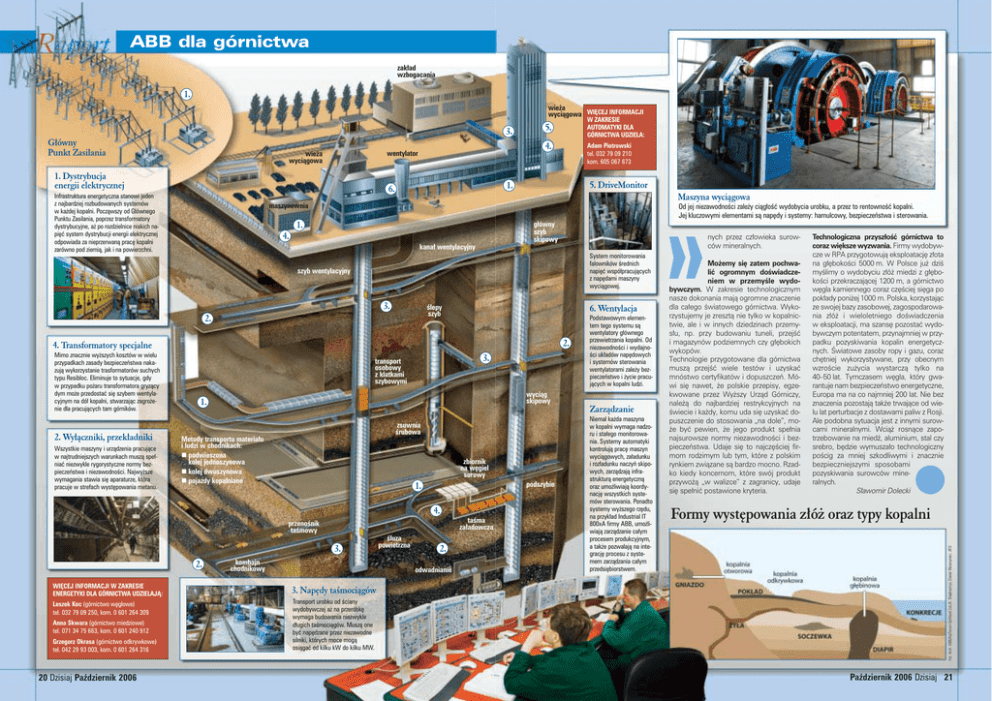 ABB dla górnictwa zak∏ad wzbogacania 1. wie˝a wyciàgowa WI¢CEJ INFORMACJI 3. 4. wentylator wie˝a wyciàgowa 1. Dystrybucja energii elektrycznej 5. DriveMonitor 1. 6. Infrastruktura energetyczna stanowi jeden z najbardziej rozbudowanych systemów w ka˝dej kopalni. Poczàwszy od G∏ównego Punktu Zasilania, poprzez transformatory dystrybucyjne, a˝ po rozdzielnice niskich napi´ç system dystrybucji energii elektrycznej odpowiada za nieprzerwanà prac´ kopalni zarówno pod ziemià, jak i na powierzchni. Adam Piotrowski tel. 032 79 09 210 kom. 605 067 673 Maszyna wyciàgowa maszynownia Od jej niezawodnoÊci zale˝y ciàg∏oÊç wydobycia urobku, a przez to rentownoÊç kopalni. Jej kluczowymi elementami sà nap´dy i systemy: hamulcowy, bezpieczeƒstwa i sterowania. g∏ówny szyb skipowy 1. 4. nych przez cz∏owieka surowców mineralnych. kana∏ wentylacyjny System monitorowania falowników Êrednich napi´ç wspó∏pracujàcych z nap´dami maszyny wyciàgowej. szyb wentylacyjny 3. Êlepy szyb 2. 6. Wentylacja 2. 4. Transformatory specjalne Mimo znacznie wy˝szych kosztów w wielu przypadkach zasady bezpieczeƒstwa nakazujà wykorzystanie trasformatorów suchych typu Resibloc. Eliminuje to sytuacje, gdy w przypadku po˝aru transformatora gryzàcy dym mo˝e przedostaç si´ szybem wentylacyjnym na dó∏ kopalni, stwarzajàc zagro˝enie dla pracujàcych tam górników. 2. Wy∏àczniki, przek∏adniki Wszystkie maszyny i urzàdzenia pracujàce w najtrudniejszych warunkach muszà spe∏niaç niezwykle rygorystyczne normy bezpieczeƒstwa i niezawodnoÊci. Najwy˝sze wymagania stawia si´ aparaturze, która pracuje w strefach wyst´powania metanu. 3. transport osobowy z klatkami szybowymi wyciàg skipowy 1. Zarzàdzanie zsuwnia Êrubowa Metody transportu materia∏u i ludzi w chodnikach: podwieszona kolej jednoszynowa kolej dwuszynowa pojazdy kopalniane zbiornik na w´giel surowy podszybie 1. 4. taÊma za∏adowcza przenoÊnik taÊmowy 3. 2. kombajn chodnikowy 3. Nap´dy taÊmociàgów Leszek Koc (górnictwo w´glowe) tel. 032 79 09 250, kom. 0 601 264 309 Transport urobku od Êciany wydobywczej a˝ na przeróbk´ wymaga budowania niezwykle d∏ugich taÊmociàgów. Muszà one byç nap´dzane przez niezawodne silniki, których moce mogà osiàgaç od kilku kW do kilku MW. Grzegorz Okrasa (górnictwo odkrywkowe) tel. 042 29 93 003, kom. 0 601 264 316 20 Dzisiaj Paêdziernik 2006 Êluza powietrzna 2. odwadnianie WI¢CEJ INFORMACJI W ZAKRESIE ENERGETYKI DLA GÓRNICTWA UDZIELAJÑ: Anna Skwara (górnictwo miedziowe) tel. 071 34 75 663, kom. 0 601 240 912 Podstawowym elementem tego systemu sà wentylatory g∏ównego przewietrzania kopalni. Od niezawodnoÊci i wydajnoÊci uk∏adów nap´dowych i systemów sterowania wentylatorami zale˝y bezpieczeƒstwo i ˝ycie pracujàcych w kopalni ludzi. Niemal ka˝da maszyna w kopalni wymaga nadzoru i sta∏ego monitorowania. Systemy automatyki kontrolujà prac´ maszyn wyciàgowych, za∏adunku i roz∏adunku naczyƒ skipowych, zarzàdzajà infrastrukturà energetycznà oraz umo˝liwiajà koordynacj´ wszystkich systemów sterowania. Ponadto systemy wy˝szego rz´du, na przyk∏ad Industrial IT 800xA firmy ABB, umo˝liwiajà zarzàdzanie ca∏ym procesem produkcyjnym, a tak˝e pozwalajà na integracj´ procesu z systemem zarzàdzania ca∏ym przedsi´biorstwem. Możemy się zatem pochwalić ogromnym doświadczeniem w przemyśle wydobywczym. W zakresie technologicznym nasze dokonania majà ogromne znaczenie dla ca∏ego Êwiatowego górnictwa. Wykorzystujemy je zresztà nie tylko w kopalnictwie, ale i w innych dziedzinach przemys∏u, np. przy budowaniu tuneli, przejÊç i magazynów podziemnych czy g∏´bokich wykopów. Technologie przygotowane dla górnictwa muszà przejÊç wiele testów i uzyskaç mnóstwo certyfikatów i dopuszczeƒ. Mówi si´ nawet, ˝e polskie przepisy, egzekwowane przez Wy˝szy Urzàd Górniczy, nale˝à do najbardziej restrykcyjnych na Êwiecie i ka˝dy, komu uda si´ uzyskaç dopuszczenie do stosowania „na dole”, mo˝e byç pewien, ˝e jego produkt spe∏nia najsurowsze normy niezawodnoÊci i bezpieczeƒstwa. Udaje si´ to najcz´Êciej firmom rodzimym lub tym, które z polskim rynkiem zwiàzane sà bardzo mocno. Rzadko kiedy koncernom, które swój produkt przywo˝à „w walizce” z zagranicy, udaje si´ spe∏niç postawione kryteria. Technologiczna przyszłość górnictwa to coraz większe wyzwania. Firmy wydobywcze w RPA przygotowujà eksploatacj´ z∏ota na g∏´bokoÊci 5000 m. W Polsce ju˝ dziÊ myÊlimy o wydobyciu z∏ó˝ miedzi z g∏´bokoÊci przekraczajàcej 1200 m, a górnictwo w´gla kamiennego coraz cz´Êciej si´ga po pok∏ady poni˝ej 1000 m. Polska, korzystajàc ze swojej bazy zasobowej, zagospodarowania z∏ó˝ i wieloletniego doÊwiadczenia w eksploatacji, ma szans´ pozostaç wydobywczym potentatem, przynajmniej w przypadku pozyskiwania kopalin energetycznych. Âwiatowe zasoby ropy i gazu, coraz ch´tniej wykorzystywane, przy obecnym wzroÊcie zu˝ycia wystarczà tylko na 40–50 lat. Tymczasem w´gla, który gwarantuje nam bezpieczeƒstwo energetyczne, Europa ma na co najmniej 200 lat. Nie bez znaczenia pozostajà tak˝e trwajàce od wielu lat perturbacje z dostawami paliw z Rosji. Ale podobna sytuacja jest z innymi surowcami mineralnymi. Wcià˝ rosnàce zapotrzebowanie na miedê, aluminium, stal czy srebro, b´dzie wymusza∏o technologiczny poÊcig za mniej szkodliwymi i znacznie bezpieczniejszymi sposobami pozyskiwania surowców mineralnych. S∏awomir Dolecki Formy wyst´powania z∏ó˝ oraz typy kopalni Fot. Arch. ABB/AlpTransit Gotthard Ltd./A. Stephan/rys. Daniel Wawrzyniec. ATO G∏ówny Punkt Zasilania W ZAKRESIE AUTOMATYKI DLA GÓRNICTWA UDZIELA: 5. Paêdziernik 2006 Dzisiaj 21