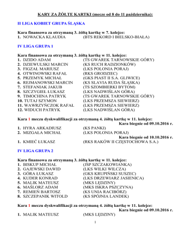 KARY ZA ŻÓŁTE KARTKI (mecze od 8 do 11 października): II LIGA KOBIET GRUPA ŚLĄSKA Kara finansowa za otrzymaną 3. żółtą kartkę w 7. kolejce: 1. NOWACKA KLAUDIA (BTS REKORD I BIELSKO-BIAŁA) IV LIGA GRUPA 1 Kara finansowa za otrzymaną 3. żółtą kartkę w 11. kolejce: 1. DZIDO ADAM (TS GWAREK TARNOWSKIE GÓRY) 2. DZIEWULSKI MARCIN (KS RUCH RADZIONKÓW) 3. FIGZAŁ MARIUSZ (LKS POLONIA PORAJ) 4. OTWINOWSKI RAFAŁ (RKS GRODZIEC) 5. PRZEMYK MICHAŁ (GKS PIAST II S.A. GLIWICE) 6. REJMANOWSKI MARCIN (KS SLAVIA RUDA ŚLĄSKA) 7. STEFANIAK JAKUB (TS SZOMBIERKI BYTOM) 8. SZCZYGIEŁ ŁUKASZ (LKS NADWIŚLAN GÓRA) 9. TIMOCHINA PATRYK (TS GWAREK TARNOWSKIE GÓRY) 10. TUTAJ SZYMON (LKS PRZEMSZA SIEWIERZ) 11. WAWRZYŃCZOK RAFAŁ (LKS PRZEMSZA SIEWIERZ) 12. WIDUCH PATRYK (LKS NADWIŚLAN GÓRA) Kara 1 meczu dyskwalifikacji za otrzymaną 4. żółtą kartkę w 11. kolejce: Kara biegnie od 09.10.2016 r. 1. HYRA ARKADIUSZ (KS PANKI) 2. MIZGAŁA MICHAŁ (LKS POLONIA PORAJ) Kara biegnie od 10.10.2016 r. 1. KMIEĆ ŁUKASZ (RKS RAKÓW II CZĘSTOCHOWA S.A.) IV LIGA GRUPA 2 Kara finansowa za otrzymaną 3. żółtą kartkę w 11. kolejce: 1. BISKUP MICHAŁ (JSP SZCZAKOWIANKA) 2. GAJEWSKI DAWID (LKS WILKI WILCZA) 3. GÓRA ŁUKASZ (GKS KRUPIŃSKI SUSZEC) 4. KUDER KONRAD (LKS DRZEWIARZ JASIENICA) 5. MALIK MATEUSZ (MKS LĘDZINY) 6. MAŚLORZ ADAM (MKS ISKRA PSZCZYNA) 7. REMIEŃ BARTOSZ (KS UNIA RACIBÓRZ) 8. SZCZEPANIK WITOLD (KS SPÓJNIA LANDEK) Kara 1 meczu dyskwalifikacji za otrzymaną 4. żółtą kartkę w 11. kolejce: Kara biegnie od 09.10.2016 r. 1. MALIK MATEUSZ (MKS LĘDZINY) 1 2. 3. 4. 5. 6. NIEDZIELSKI DANIEL TABIŚ TOMASZ WALCZAK MAREK WIERCIOCH DAWID WÓJCIK BARTOSZ 1. GURBISZ DANIEL (JSP SZCZAKOWIANKA) (LKS WILKI WILCZA) (JSP SZCZAKOWIANKA) (LKS ORZEŁ MOKRE) (KS POLONIA ŁAZISKA GÓRNE) Kara biegnie od 10.10.2016 r. (KS SPÓJNIA LANDEK) KLASA OKRĘGOWA GRUPA 1 Kara finansowa za otrzymaną 3. żółtą kartkę w 9. kolejce: 1. GOGOLOK PIOTR (LKS TEMPO PANIÓWKI) 2. JURECKI ROBERT (KS PIAST BIERUŃ) 3. KLAJA RAFAŁ (LKS ŁĄKA) 4. KOKOT ARIEL (MKS POGOŃ RUDA ŚLĄSKA) 5. MYSZOR WOJCIECH (GTS BOJSZOWY) 6. POLAK PAWEŁ (AKS MIKOŁÓW) 7. POLARZ MARCIN (LKS POGOŃ IMIELIN) 8. ZUBEL BARTŁOMIEJ (BKS SPARTA KATOWICE) Kara 1 meczu dyskwalifikacji za otrzymaną 4. żółtą kartkę w 9. kolejce: Kara biegnie od 09.10.2016 r. 1. GRZESIK ROBERT (GKS URANIA RUDA ŚLĄSKA) 2. JENDRYCHOWSKI OSKAR (LKS TEMPO PANIÓWKI) 3. LEWICKI ARKADIUSZ (GTS BOJSZOWY) 4. TODORSKI ŁUKASZ (BKS SPARTA KATOWICE) Kara finansowa za otrzymaną 6. żółtą kartkę w 9. kolejce: 1. PYRLIK MICHAŁ (GTS BOJSZOWY) KLASA OKRĘGOWA GRUPA 2 Kara finansowa za otrzymaną 3. żółtą kartkę w 9. kolejce: 1. GOLD MATEUSZ (LKS MŁODOŚĆ RUDNO) 2. MARGECIOK PATRYK (KS NAPRZÓD RYDUŁTOWY) 3. POLOCZEK IRENEUSZ (LKS DRAMA ZBROSŁAWICE) 4. WIKLAK RAFAŁ (LKS ZAMECZEK CZERNICA) Kara 1 meczu dyskwalifikacji za otrzymaną 4. żółtą kartkę w 9. kolejce: Kara biegnie od 09.10.2016 r. 1. CZERNY TOMASZ (LKS 1908 NĘDZA) 2. MARGECIOK PATRYK (KS NAPRZÓD RYDUŁTOWY) 3. POLOCZEK IRENEUSZ (LKS DRAMA ZBROSŁAWICE) 4. WUJEK MARCIN (LKS DRAMA ZBROSŁAWICE) 2 Kara biegnie od 10.10.2016 r. 1. MORIC ŁUKASZ (LKS BUK RUDY) KLASA OKRĘGOWA GRUPA 3 Kara finansowa za otrzymaną 3. żółtą kartkę w 9. kolejce: 1. DUDEK PIOTR (LKS GWIAZDA SKRZYSZÓW) 2. GOJNY DANIEL (APN ODRA SP. Z O.O.) 3. KAMCZYK ADRIAN (LKS SILESIA LUBOMIA) 4. KRUPIŃSKI JAN (LKS NAPRZÓD 46 ZAWADA) 5. SAJBOR JACEK (KS 27 GOŁKOWICE) 6. TURKIEWICZ ADAM (LKS KRZYŻANOWICE) 7. ZDUNEK PAWEŁ (LKS NAPRZÓD CZYŻOWICE) Kara 1 meczu dyskwalifikacji za otrzymaną 4. żółtą kartkę w 9. kolejce: Kara biegnie od 09.10.2016 r. 1. WIELGOSIŃSKI MARCIN (LKS NAPRZÓD 46 ZAWADA) 2. ZAJDA ŁUKASZ (KS RAFAKO RACIBÓRZ) Kara biegnie od 10.10.2016 r. 1. HUDEK BARTOSZ (LKS GWIAZDA SKRZYSZÓW) 2. TRONT KAMIL (LKS GWIAZDA SKRZYSZÓW) Kara finansowa za otrzymaną 6. żółtą kartkę w 9. kolejce: 1. KUŹDUB DAWID (LKS POLONIA ŁAZISKA) KLASA OKRĘGOWA GRUPA 4 Kara finansowa za otrzymaną 3. żółtą kartkę w 9. kolejce: 1. BIAŁEK MICHAŁ (KKS ŁAZOWIANKA ŁAZY) 2. CIEŚLIK DANIEL (LKS TĘCZA BŁĘDÓW) 3. DRAMSKI DAMIAN (LKS UNIA ŚWIERKLANIEC) 4. FRANIEL WOJCIECH (HKS ODRA MIASTECZKO ŚLĄSKIE) 5. KOPYSTYNSKYI ROMAN (AKS WYZWOLENIE CEZ CHORZÓW) 6. KRUCZEK MACIEJ (KS UNIA DĄBROWA GÓRNICZA) 7. POŚPIECH DAWID (KS SILESIA MIECHOWICE) 8. STOLARCZYK ŁUKASZ (LKS ORZEŁ NAKŁO ŚLĄSKIE) Kara 1 meczu dyskwalifikacji za otrzymaną 4. żółtą kartkę w 9. kolejce: Kara biegnie od 09.10.2016 r. 1. BIAŁEK PIOTR (KKS ŁAZOWIANKA ŁAZY) 2. KOŚCIELNY DAMIAN (KS CYKLON ROGOŹNIK) 3. MAŁACZYŃSKI PATRYK (LKS UNIA ŚWIERKLANIEC) 4. NIEWOLIK KAROL (LKS ORZEŁ NAKŁO ŚLĄSKIE) 3 I LIGA WOJEWÓDZKA JUNIORÓW (A1) Kara 1 meczu dyskwalifikacji za otrzymaną 4. żółtą kartkę w 9. kolejce: Kara biegnie od 10.10.2016 r. 1. KNAPEK JAKUB (TS CZARNI - GÓRAL ŻYWIEC) 2. PALECZNY ADRIAN (SP MOSiR JASTRZĘBIE) 3. PALECZNY OSKAR (SP MOSiR JASTRZĘBIE) 4. STAROWICZ DAMIAN (KS ROZWÓJ KATOWICE) II LIGA WOJEWÓDZKA JUNIORÓW MŁODSZYCH GRUPA POŁUDNIOWA (B1) Kara 1 meczu dyskwalifikacji za otrzymaną 4. żółtą kartkę w 8. kolejce: Kara biegnie od 09.10.2016 r. 1. SZWEDA MATEUSZ (KS SZCZERBICE) 4