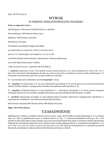 Sygn. akt II Ka 429/15 WYROK W IMIENIU RZECZYPOSPOLITEJ POLSKIEJ Dnia 12 stycznia 2016 r. Sąd Okręgowy w Rzeszowie Wydział II Karny w składzie: Przewodniczący: SSO Mariusz Sztorc (spr.) Sędziowie: SSO Grażyna Artymiak SSO Bożena Przysada Protokolant: protokolant Małgorzata Dąbek po rozpoznaniu na rozprawie w dniu 12 stycznia 2016 r. sprawy J. P. oskarżonego o przestępstwo z at. 157 § 2 kk na skutek apelacji wniesionej przez oskarżonego i obrońcę oskarżonego od wyroku Sądu Rejonowego w Dębicy z dnia 15 czerwca 2015 r., sygnatura akt II K 698/14 I. zmienia zaskarżony wyrok w ten sposób, że przy zastosowaniu art. 4 § 1 kk na podstawie art. 69 § 1 kk i 70 § 1 pkt 2 kk w brzmieniu obowiązującym do dnia 30 czerwca 2015 roku, warunkowo zawiesza wobec oskarżonego J. P. wykonanie orzeczonej kary grzywny na okres próby lat 2 (dwóch), II. w pozostałej części zaskarżony wyrok utrzymuje w mocy, III. zasądza od oskarżonego J. P. na rzecz oskarżyciela prywatnego K. M. kwotę 420,00 zł (czterysta dwadzieścia złotych) tytułem udziału w postępowaniu odwoławczym pełnomocnika adwokata J. B., IV. zasądza od Skarbu Państwa na rzecz adwokat B. A. – Kancelaria Adwokacka w D. kwotę 516,60 zł (pięćset szesnaście złotych 60/100) tytułem nieopłaconej pomocy prawnej udzielonej oskarżonemu z urzędu, V. zwalnia oskarżonego od zapłaty na rzecz Skarbu Państwa kosztów sądowych za postępowanie odwoławcze, a poniesionymi wydatkami w tym zakresie obciąża Skarb Państwa. SSO Grażyna Artymiak SSO Mariusz Sztorc SSO Bożena Przysada Sygn. akt II Ka 429/15 UZASADNIENIE Sąd Rejonowy w Dębicy, wyrokiem z dnia 15 czerwca 2015 r., sygn. akt II K 698/14 uznał oskarżonego J. P. za winnego tego, że w dniu 13 października 2014r. w miejscowości P.-S., woj. (...) naruszył nietykalność cielesną K. M., w ten sposób, że chwycił go ręką za szyję i dusił go, przy czym czynu tego dopuścił się mając w znacznym stopniu ograniczoną zdolność do rozpoznania znaczenia czynu i pokierowania swoim postępowaniem, tj. popełnienia przestępstwa z art. 217 § 1 kk w zw. z art. 31 § 2 kk i za czyn ten na mocy art. 217 § 1 kk skazał go na karę grzywny w wymiarze 50 stawek dziennych, przyjmując wysokość jednej stawki dziennej na kwotę 10 złotych. Na podstawie art. 46 § 1 kk zobowiązał oskarżonego do zapłaty na rzecz oskarżyciela prywatnego K. M. zadośćuczynienia za doznaną krzywdę w kwocie 200 złotych. W oparciu o przepis art. 29 ust. 1 Prawo o adwokaturze zasądził od Skarbu Państwa na rzecz Kancelarii Adwokackiej adw. B. A. kwotę 442,80 złotych tytułem kosztów nieopłaconej pomocy prawnej udzielonej oskarżonemu z urzędu. Na mocy art. 628 pkt 1 kpk zasądził od oskarżonego na rzecz oskarżyciela prywatnego K. M. kwotę 300 złotych tytułem poniesionych przez niego kosztów procesu. Na podstawie art. 624 § 1 kpk zwolnił oskarżonego w całości od zapłaty na rzecz Skarbu państwa kosztów procesu, a wydatkami obciążył Skarb Państwa. Apelację od powyższego wyroku wniósł oskarżony J. P., jak również jego obrońca. Obaj zaskarżyli powyższy wyrok w części dotyczącej orzeczenia o karze na korzyść oskarżonego. Oskarżony J. P. podniósł rażącą niewspółmierność orzeczonej w stosunku do oskarżonego kary pozbawienia wolności. Wywodząc powyższe wniósł o zmianę rozstrzygnięcia poprzez warunkowe umorzenie postępowania w stosunku do oskarżonego. Obrońca zarzucił powyższemu rozstrzygnięciu rażącą surowość orzeczonej kary grzywny i zadośćuczynienia zasądzonego na rzecz oskarżyciela prywatnego i wniósł o zmianę zaskarżonego wyroku poprzez zmniejszenie grzywny i warunkowe jej zawieszenie oraz zmniejszenie kwoty zadośćuczynienia zasądzonego na rzecz oskarżyciela prywatnego. Sąd Okręgowy zważył, co następuje: Apelacje są zasadne, o ile skutkują warunkowym zawieszeniem wykonania wymierzonej kary grzywny. Ze względu na to, że apelacje zwrócone zostały tylko przeciwko orzeczeniu o karze zbędne stało się rozważanie prawidłowości wyroku Sądu Rejonowego w zakresie dokonanych ustaleń faktycznych i winy oskarżonego. Dla porządku powiedzieć jednak należy, iż Sąd Rejonowy ujawniony w trakcie rozprawy głównej materiał dowodowy poddał właściwej ocenie. W uzasadnieniu zaskarżonego wyroku wskazał na dowody, na podstawie których dokonał ustaleń faktycznych, jak i wskazał powody, dla których odmówił wiary dowodom przeciwnym. W rozpoznaniu sprawy Sąd I instancji nie dopuścił się błędu w ustaleniach faktycznych. Okoliczności kształtujące wymiar kary wobec oskarżonego Sąd I instancji przedstawił w uzasadnieniu zaskarżonego wyroku wskazując, że wymierzając oskarżonemu karę kierował się przesłankami art. 53 kk, a zatem miał na uwadze stopień winy i społecznej szkodliwości czynu, motywację sprawcy, sposób jego działania, jak też jego właściwości. Prawidłowo Sąd Rejonowy dokonał doboru rodzaju kary jako kara grzywny. W niewystarczającym jednak stopniu rozważył sytuację życiową oskarżonego w zakresie możliwości udźwignięcia wymierzonej kary. Sąd I instancji nie dostrzegł, że oskarżony jest osobą o ograniczonych możliwościach życiowych, co znajduje swój wyraz także w ograniczonej poczytalności w czasie popełnienia przypisanego mu czynu. Przekłada się negatywnie na możliwość zapewnienia stabilnych dochodów. Aspekt wychowawczy kary wymaga, aby ewentualność zapłaty grzywny była uzależniona od zachowania oskarżonego, który rozumiejąc naganność postępowania będącego przyczyną kary, powinien przestrzegać porządku prawnego bez nieuchronnego wykonania kary, co może nastąpić jeżeli wykonanie kary zostanie warunkowo zawieszone. Dlatego Sąd Okręgowy zmienił wyrok, stosując jako korzystniejsze przepisy kodeksu karnego obowiązujące w brzmieniu do dnia 30 czerwca 2015 roku i warunkowo zawiesił wobec osk