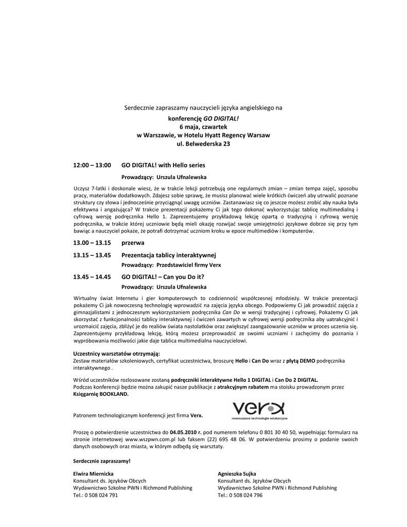 Serdecznie zapraszamy nauczycieli języka angielskiego na konferencję GO DIGITAL! 6 maja, czwartek w Warszawie, w Hotelu Hyatt Regency Warsaw ul. Belwederska 23 12:00 – 13:00 GO DIGITAL! with Hello series Prowadzący: Urszula Ufnalewska Uczysz 7-latki i doskonale wiesz, że w trakcie lekcji potrzebują one regularnych zmian – zmian tempa zajęć, sposobu pracy, materiałów dodatkowych. Zdajesz sobie sprawę, że musisz planować wiele krótkich ćwiczeń aby utrwalić poznane struktury czy słowa i jednocześnie przyciągnąć uwagę uczniów. Zastanawiasz się co jeszcze możesz zrobić aby nauka była efektywna i angażująca? W trakcie prezentacji pokażemy Ci jak tego dokonać wykorzystując tablicę multimedialną i cyfrową wersję podręcznika Hello 1. Zaprezentujemy przykładową lekcję opartą o tradycyjną i cyfrową wersję podręcznika, w trakcie której uczniowie będą mieli okazję rozwijać swoje umiejętności językowe dobrze się przy tym bawiąc a nauczyciel pokaże, że potrafi dotrzymać uczniom kroku w epoce multimediów i komputerów. 13.00 – 13.15 przerwa 13.15 – 13.45 Prezentacja tablicy interaktywnej Prowadzący: Przedstawiciel firmy Verx 13.45 – 14.45 GO DIGITAL! – Can you Do it? Prowadzący: Urszula Ufnalewska Wirtualny świat Internetu i gier komputerowych to codzienność współczesnej młodzieży. W trakcie prezentacji pokażemy Ci jak nowoczesną technologię wprowadzić na zajęcia języka obcego. Podpowiemy Ci jak prowadzić zajęcia z gimnazjalistami z jednoczesnym wykorzystaniem podręcznika Can Do w wersji tradycyjnej i cyfrowej. Pokażemy Ci jak skorzystać z funkcjonalności tablicy interaktywnej i ćwiczeń zawartych w cyfrowej wersji podręcznika aby uatrakcyjnić i urozmaicić zajęcia, zbliżyć je do realiów świata nastolatków oraz zwiększyć zaangażowanie uczniów w proces uczenia się. Zaprezentujemy przykładową lekcję, którą możesz przeprowadzić ze swoimi uczniami i zachęcimy do poznania i wypróbowania możliwości jakie daje tablica multimedialna nauczycielowi. Uczestnicy warsztatów otrzymają: Zestaw materiałów szkoleniowych, certyfikat uczestnictwa, broszurę Hello i Can Do wraz z płytą DEMO podręcznika interaktywnego . Wśród uczestników rozlosowane zostaną podręczniki interaktywne Hello 1 DIGITAL i Can Do 2 DIGITAL. Podczas konferencji będzie można zakupić nasze publikacje z atrakcyjnym rabatem ma stoisku prowadzonym przez Księgarnię BOOKLAND. Patronem technologicznym konferencji jest firma Verx. Proszę o potwierdzenie uczestnictwa do 04.05.2010 r. pod numerem telefonu 0 801 30 40 50, wypełniając formularz na stronie internetowej www.wszpwn.com.pl lub faksem (22) 695 48 06. W potwierdzeniu prosimy o podanie swoich danych osobowych oraz miasta, w którym odbędą się warsztaty. Serdecznie zapraszamy! Elwira Miernicka Konsultant ds. Języków Obcych Wydawnictwo Szkolne PWN i Richmond Publishing Tel.: 0 508 024 791 Agnieszka Sujka Konsultant ds. Języków Obcych Wydawnictwo Szkolne PWN i Richmond Publishing Tel.: 0 508 024 796