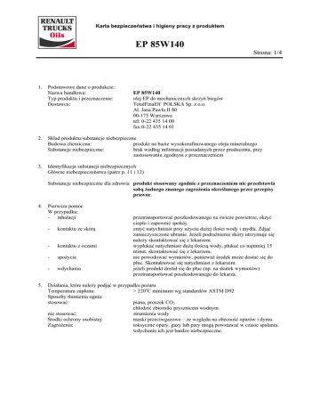Karta bezpieczeństwa i higieny pracy z produktem EP 85W140 Strona: 1/4 1. Podstawowe dane o produkcie: Nazwa handlowa: Typ produktu i przeznaczenie: Dostawca: EP 85W140 olej EP do mechanicznych skrzyń biegów TotalFinaElf POLSKA Sp. z o.o. Al. Jana Pawła II 80 00-175 Warszawa tel: 0-22 435 14 00 fax:0-22 435 14 01 2. Skład produktu/substancje niebezpieczne Budowa chemiczna: produkt na bazie wysokorafinowanego oleju mineralnego Substancje niebezpieczne: brak według informacji posiadanych przez producenta, przy zastosowaniu zgodnym z przeznaczeniem 3. Identyfikacja substancji niebezpiecznych Główne niebezpieczeństwa (patrz p. 11 i 12) Substancje niebezpieczne dla zdrowia produkt stosowany zgodnie z przeznaczeniem nie przedstawia sobą żadnego znanego zagrożenia określanego przez przepisy prawne. 4. 5. Pierwsza pomoc W przypadku: - inhalacji - kontaktu ze skórą - kontaktu z oczami - spożycia - wdychania przetransportować poszkodowanego na świeże powietrze, okryć ciepło i zapewnić spokój. zmyć natychmiast przy użyciu dużej ilości wody i mydła. Zdjąć zanieczyszczone ubranie. Jeżeli podrażnienie skóry utrzymuje się należy skontaktować się z lekarzem. wypłukać natychmiast dużą ilością wody, płukać co najmniej 15 minut, skontaktować się z lekarzem. nie powodować wymiotów, ponieważ środek może dostać się do płuc. Skontaktować się natychmiast z lekarzem. jeżeli produkt dostał się do płuc (np. na skutek wymiotów) przetransportować poszkodowanego do lekarza. Działania, które należy podjąć w przypadku pożaru Temperatura zapłonu: > 220oC minimum wg standardów ASTM D92 Sposoby tłumienia ognia: stosować: piana, proszek CO2 chłodzić zbiorniki prysznicem wodnym nie stosować: strumienia wody Środki ochrony osobistej: maski przeciwgazowe – ze względu na obecność oparów i dymu. Zagrożenia: toksyczne opary, gazy lub pary mogą powstawać w czasie spalania. wdychanie ich jest bardzo niebezpieczne. Karta bezpieczeństwa i higieny pracy z produktem EP 85W140 Strona: 2/4 6. Działania, które muszą być podjęte w razie przypadkowego rozlania produktu Środki ochrony osobistej: ze względu na ryzyko kontaktu, należy nosić odpowiednią odzież ochronną (p. 8). Ochrona środowiska instalacje należy projektować i konserwować tak, aby uniknąć możliwości zanieczyszczenia wody i gleby. zabezpieczyć odpowiednio spusty cieczy tak, aby uniknąć możliwości zanieczyszczenia wody i gleby. w przypadku przecieku lub rozlania zawiadomić odpowiednie służby w celu podjęcia skoordynowanej akcji ratunkowej Zbieranie rozlanej cieczy Przechowywanie rozlanej cieczy 7. Przechowywanie produktu Operacje z produktem - zabezpieczenie personelu - zabezpieczenie przed pożarem Zalecenia Składowanie - zalecenia - unikać Opakowania - zalecenia zastosować środki mechaniczne (pompy skimery) do zbierania rozlanej cieczy; pozostałość zaabsorbować przy pomocy obojętnych materiałów (piasek). Nie usuwać do ścieków. w szczelnie zamkniętych zbiornikach. zapewnić odpowiednią wentylację pomieszczeń jeżeli występuje ryzyko powstania oparów, mgieł lub aerozoli. podjąć wszelkie działania mające na celu zmniejszenie kontaktu z produktem, składować produkt z daleka od materiałów palnych i utleniaczy, źródeł iskier (stosować nie iskrzące narzędzia). Nie składować w pobliżu żywności. puste opakowania mogą zawierać palne lub potencjalnie wybuchowe opary. materiały nasączone produktem (papier, szmaty) są palne. Nie gromadzić ich. Usuwać natychmiast po użyciu. w celu zmniejszenia zagrożenia projektować instalacje tak, aby uniknąć: - przypadkowego rozlania produktu na gorące powierzchnie, a także źródła energii elektrycznej. - przecieków oleju z układów ciśnieniowych – co może powodować powstanie palnych strumieni z drobnych kropelek (najniższa graniczna wartość palności mgły olejowej wynosi 45g/m3). kontenery otwierać w dobrze wietrzonych pomieszczeniach. zdjąć natychmiast zanieczyszczone ubranie, uprać je przed ponownym użyciem. nie wycierać rąk szmatami zanieczyszczonymi produktem. nie jeść i nie pić w czasie pracy z produktem. nie wdychać oparów, mgły, pary. stosować wyłącznie pojemniki, przewody, itp., odporne na działanie węglowodorów. przechowywać z daleka od wody, wilgotności i źródeł ognia. przechowywać zamknięte kontenery. projektować instalacje tak, aby uniknąć możliwości skażenia wód i gleby. składowania w miejscach, w których może nastąpić skażenie wód. niebezpieczne reakcje z utleniaczami stosować wyłącznie pojemniki, przewody, itp., odporne na działanie węglowodorów. stosować wyłącznie oryginalne opakowania. 8. Parametry kontrolne/środki ochrony osobistej Karta bezpieczeństwa i higieny pracy z produktem EP 85W140 Strona: 3/4 użytkować produkt wyłącznie w dobrze wietrzonych pomieszczeniach Pomiary - wielkości graniczne Środki ochrony osobistej ręce: oczy: skóra: 9. Właściwości fizyko-chemiczne Stan skupienia Zapach: pH: Temperatura topnienia Temperatura zapłonu Temperatura samozapłonu: Wybuchowość: Gęstość: Rozpuszczalność: Lepkość kinematyczna: 10. Stabilność i reakcyjność Stabilność Niebezpieczne reakcje - unikać: Niebezpieczne produkty rozkładu 11. Informacje toksykologiczne Ostra toksykologiczność Lokalne działanie - wdychanie: - skóra: Przedłużony lub chroniczny kontakt - wdychanie: graniczne stężenie mgły olejowej (LEV): 10 mg/m3, przebywanie przez 15 min. średnia wartość stężenia mgły olejowej (MEV): 5 mg/ m3, przebywanie przez 8 godzin rękawiczki nieprzepuszczalne i odporne na węglowodory gogle w razie wystąpienia ryzyka rozbryzgów w zależności od potrzeb: ekran, nieprzemakalna odzież odporna na działanie węglowodorów, odpowiednie buty. Nie nosić pierścionków, zegarków, itp., mogą one powodować pozostawanie produktu na skórze, a w efekcie jej podrażnienie. Unika