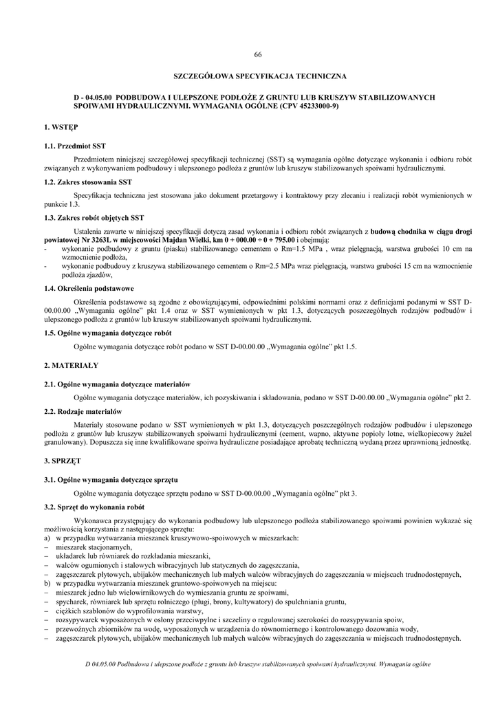 66 SZCZEGÓŁOWA SPECYFIKACJA TECHNICZNA D - 04.05.00 PODBUDOWA I ULEPSZONE PODŁOśE Z GRUNTU LUB KRUSZYW STABILIZOWANYCH SPOIWAMI HYDRAULICZNYMI. WYMAGANIA OGÓLNE (CPV 45233000-9) 1. WSTĘP 1.1. Przedmiot SST Przedmiotem niniejszej szczegółowej specyfikacji technicznej (SST) są wymagania ogólne dotyczące wykonania i odbioru robót związanych z wykonywaniem podbudowy i ulepszonego podłoŜa z gruntów lub kruszyw stabilizowanych spoiwami hydraulicznymi. 1.2. Zakres stosowania SST Specyfikacja techniczna jest stosowana jako dokument przetargowy i kontraktowy przy zlecaniu i realizacji robót wymienionych w punkcie 1.3. 1.3. Zakres robót objętych SST Ustalenia zawarte w niniejszej specyfikacji dotyczą zasad wykonania i odbioru robót związanych z budową chodnika w ciągu drogi powiatowej Nr 3263L w miejscowości Majdan Wielki, km 0 + 000.00 ÷ 0 + 795.00 i obejmują: wykonanie podbudowy z gruntu (piasku) stabilizowanego cementem o Rm=1.5 MPa , wraz pielęgnacją, warstwa grubości 10 cm na wzmocnienie podłoŜa, wykonanie podbudowy z kruszywa stabilizowanego cementem o Rm=2.5 MPa wraz pielęgnacją, warstwa grubości 15 cm na wzmocnienie podłoŜa zjazdów, 1.4. Określenia podstawowe Określenia podstawowe są zgodne z obowiązującymi, odpowiednimi polskimi normami oraz z definicjami podanymi w SST D00.00.00 „Wymagania ogólne” pkt 1.4 oraz w SST wymienionych w pkt 1.3, dotyczących poszczególnych rodzajów podbudów i ulepszonego podłoŜa z gruntów lub kruszyw stabilizowanych spoiwami hydraulicznymi. 1.5. Ogólne wymagania dotyczące robót Ogólne wymagania dotyczące robót podano w SST D-00.00.00 „Wymagania ogólne” pkt 1.5. 2. MATERIAŁY 2.1. Ogólne wymagania dotyczące materiałów Ogólne wymagania dotyczące materiałów, ich pozyskiwania i składowania, podano w SST D-00.00.00 „Wymagania ogólne” pkt 2. 2.2. Rodzaje materiałów Materiały stosowane podano w SST wymienionych w pkt 1.3, dotyczących poszczególnych rodzajów podbudów i ulepszonego podłoŜa z gruntów lub kruszyw stabilizowanych spoiwami hydraulicznymi (cement, wapno, aktywne popioły lotne, wielkopiecowy ŜuŜel granulowany). Dopuszcza się inne kwalifikowane spoiwa hydrauliczne posiadające aprobatę techniczną wydaną przez uprawnioną jednostkę. 3. SPRZĘT 3.1. Ogólne wymagania dotyczące sprzętu Ogólne wymagania dotyczące sprzętu podano w SST D-00.00.00 „Wymagania ogólne” pkt 3. 3.2. Sprzęt do wykonania robót Wykonawca przystępujący do wykonania podbudowy lub ulepszonego podłoŜa stabilizowanego spoiwami powinien wykazać się moŜliwością korzystania z następującego sprzętu: a) w przypadku wytwarzania mieszanek kruszywowo-spoiwowych w mieszarkach: − mieszarek stacjonarnych, − układarek lub równiarek do rozkładania mieszanki, − walców ogumionych i stalowych wibracyjnych lub statycznych do zagęszczania, − zagęszczarek płytowych, ubijaków mechanicznych lub małych walców wibracyjnych do zagęszczania w miejscach trudnodostępnych, b) w przypadku wytwarzania mieszanek gruntowo-spoiwowych na miejscu: − mieszarek jedno lub wielowirnikowych do wymieszania gruntu ze spoiwami, − spycharek, równiarek lub sprzętu rolniczego (pługi, brony, kultywatory) do spulchniania gruntu, − cięŜkich szablonów do wyprofilowania warstwy, − rozsypywarek wyposaŜonych w osłony przeciwpylne i szczeliny o regulowanej szerokości do rozsypywania spoiw, − przewoźnych zbiorników na wodę, wyposaŜonych w urządzenia do równomiernego i kontrolowanego dozowania wody, − zagęszczarek płytowych, ubijaków mechanicznych lub małych walców wibracyjnych do zagęszczania w miejscach trudnodostępnych. D 04.05.00 Podbudowa i ulepszone podłoŜe z gruntu lub kruszyw stabilizowanych spoiwami hydraulicznymi. Wymagania ogólne 67 4. TRANSPORT 4.1. Ogólne wymagania dotyczące transportu Ogólne wymagania dotyczące transportu podano w SST D-00.00.00 „Wymagania ogólne” pkt 4. 4.2. Transport materiałów Transport cementu powinien odbywać się zgodnie z BN-88/6731-08 [19]. Transport wapna powinien odbywać się zgodnie z PN-B-30020 [12]. Transport popiołów lotnych powinien odbywać się zgodnie z PN-S-96035 [18]. śuŜel wielkopiecowy granulowany moŜna przewozić dowolnymi środkami transportu w sposób zabezpieczony przed zanieczyszczeniem i zawilgoceniem. Mieszankę kruszywowo-spoiwową moŜna przewozić dowolnymi środkami transportu, w sposób zabezpieczony przed zanieczyszczeniem, rozsegregowaniem i wysuszeniem lub nadmiernym zawilgoceniem. 5. WYKONANIE ROBÓT 5.1. Ogólne zasady wykonania robót Ogólne zasady wykonania robót podano w SST D-00.00.00 „Wymagania ogólne” pkt 5. 5.2. Przygotowanie podłoŜa PodłoŜe gruntowe powinno być przygotowane zgodnie z wymaganiami określonymi w SST D-04.01.01 „Koryto wraz z profilowaniem i zagęszczeniem podłoŜa” i SST D-02.00.00 „Roboty ziemne”. Paliki lub szpilki do prawidłowego ukształtowania podbudowy i ulepszonego podłoŜa powinny być wcześniej przygotowane. Paliki lub szpilki powinny być ustawione w osi drogi i w rzędach równoległych do osi drogi, lub w inny sposób zaakceptowany przez InŜyniera. Rozmieszczenie palików lub szpilek powinno umoŜliwiać naciągnięcie sznurków lub linek do wytyczenia robót w odstępach nie większych niŜ co 10 m. JeŜeli warstwa mieszanki gruntu lub kruszywa ze spoiwami hydraulicznymi ma być układana w prowadnicach, to po wytyczeniu podbudowy naleŜy ustawić na podłoŜu prowadnice w taki sposób, aby wyznaczały one ściśle linie krawędzi układanej warstwy według dokumentacji projektowej. Wysokość prowadnic powinna odpowiadać grubości warstwy mieszanki gruntu lub kruszywa ze spoiwami hydraulicznymi, w stanie niezagęszczonym. Prowadnice powinny być ustawione stabilnie, w sposób wykluczający ich przesuwanie się pod wpływem oddziaływania maszyn uŜytych do wykonania warstwy. 5.3. Odcinek próbny JeŜeli w SST przewidziano konie